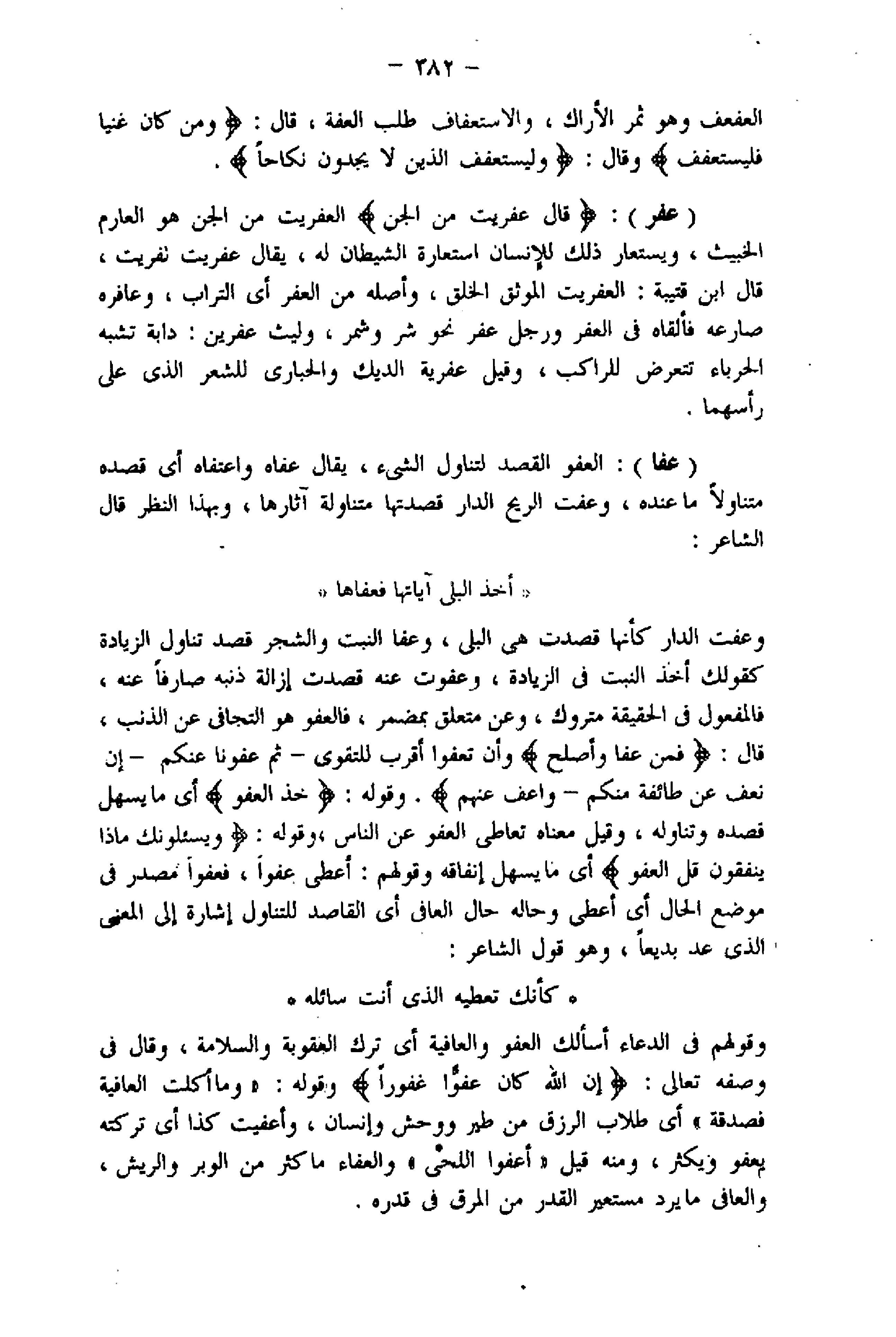 وعفت الدار كأنها قصدت هى البلى، وعفا النبت والشجر قصد تناول الزيادة كقولك أخذ النبت فى الزيادة، وعفوت عنه قصدت إزالة ذنبه صارفا عنه، فالمفعول فى الحقيقة متروك، وعن متعلق بمضمر، فالعفو هو التجافي عن الذنب، قال: فَمَنْ عَفا وَأَصْلَحَ وَأَنْ تَعْفُوا أَقْرَبُ لِلتَّقْوى - ثُمَّ عَفَوْنا عَنْكُمْ- إِنْ نَعْفُ عَنْ طائِفَةٍ مِنْكُمْ- وَاعْفُ عَنَّا. وقوله: خُذِ الْعَفْوَ أي ما يسهل قصده وتناوله، وقيل معناه تعاطى العفو عن الناس، وقوله: وَيَسْئَلُونَكَ ماذا يُنْفِقُونَ قُلِ الْعَفْوَ أي ما يسهل إنفاقه وقولهم: أعطى عفوا، فعفوا مصدر فى موضع الحال أي أعطى وحاله حال العافي أي القاصد للتناول إشارة إلى المعنى الذي عد بديعا، وهو قول الشاعر: