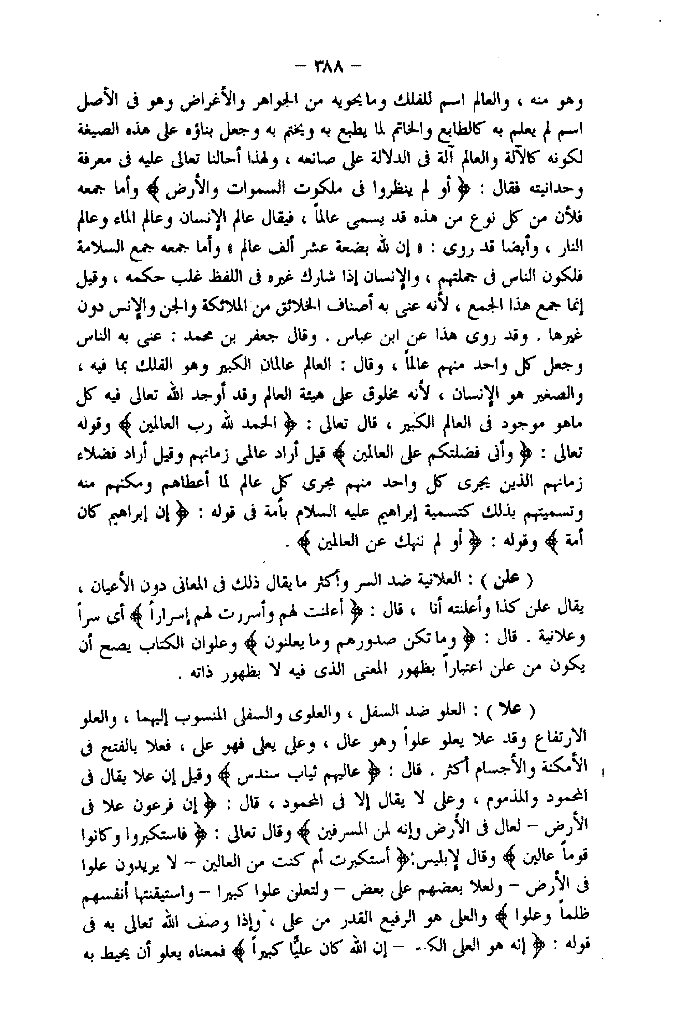 (علا) : العلو ضد السفل، والعلوي والسفلى المنسوب إليهما، والعلو الارتفاع وقد علا يعلو علوا وهو عال، وعلى يعلى فهو على، فعلا بالفتح فى الأمكنة والأجسام أكثر. قال: عالِيَهُمْ ثِيابُ سُندُسٍ وقيل إن علا يقال فى المحمود والمذموم، وعلى لا يقال إلا فى المحمود، قال: إِنَّ فِرْعَوْنَ عَلا فِي الْأَرْضِ- لَعالٍ فِي الْأَرْضِ وَإِنَّهُ لَمِنَ الْمُسْرِفِينَ وقال تعالى: فَاسْتَكْبَرُوا وَكانُوا قَوْماً عالِينَ وقال لإبليس: أَسْتَكْبَرْتَ أَمْ كُنْتَ مِنَ الْعالِينَ- لا يُرِيدُونَ عُلُوًّا فِي الْأَرْضِ- وَلَعَلا بَعْضُهُمْ عَلى بَعْضٍ- وَلَتَعْلُنَّ عُلُوًّا كَبِيراً- وَاسْتَيْقَنَتْها أَنْفُسُهُمْ ظُلْماً وَعُلُوًّا والعلى هو الرفيع القدر من على، وإذا وصف اللَّه تعالى به فى قوله: أَنَّ اللَّهَ هُوَ الْعَلِيُّ الْكَبِيرُ- إِنَّ اللَّهَ كانَ عَلِيًّا كَبِيراً فمعناه يعلو أن يحيط به