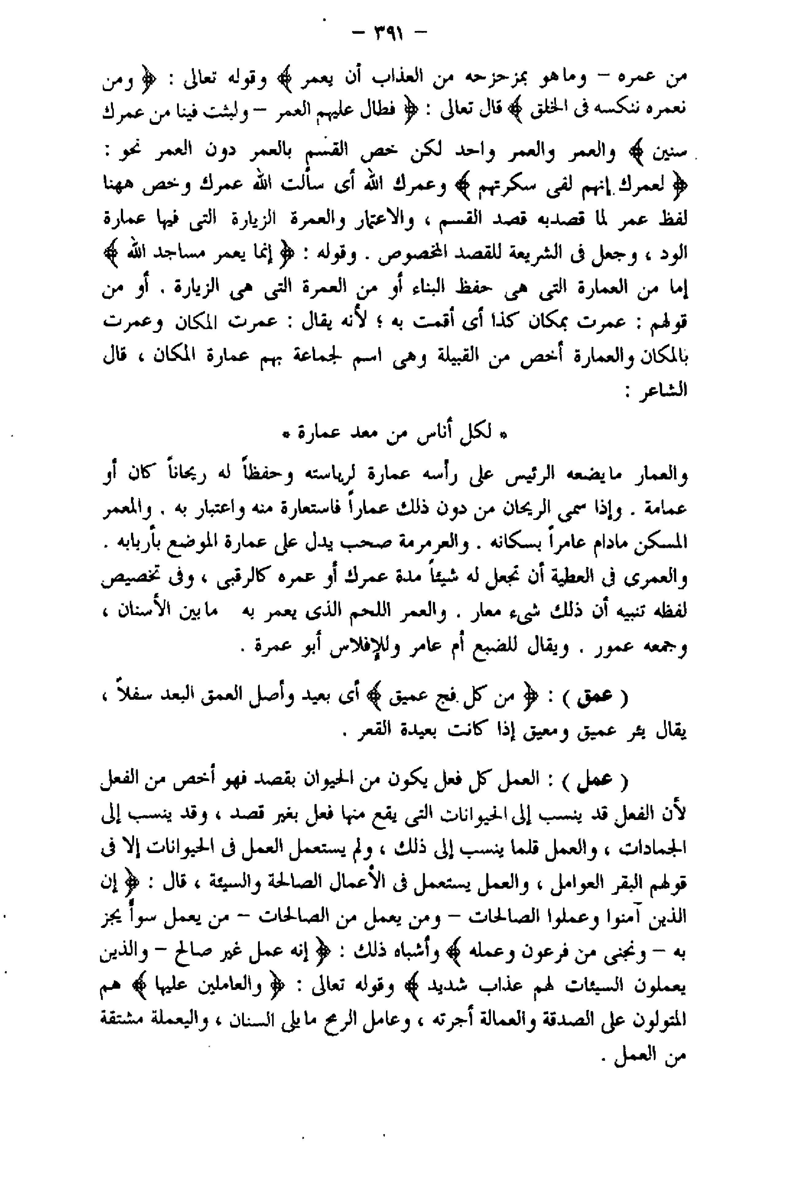 (عمر) : العمل كل فعل يكون من الحيوان بقصد فهو أخص من الفعل لأن الفعل قد ينسب إلى الحيوانات التي يقع منها فعل بغير قصد، وقد ينسب إلى الجمادات، والعمل قلما ينسب إلى ذلك، ولم يستعمل العمل فى الحيوانات إلا فى قولهم البقر العوامل، والعمل يستعمل فى الأعمال الصالحة والسيئة، قال: إِنَّ الَّذِينَ آمَنُوا وَعَمِلُوا الصَّالِحاتِ- وَمَنْ يَعْمَلْ مِنَ الصَّالِحاتِ- مَنْ يَعْمَلْ سُوءاً يُجْزَ بِهِ- وَنَجِّنِي مِنْ فِرْعَوْنَ وَعَمَلِهِ وأشباه ذلك: إِنَّهُ عَمَلٌ غَيْرُ صالِحٍ- وَالَّذِينَ يَمْكُرُونَ السَّيِّئاتِ لَهُمْ عَذابٌ شَدِيدٌ وقوله تعالى: وَالْعامِلِينَ عَلَيْها هم المتولون على الصدقة والعمالة أجرته، وعامل الرمح ما يلى السنان، واليعملة مشتقة من العمل.