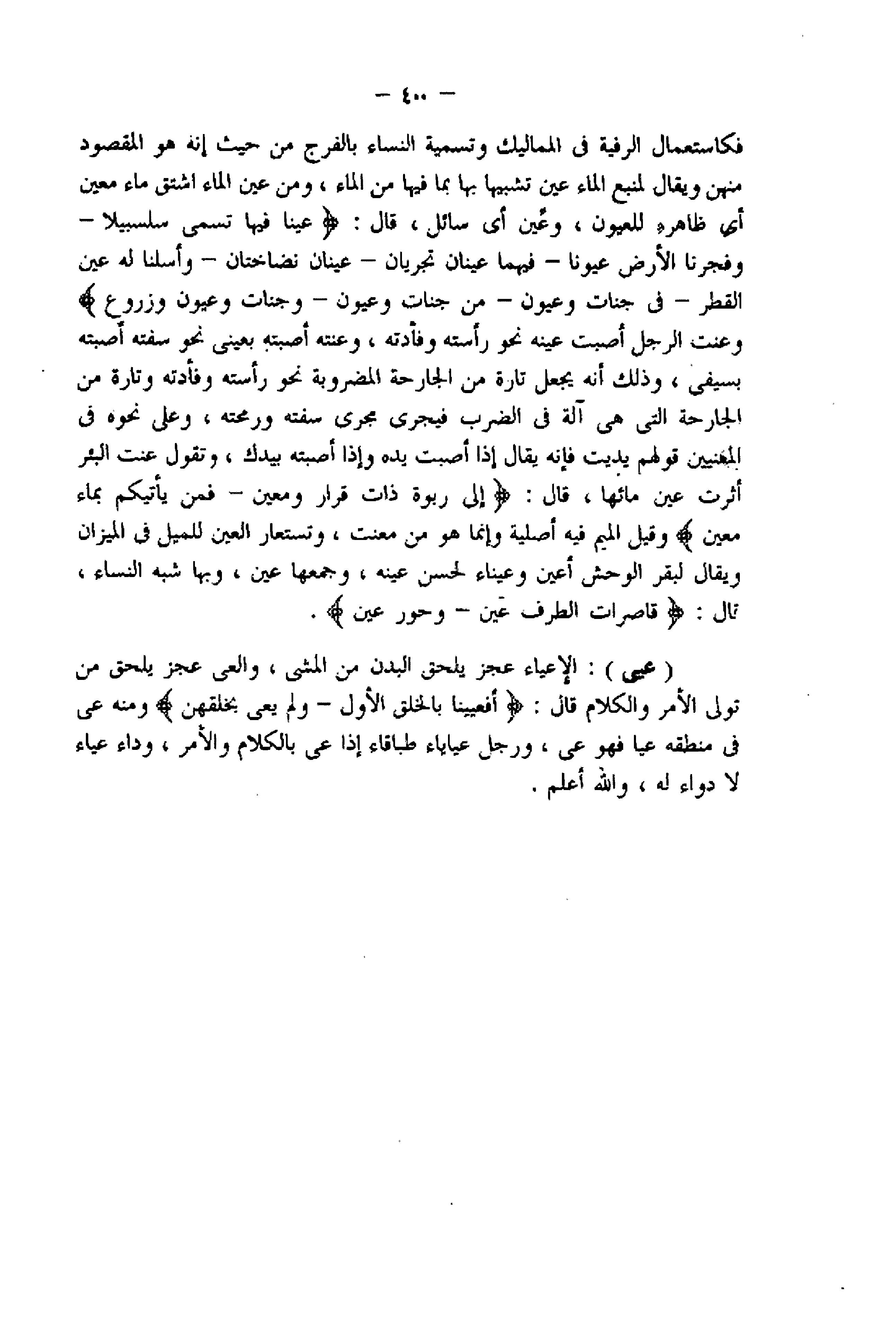فكاستعمال الرقية فى المماليك وتسمية النساء بالفرج من حيث إنه هو المقصود منهن ويقال لمنبع الماء عين تشبيها بها بما فيها من الماء، ومن عين الماء اشتق ماء معين أي ظاهر للعيون، وعين أي سائل، قال: عَيْناً فِيها تُسَمَّى سَلْسَبِيلًا- وَفَجَّرْنَا الْأَرْضَ عُيُوناً- فِيهِما عَيْنانِ تَجْرِيانِ-يْنانِ نَضَّاخَتانِ
