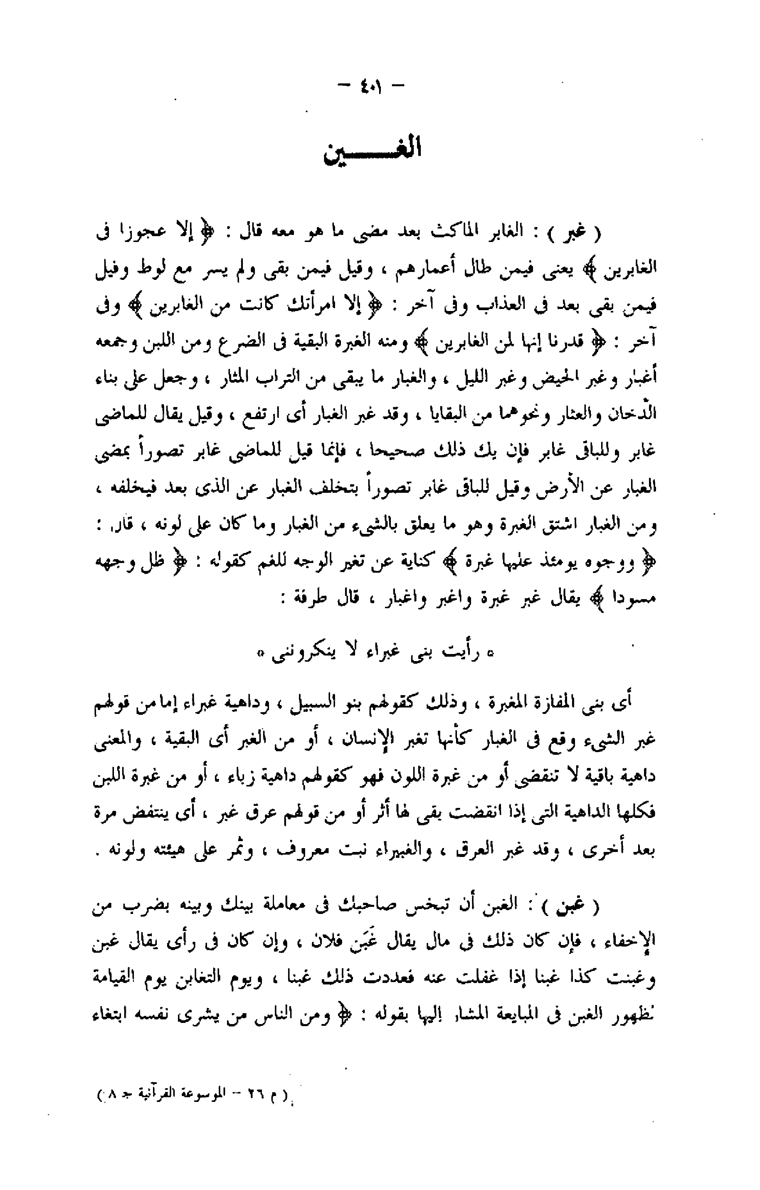 (غبر) : الغابر الماكث بعد مضى ما هو معه قال: إِلَّا عَجُوزاً فِي الْغابِرِينَ يعنى فيمن طال أعمارهم، وقيل فيمن بقي ولم يسر مع لوط وفيل فيمن بقي بعد فى العذاب وفى آخر: إِلَّا امْرَأَتَكَ كانَتْ مِنَ الْغابِرِينَ وفى آخر: قَدَّرْنا إِنَّها لَمِنَ الْغابِرِينَ ومنه الغبرة البقية فى الضرع ومن اللبن وجمعه أغبار وغبر الحيض وغبر الليل، والغبار ما يبقى من التراب المثار، وجعل على بناء الدخان والعثار ونحوهما من البقايا، وقد غبر الغبار أي ارتفع، وقيل يقال للماضى غابر وللباقى غابر فإن يك ذلك صحيحا، فإنما قيل للماضى غابر تصورا بمضى الغبار عن الأرض وقيل للباقى غابر تصورا بتخلف الغبار عن الذي بعد فيخلفه، ومن الغبار اشتق الغبرة وهو ما يعلق بالشيء من الغبار وما كان على لونه، قال: