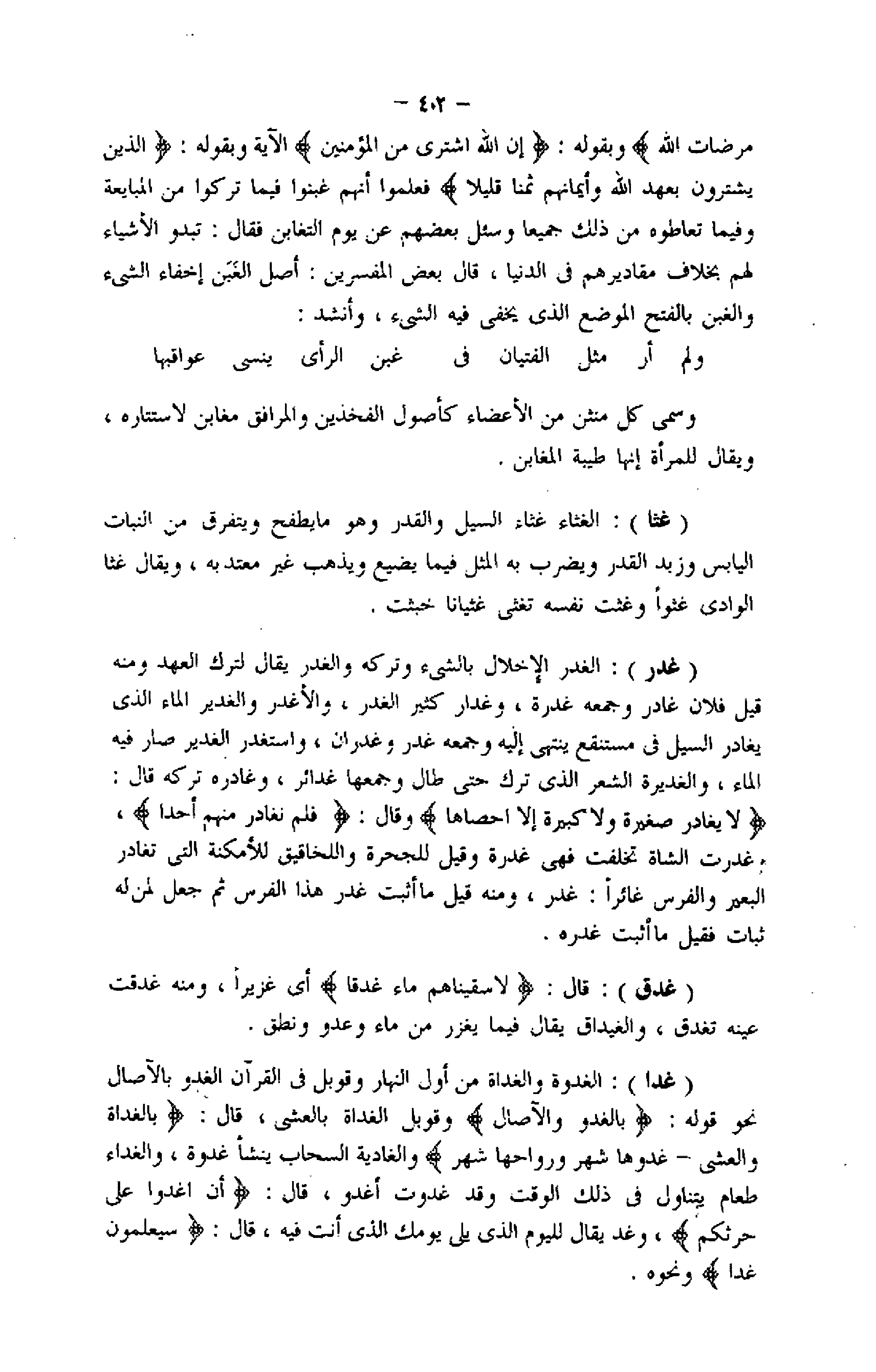 لا يُغادِرُ صَغِيرَةً وَلا كَبِيرَةً إِلَّا أَحْصاها وقال: فَلَمْ نُغادِرْ مِنْهُمْ أَحَداً، وغدرت الشاة تخلفت فهى غدرة وقيل للجحرة واللخاقيق للأمكنة التي تغادر البعير والفرس غائرا: غدر، ومنه قيل ما أثبت غدر هذا الفرس ثم جعل لمن له ثبات فقيل ما أثبت غدره.