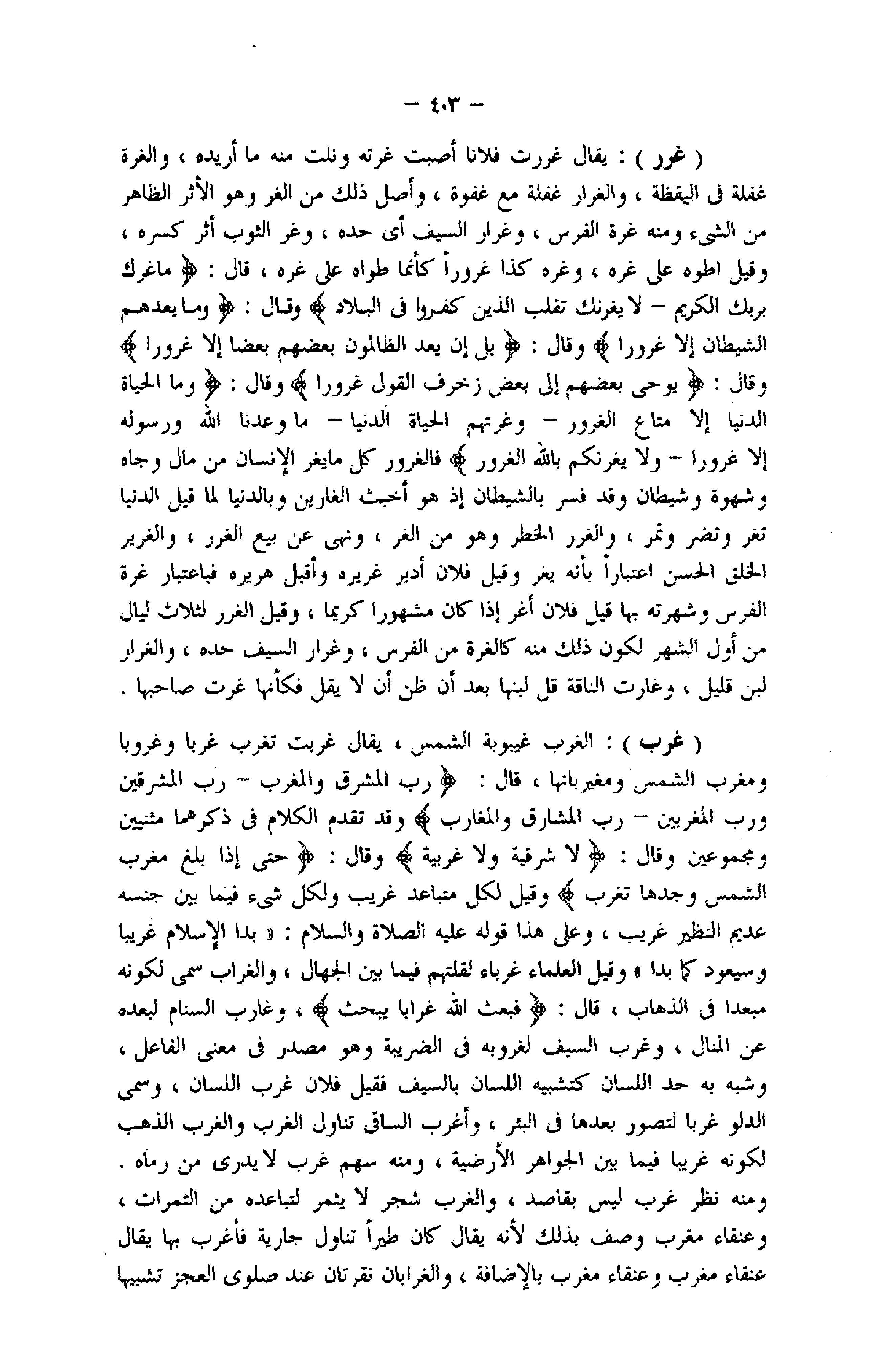 (غرر) : يقال غررت فلانا أصبت غرته ونلت منه ما أريده، والغرة غفلة فى اليقظة، والغرار غفلة مع غفوة، وأصل ذلك من الغر وهو الأثر الظاهر من الشيء ومنه غرة الفرس، وغرار السيف أي حده، وغر الثوب أثر كسره، وقيل اطوه على غره، وغره كذا غرورا كأنما طواه على غره، قال: ما غَرَّكَ بِرَبِّكَ الْكَرِيمِ- لا يَغُرَّنَّكَ تَقَلُّبُ الَّذِينَ كَفَرُوا فِي الْبِلادِ وقال: وَما يَعِدُهُمُ الشَّيْطانُ إِلَّا غُرُوراً وقال: بَلْ إِنْ يَعِدُ الظَّالِمُونَ بَعْضُهُمْ بَعْضاً إِلَّا غُرُوراً وقال: يُوحِي بَعْضُهُمْ إِلى بَعْضٍ زُخْرُفَ الْقَوْلِ غُرُوراً وقال: وَمَا الْحَياةُ الدُّنْيا إِلَّا مَتاعُ الْغُرُورِ- وَغَرَّتْهُمُ الْحَياةُ الدُّنْيا- ما وَعَدَنَا اللَّهُ وَرَسُولُهُ إِلَّا غُرُوراً- وَلا يَغُرَّنَّكُمْ بِاللَّهِ الْغَرُورُ فالغرور كل ما يغر الإنسان من مال وجاه وشهوة وشيطان وقد فسر بالشيطان إذ هو أخبث الغارين وبالدنيا لما قيل الدنيا تغر وتضر وتمر، والغرر الخطر وهو من الغر، ونهى عن بيع الغرر، والغرير الخلق الحسن اعتبارا بأنه يغر وقيل فلان أدبر غريره وأقبل هريره فباعتبار غرة الفرس وشهرته بها قيل فلان أغر إذا كان مشهورا كريما، وقيل الغرر لثلاث ليال من أول الشهر لكون ذلك منه كالغرة من الفرس، وغرار السيف حده، والغرار لبن قليل، وغارت الناقة قل لبنها بعد أن ظن أن لا يقل فكأنها غرت صاحبها.