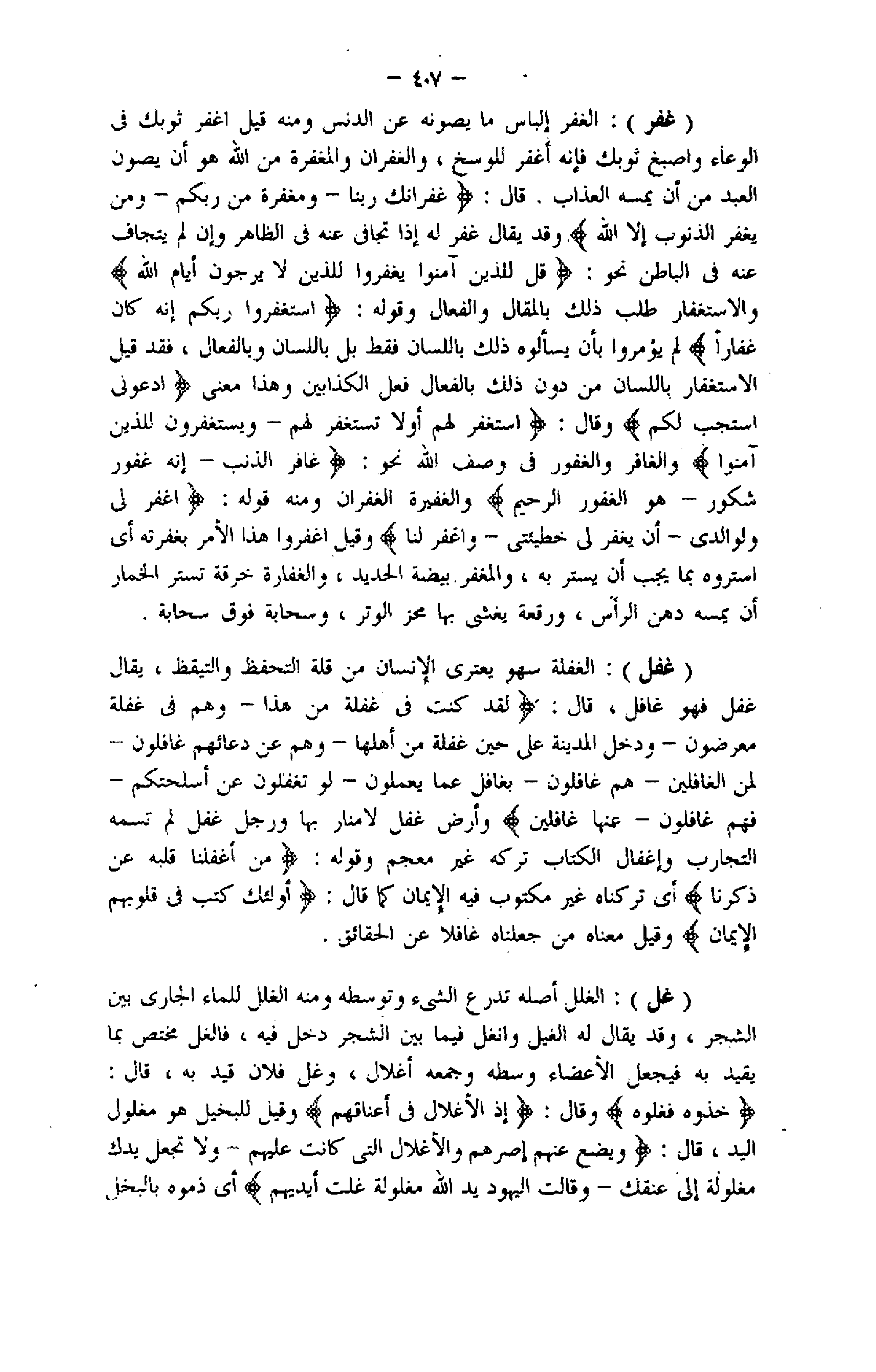 (غفر) : الغفر إلباس ما يصونه عن الدنس ومنه قيل اغفر ثوبك فى الوعاء واصبغ ثوبك فإنه أغفر للوسخ، والغفران والمغفرة من اللَّه هو أن يصون العبد من أن يمسه العذاب. قال: غُفْرانَكَ رَبَّنا- مَغْفِرَةٍ مِنْ رَبِّكُمْ- وَمَنْ يَغْفِرُ الذُّنُوبَ إِلَّا اللَّهُ وقد يقال غفر له إذا تجافى عنه فى الظاهر وإن لم يتجاف عنه فى الباطن نحو: قُلْ لِلَّذِينَ آمَنُوا يَغْفِرُوا لِلَّذِينَ لا يَرْجُونَ أَيَّامَ اللَّهِ والاستغفار طلب ذلك بالمقال والفعال وقوله: اسْتَغْفِرُوا رَبَّكُمْ إِنَّهُ كانَ غَفَّاراً لم يؤمروا بأن يسألوه ذلك باللسان فقط بل باللسان وبالفعال فقد قيل الاستغفار باللسان من دون ذلك بالفعال فعل الكذابين وهذا معنى ادْعُونِي أَسْتَجِبْ لَكُمْ وقال: اسْتَغْفِرْ لَهُمْ أَوْ لا تَسْتَغْفِرْ لَهُمْ- وَيَسْتَغْفِرُونَ لِلَّذِينَ آمَنُوا والغافر والغفور فى وصف اللَّه نحو: غافِرِ الذَّنْبِ- إِنَّهُ غَفُورٌ شَكُورٌ- هُوَ الْغَفُورُ الرَّحِيمُ والغفيرة الغفران ومنه قوله: اغْفِرْ لِي وَلِوالِدَيَّ- أَنْ يَغْفِرَ لِي خَطِيئَتِي- وَاغْفِرْ لَنا وقيل اغفروا هذا الأمر بغفرته أي استروه بما يجب أن يستر به، والمغفر بيضة الحديد، والغفارة خرقة تستر الخمار أن يمسه دهن الرأس، ورقعة يغشى بها محز الوتر، وسحابة فوق سحابة.