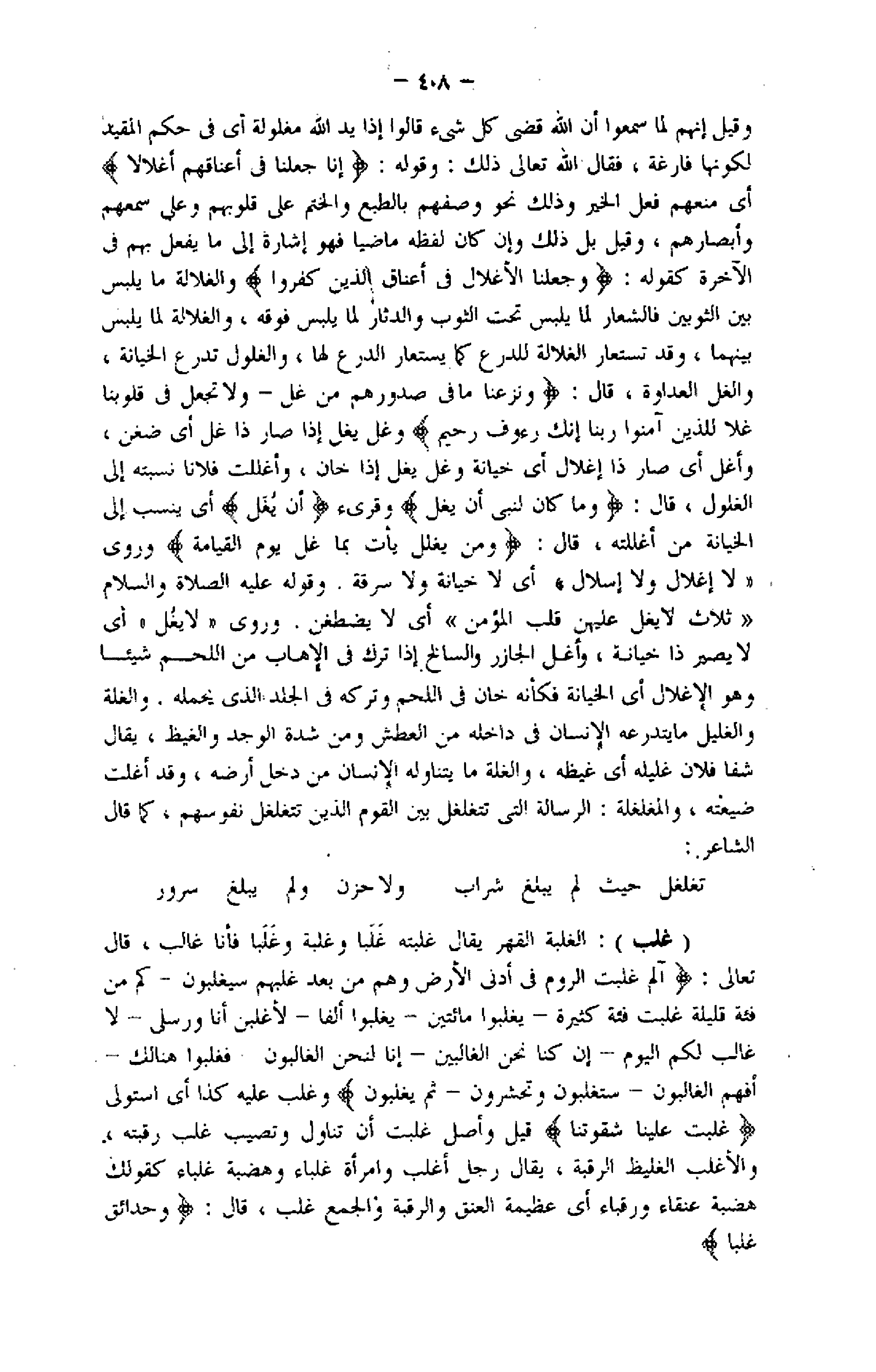 وقيل إنهم لما سمعوا أن اللَّه قضى كل شىء قالوا إذا يد اللَّه مغلولة أي فى حكم المقيد لكونها فارغة، فقال اللَّه تعالى ذلك: وقوله: إِنَّا جَعَلْنا فِي أَعْناقِهِمْ أَغْلالًا أي منعهم فعل الخير وذلك نحو وصفهم بالطبع والختم على قلوبهم وعلى سمعهم وأبصارهم، وقيل بل ذلك وإن كان لفظه ماضيا فهو إشارة إلى ما يفعل بهم فى الآخرة كقوله: وَجَعَلْنَا الْأَغْلالَ فِي أَعْناقِ الَّذِينَ كَفَرُوا والغلالة ما يلبس بين الثوبين فالشعار لما يلبس تحت الثوب والدثار لما يلبس فوقه، والغلالة لما يلبس بينهما، وقد تستعار الغلالة للدرع كما يستعار الدرع لها، والغلول تدرع الخيانة، والغل العداوة، قال: وَنَزَعْنا ما فِي صُدُورِهِمْ مِنْ غِلٍّ- وَلا تَجْعَلْ فِي قُلُوبِنا غِلًّا لِلَّذِينَ آمَنُوا رَبَّنا إِنَّكَ رَؤُفٌ رَحِيمٌ وغل يغل إذا صار ذا غل أي ضغن، وأغل أي صار ذا إغلال أي خيانة وغل يغل إذا خان، وأغللت فلانا نسبته إلى الغلول، قال: وَما كانَ لِنَبِيٍّ أَنْ يَغُلَّ وقرىء أَنْ يَغُلَّ أي ينسب إلى الخيانة من أغللته، قال: وَمَنْ يَغْلُلْ يَأْتِ بِما غَلَّ يَوْمَ الْقِيامَةِ