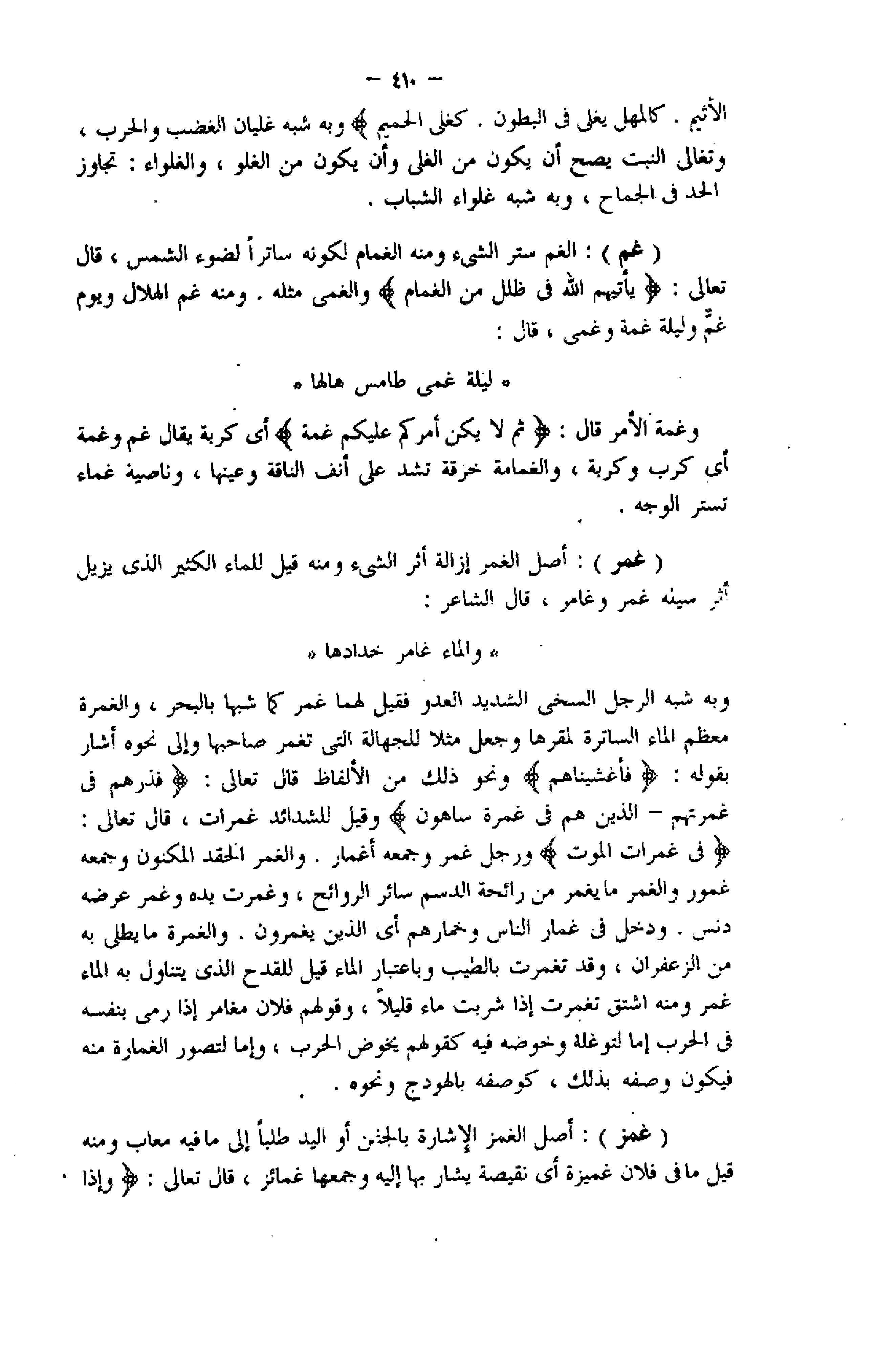 فِي غَمَراتِ الْمَوْتِ ورجل غمر وجمعه أغمار. والغمر الحقد المكنون وجمعه غمور والغمر ما يغمر من رائحة الدسم سائر الروائح، وغمرت يده وغمر عرضه دنس. ودخل فى غمار الناس وخمارهم أي الذين يغمرون. والغمرة ما يطلى به من الزعفران، وقد تغمرت بالطيب وباعتبار الماء قيل للقدح الذي يتناول به الماء غمر ومنه اشتق تغمرت إذا شربت ماء قليلا، وقولهم فلان مغامر إذا رمى بنفسه فى الحرب إما لتوغله وخوضه فيه كقولهم يخوض الحرب، وإما لتصور الغمارة منه فيكون وصفه بذلك، كوصفه بالهودج ونحوه.