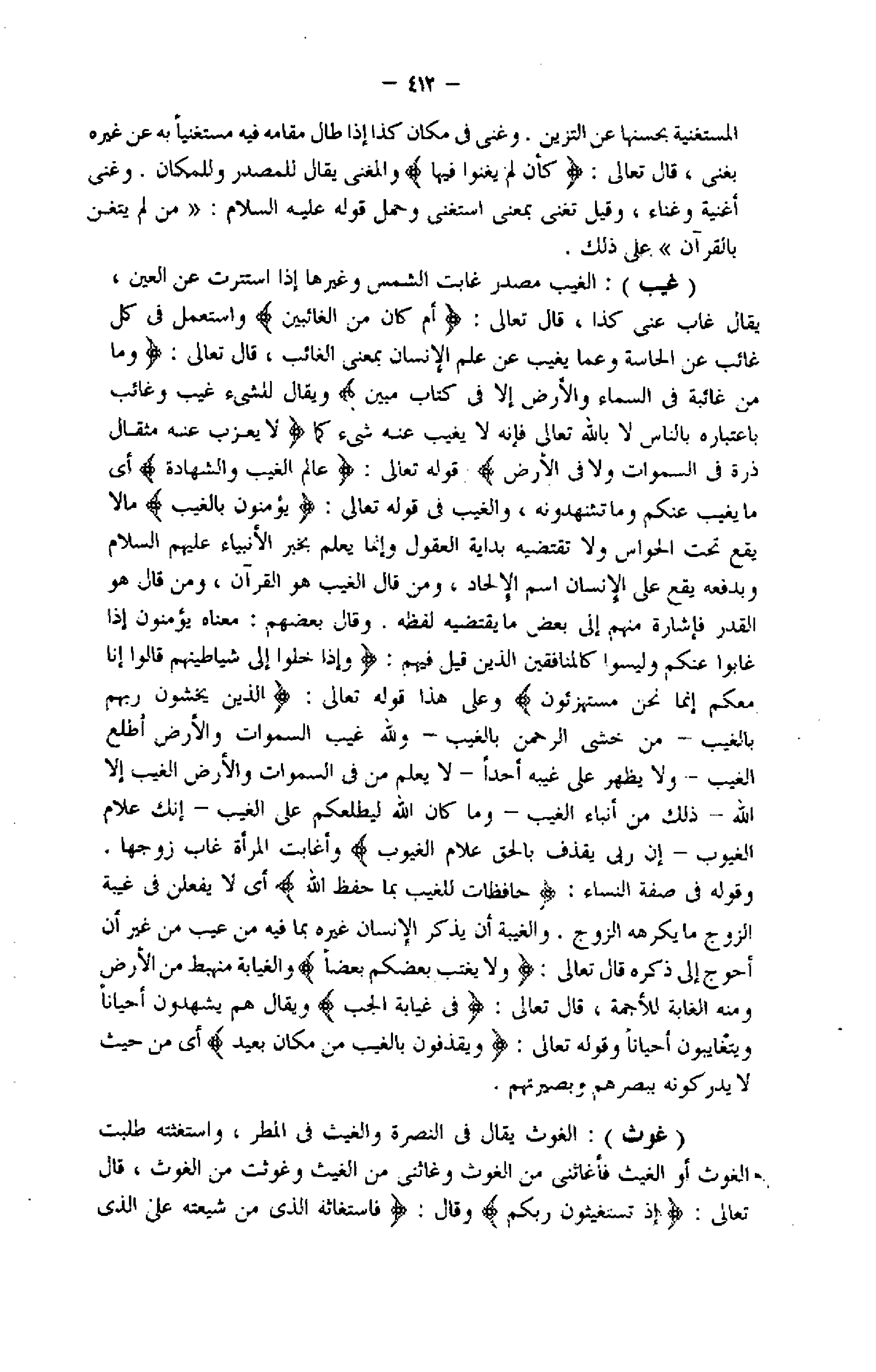 وقوله فى صفة النساء: حافِظاتٌ لِلْغَيْبِ بِما حَفِظَ اللَّهُ أي لا يفعلن فى غيبة الزوج ما يكرهه الزوج. والغيبة أن يذكر الإنسان غيره بما فيه من عيب من غير أن أحوج إلى ذكره قال تعالى: وَلا يَغْتَبْ بَعْضُكُمْ بَعْضاً والغيابة منهبط من الأرض ومنه الغابة للأجمة، قال تعالى: فِي غَيابَتِ الْجُبِّ ويقال هم يشهدون أحيانا ويتغايبون أحيانا وقوله تعالى: وَيَقْذِفُونَ بِالْغَيْبِ مِنْ مَكانٍ بَعِيدٍ أي من حيث لا يدر كونه ببصرهم وبصيرتهم.