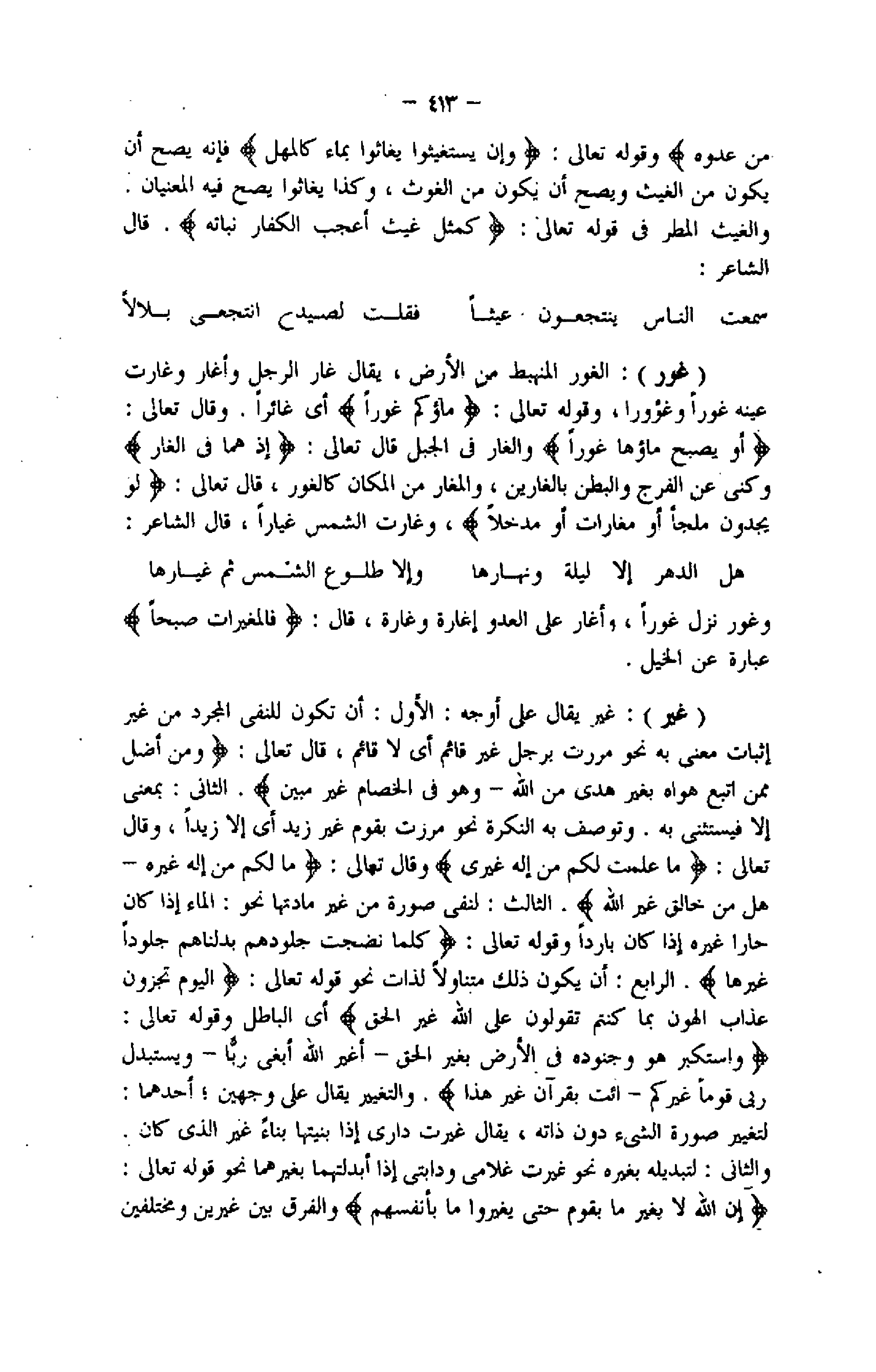 (غير) : غير يقال على أوجه: الأول: أن تكون للنفى المجرد من غير إثبات معنى به نحو مررت برجل غير قائم أي لا قائم، قال تعالى: وَمَنْ أَضَلُّ مِمَّنِ اتَّبَعَ هَواهُ بِغَيْرِ هُدىً مِنَ اللَّهِ- وَهُوَ فِي الْخِصامِ غَيْرُ مُبِينٍ. الثاني: بمعنى إلا فيستثنى به. وتوصف به النكرة نحو مررت بقوم غير زيد أي إلا زيدا، وقال تعالى: ما عَلِمْتُ لَكُمْ مِنْ إِلهٍ غَيْرِي وقال تعالى: ما لَكُمْ مِنْ إِلهٍ غَيْرُهُ- هَلْ مِنْ خالِقٍ غَيْرُ اللَّهِ. الثالث: لنفى صورة من غير مادتها نحو: الماء إذا كان حارا غيره إذا كان باردا وقوله تعالى: كُلَّما نَضِجَتْ جُلُودُهُمْ بَدَّلْناهُمْ جُلُوداً غَيْرَها. الرابع: أن يكون ذلك متناولا لذات نحو قوله تعالى: الْيَوْمَ تُجْزَوْنَ عَذابَ الْهُونِ بِما كُنْتُمْ تَقُولُونَ عَلَى اللَّهِ غَيْرَ الْحَقِّ أي الباطل وقوله تعالى: