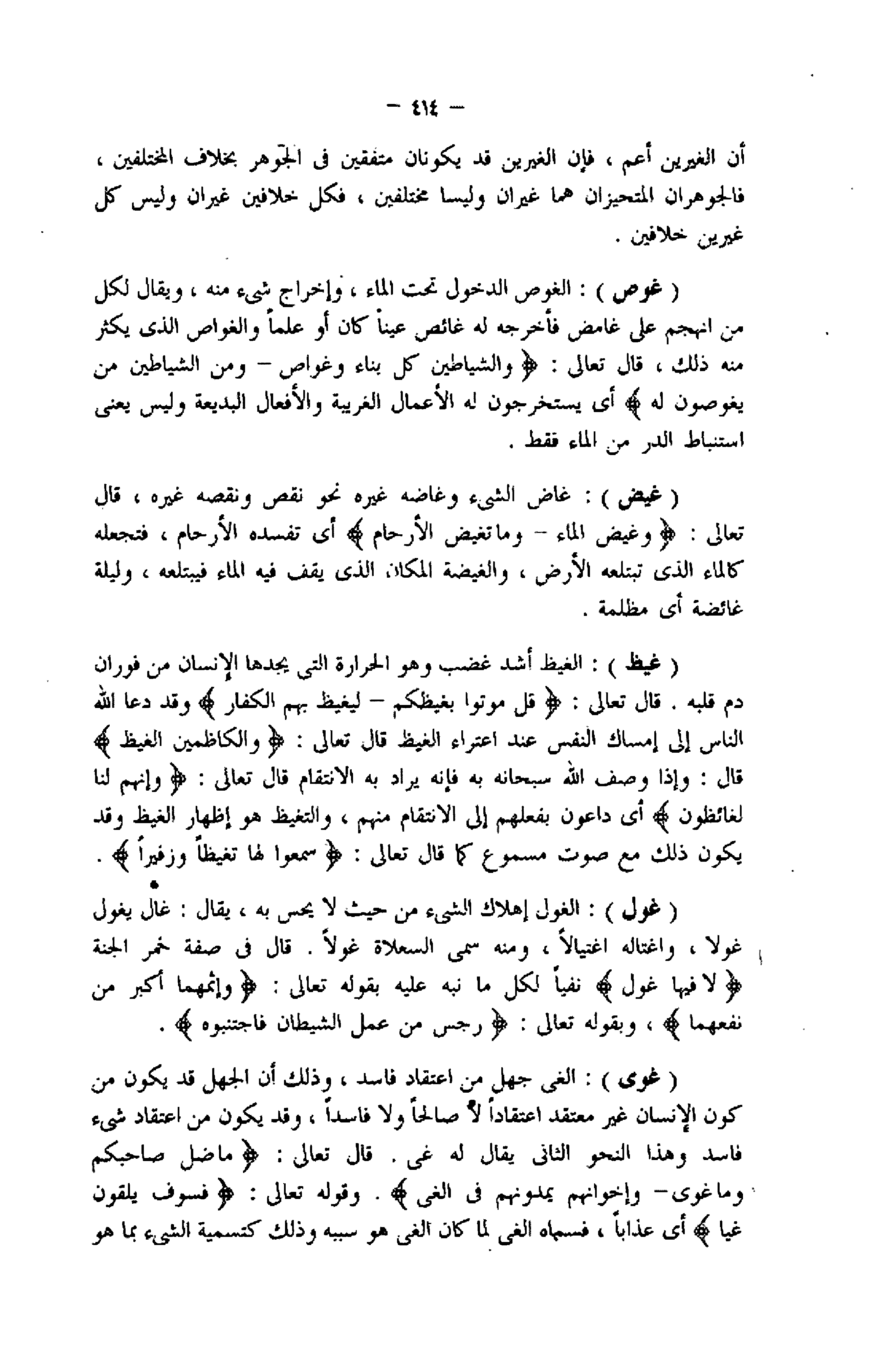 (غوى) : الغى جهل من اعتقاد فاسد، وذلك أن الجهل قد يكون من كون الإنسان غير معتقد اعتقادا لا صالحا ولا فاسدا، وقد يكون من اعتقاد شىء فاسد وهذا النحو الثاني يقال له غى. قال تعالى: ما ضَلَّ صاحِبُكُمْ وَما غَوى - وَإِخْوانُهُمْ يَمُدُّونَهُمْ فِي الغَيِّ. وقوله تعالى: فَسَوْفَ يَلْقَوْنَ غَيًّا أي عذابا، فسماه الغى لما كان الغى هو سببه وذلك كتسمية الشيء بما هو