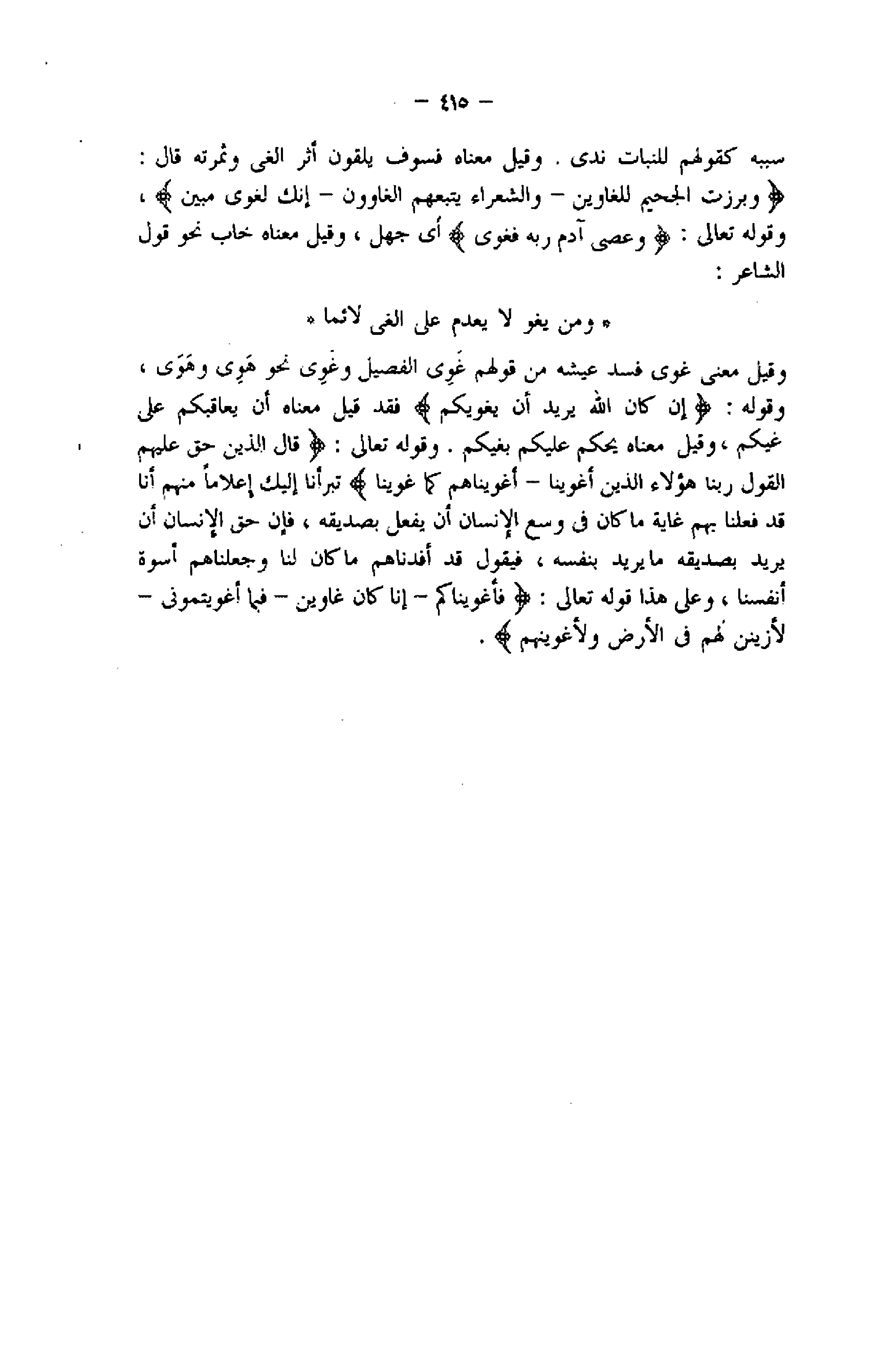 وقيل معنى غوى فسد عيشه من قولهم غوى الفصيل وغوى نحو هوى وهوى، وقوله: إِنْ كانَ اللَّهُ يُرِيدُ أَنْ يُغْوِيَكُمْ فقد قيل معناه أن يعاقبكم على غيكم، وقيل معناه يحكم عليكم بغيكم. وقوله تعالى: قالَ الَّذِينَ حَقَّ عَلَيْهِمُ الْقَوْلُ رَبَّنا هؤُلاءِ الَّذِينَ أَغْوَيْنا- أَغْوَيْناهُمْ كَما غَوَيْنا تبرأنا إليك إعلاما منهم أنا قد فعلنا بهم غاية ما كان فى وسع الإنسان أن يفعل بصديقه، فإن حق الإنسان أن يريد بصديقه ما يريد بنفسه، فيقول قد أفدناهم ما كان لنا وجعلناهم أسوة أنفسنا، وعلى هذا قوله تعالى: فَأَغْوَيْناكُمْ- إِنَّا كُنَّا غاوِينَ- فَبِما أَغْوَيْتَنِي- لَأُزَيِّنَنَّ لَهُمْ فِي الْأَرْضِ وَلَأُغْوِيَنَّهُمْ