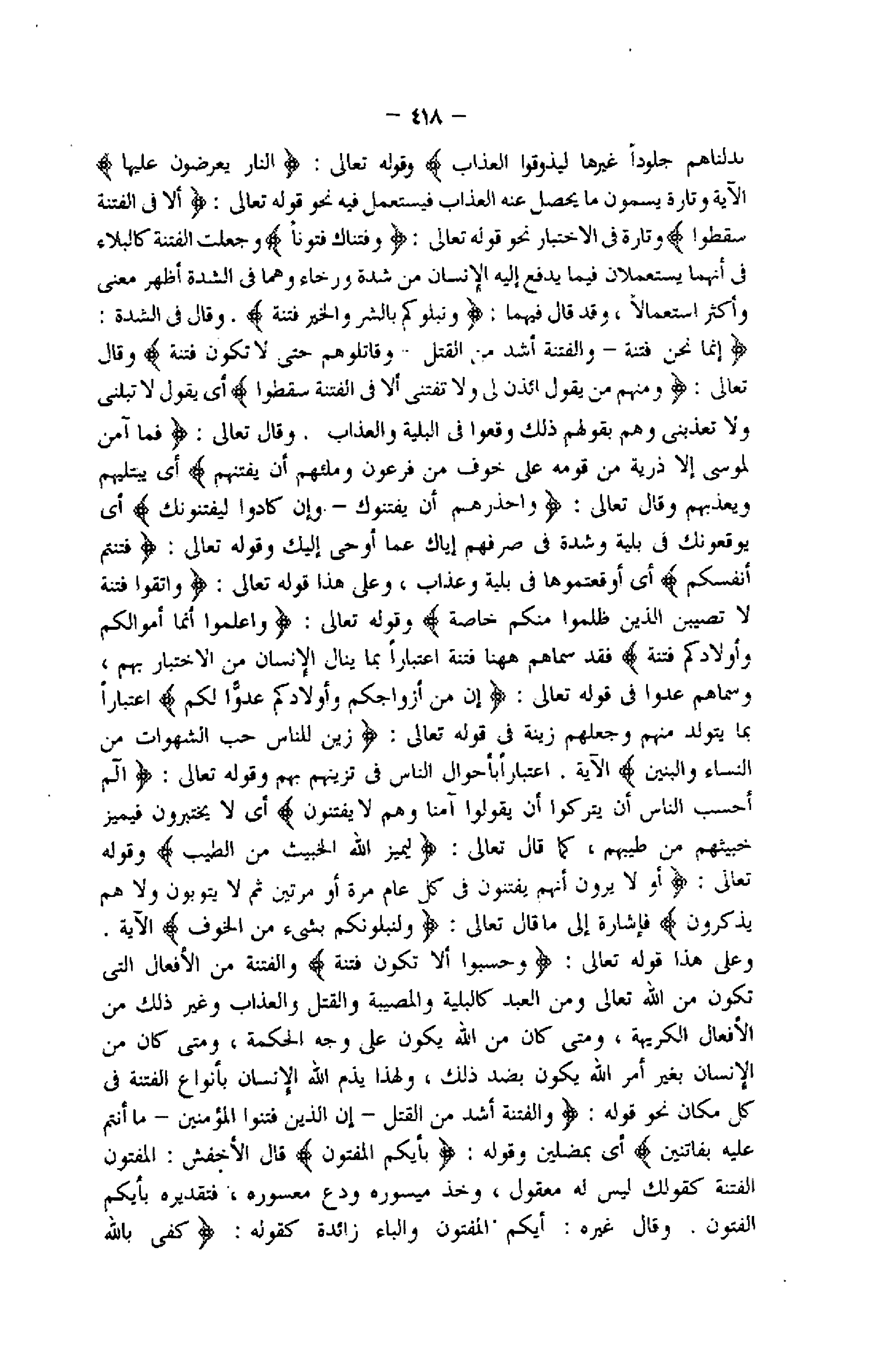 إِنَّما نَحْنُ فِتْنَةٌ- وَالْفِتْنَةُ أَشَدُّ مِنَ الْقَتْلِ- وَقاتِلُوهُمْ حَتَّى لا تَكُونَ فِتْنَةٌ وقال تعالى: وَمِنْهُمْ مَنْ يَقُولُ ائْذَنْ لِي وَلا تَفْتِنِّي أَلا فِي الْفِتْنَةِ سَقَطُوا أي يقول لا تبلنى ولا تعذبنى وهم بقولهم ذلك وقعوا فى البلية والعذاب. وقال تعالى: فَما آمَنَ لِمُوسى إِلَّا ذُرِّيَّةٌ مِنْ قَوْمِهِ عَلى خَوْفٍ مِنْ فِرْعَوْنَ وَمَلَائِهِمْ أَنْ يَفْتِنَهُمْ أي يبتليهم ويعذبهم وقال تعالى: وَاحْذَرْهُمْ أَنْ يَفْتِنُوكَ- وَإِنْ كادُوا لَيَفْتِنُونَكَ أي يوقعونك فى بلية وشدة فى صرفهم إياك عما أوحى إليك وقوله تعالى: فَتَنْتُمْ أَنْفُسَكُمْ أي أوقعتموها فى بلية وعذاب، وعلى هذا قوله تعالى: وَاتَّقُوا فِتْنَةً لا تُصِيبَنَّ الَّذِينَ ظَلَمُوا مِنْكُمْ خَاصَّةً وقوله تعالى: وَاعْلَمُوا أَنَّما أَمْوالُكُمْ وَأَوْلادُكُمْ فِتْنَةٌ
