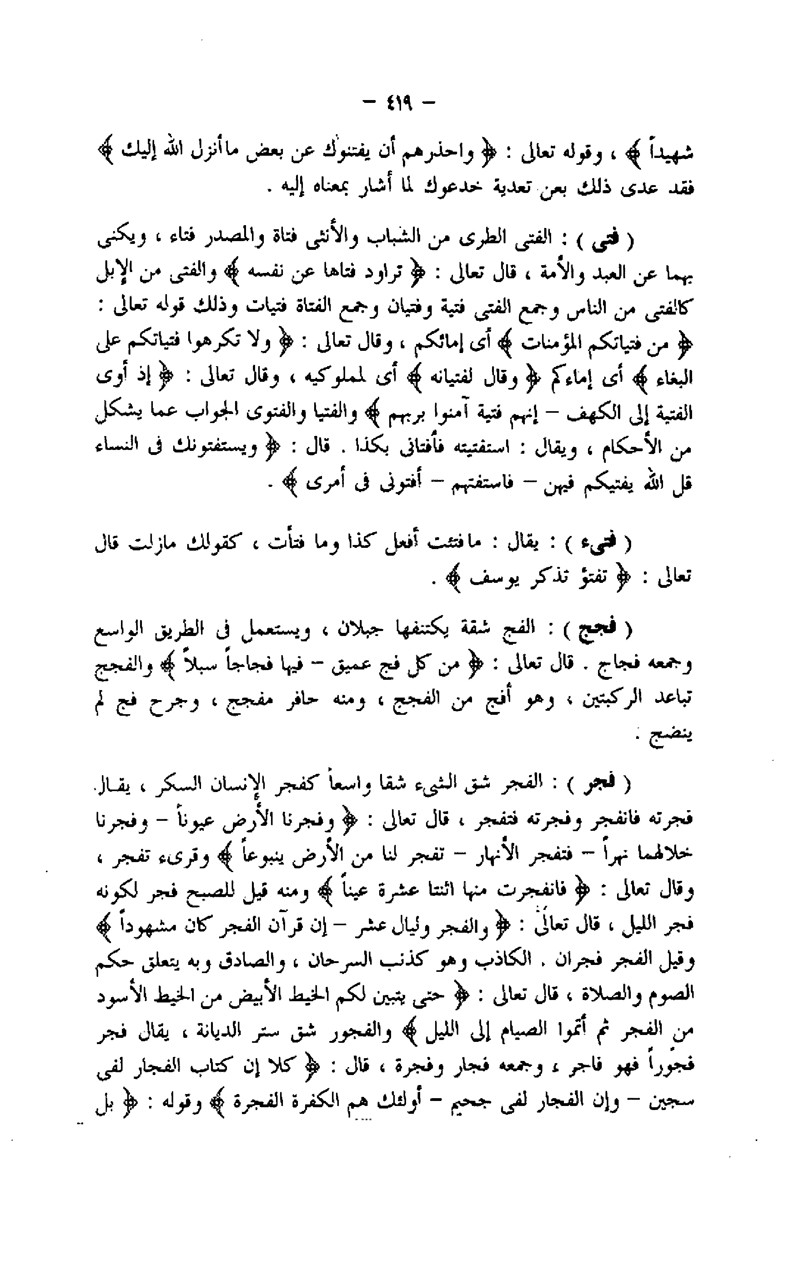 (فجر) : الفجر شق الشيء شقا واسعا كفجر الإنسان السكر، يقال فجرته فانفجر وفجرته فتفجر، قال تعالى: وَفَجَّرْنَا الْأَرْضَ عُيُوناً- وَفَجَّرْنا خِلالَهُما نَهَراً- فَتُفَجِّرَ الْأَنْهارَ- تَفْجُرَ لَنا مِنَ الْأَرْضِ يَنْبُوعاً وقرىء تفجر، وقال تعالى: فَانْفَجَرَتْ مِنْهُ اثْنَتا عَشْرَةَ عَيْناً ومنه قيل للصبح فجر لكونه فجر الليل، قال تعالى: وَالْفَجْرِ وَلَيالٍ عَشْرٍ- إِنَّ قُرْآنَ الْفَجْرِ كانَ مَشْهُوداً وقيل الفجر فجران. الكاذب وهو كذنب السرحان، والصادق وبه يتعلق حكم الصوم والصلاة، قال تعالى: حَتَّى يَتَبَيَّنَ لَكُمُ الْخَيْطُ الْأَبْيَضُ مِنَ الْخَيْطِ الْأَسْوَدِ مِنَ الْفَجْرِ ثُمَّ أَتِمُّوا الصِّيامَ إِلَى اللَّيْلِ والفجور شق ستر الديانة، يقال فجر فجورا فهو فاجر، وجمعه فجار وفجرة، قال: كَلَّا إِنَّ كِتابَ الفُجَّارِ لَفِي سِجِّينٍ- وَإِنَّ الْفُجَّارَ لَفِي جَحِيمٍ- أُولئِكَ هُمُ الْكَفَرَةُ الْفَجَرَةُ وقوله: بَلْ