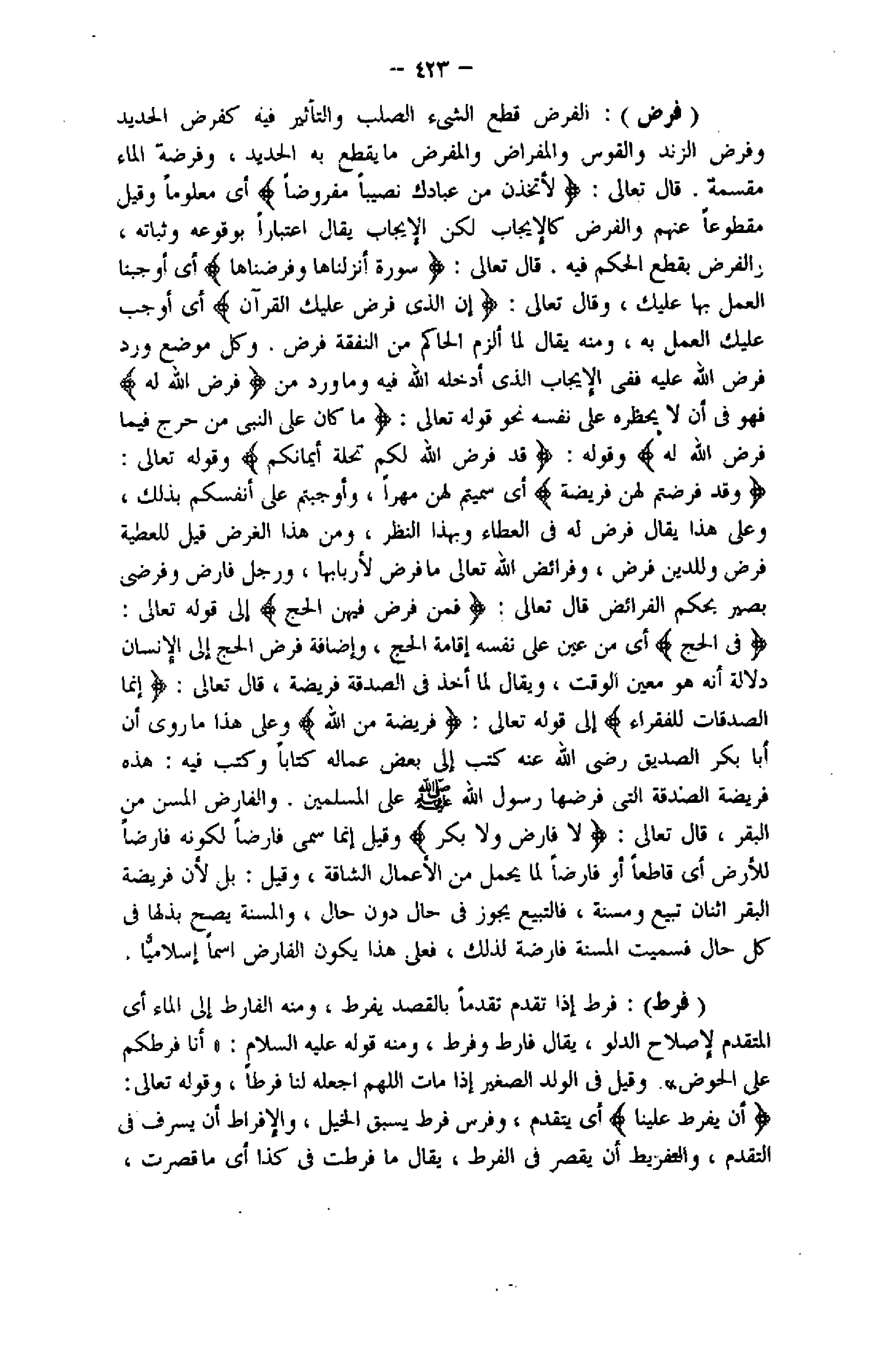 (فرض) : الفرض قطع الشيء الصلب والتأثير فيه كفرض الحديد وفرض الزند والقوس والمفراض والمفرض ما يقطع به الحديد، وفرضة الماء مقسمة. قال تعالى: لَأَتَّخِذَنَّ مِنْ عِبادِكَ نَصِيباً مَفْرُوضاً أي معلوما وقيل مقطوعا عنهم والفرض كالإيجاب لكن الإيجاب يقال اعتبارا بوقوعه وثباته، والفرض بقطع الحكم فيه. قال تعالى: سُورَةٌ أَنْزَلْناها وَفَرَضْناها أي أوجبنا العمل بها عليك، وقال تعالى: إِنَّ الَّذِي فَرَضَ عَلَيْكَ الْقُرْآنَ أي أوجب عليك العمل به، ومنه يقال لما ألزم الحاكم من النفقة فرض. وكل موضع ورد فرض اللَّه عليه ففى الإيجاب الذي أدخله اللَّه فيه وما ورد من فَرَضَ اللَّهُ لَهُ فهو فى أن لا يحظره على نفسه نحو قوله تعالى: ما كانَ عَلَى النَّبِيِّ مِنْ حَرَجٍ فِيما فَرَضَ اللَّهُ لَهُ وقوله: قَدْ فَرَضَ اللَّهُ لَكُمْ تَحِلَّةَ أَيْمانِكُمْ وقوله تعالى: