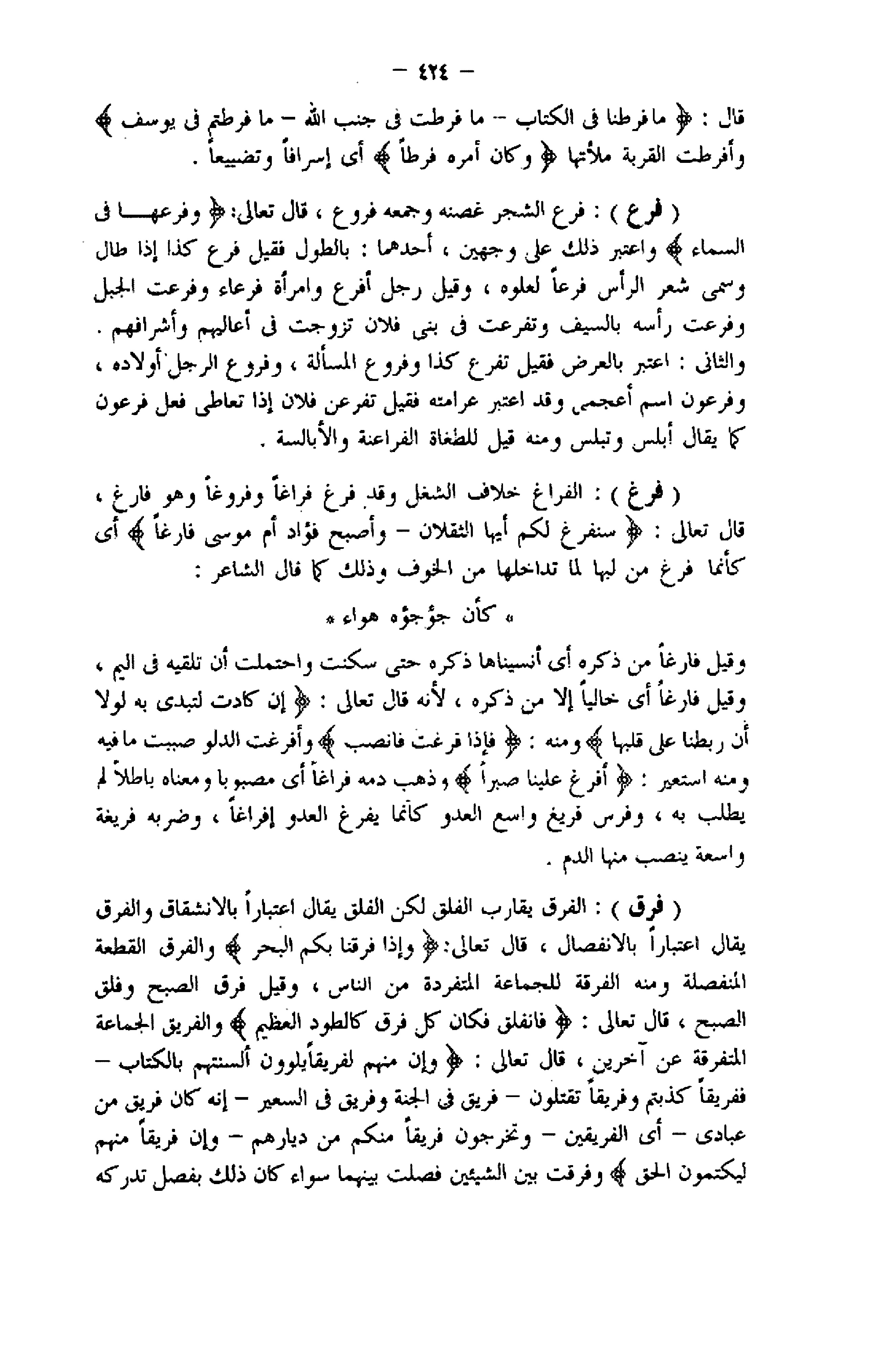 قال: ما فَرَّطْنا فِي الْكِتابِ- ما فَرَّطْتُ فِي جَنْبِ اللَّهِ- ما فَرَّطْتُمْ فِي يُوسُفَ وأفرطت القربة ملأتها وَكانَ أَمْرُهُ فُرُطاً أي إسرافا وتضييعا.