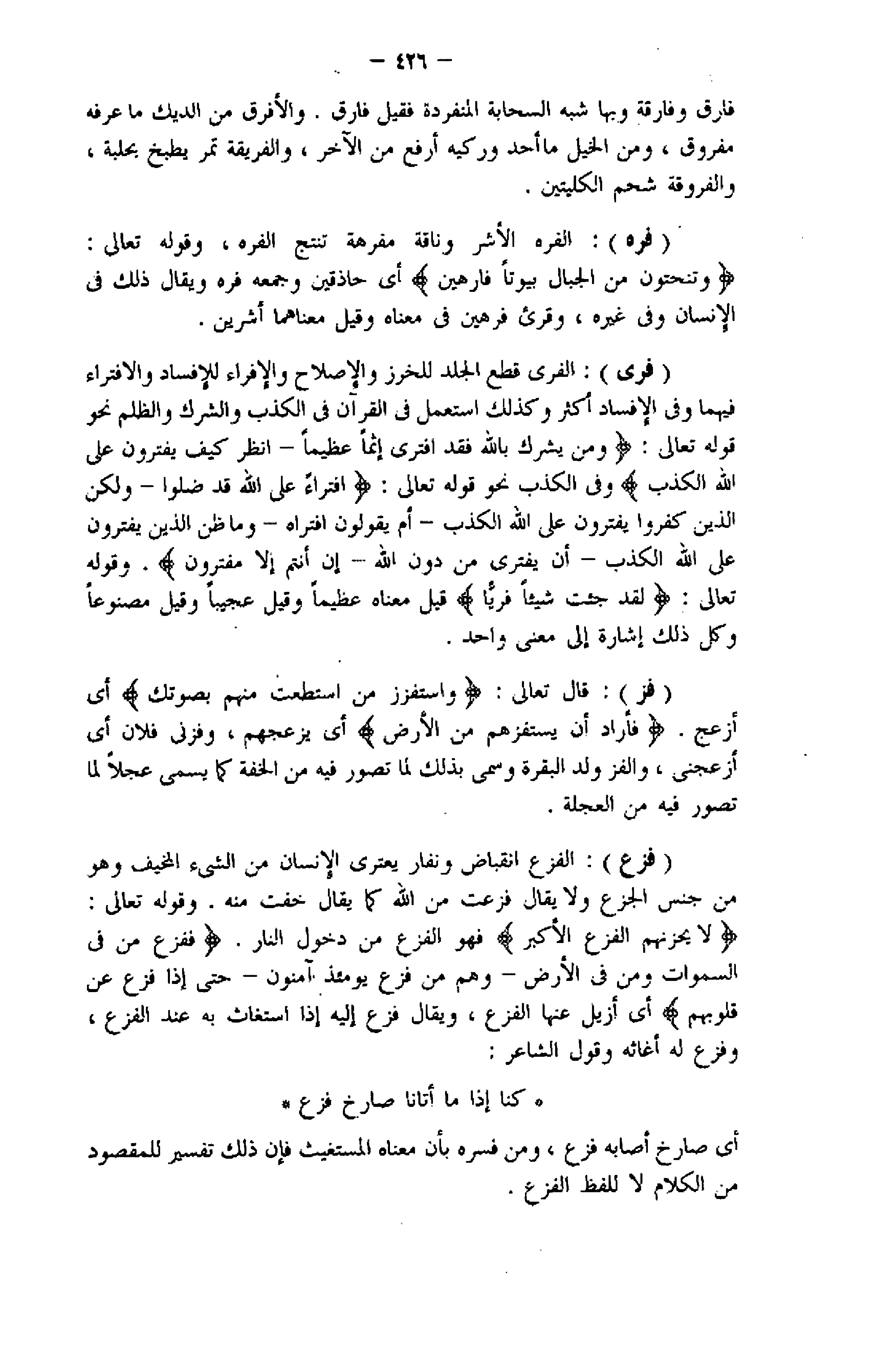 (فرى) : الفري قطع الجلد للخرز والإصلاح والإفراء للإفساد والافتراء فيهما وفى الإفساد أكثر وكذلك استعمل فى القرآن فى الكذب والشرك والظلم نحو قوله تعالى: وَمَنْ يُشْرِكْ بِاللَّهِ فَقَدِ افْتَرى إِثْماً عَظِيماً- انْظُرْ كَيْفَ يَفْتَرُونَ عَلَى اللَّهِ الْكَذِبَ وفى الكذب نحو قوله تعالى: افْتِراءً عَلَى اللَّهِ قَدْ ضَلُّوا- وَلكِنَّ الَّذِينَ كَفَرُوا يَفْتَرُونَ عَلَى اللَّهِ الْكَذِبَ- أَمْ يَقُولُونَ افْتَراهُ- وَما ظَنُّ الَّذِينَ يَفْتَرُونَ عَلَى اللَّهِ الْكَذِبَ- أَنْ يُفْتَرى مِنْ دُونِ اللَّهِ- إِنْ أَنْتُمْ إِلَّا مُفْتَرُونَ. وقوله تعالى: لَقَدْ جِئْتِ شَيْئاً فَرِيًّا قيل معناه عظيما وقيل عجيبا وقيل مصنوعا وكل ذلك إشارة إلى معنى واحد.