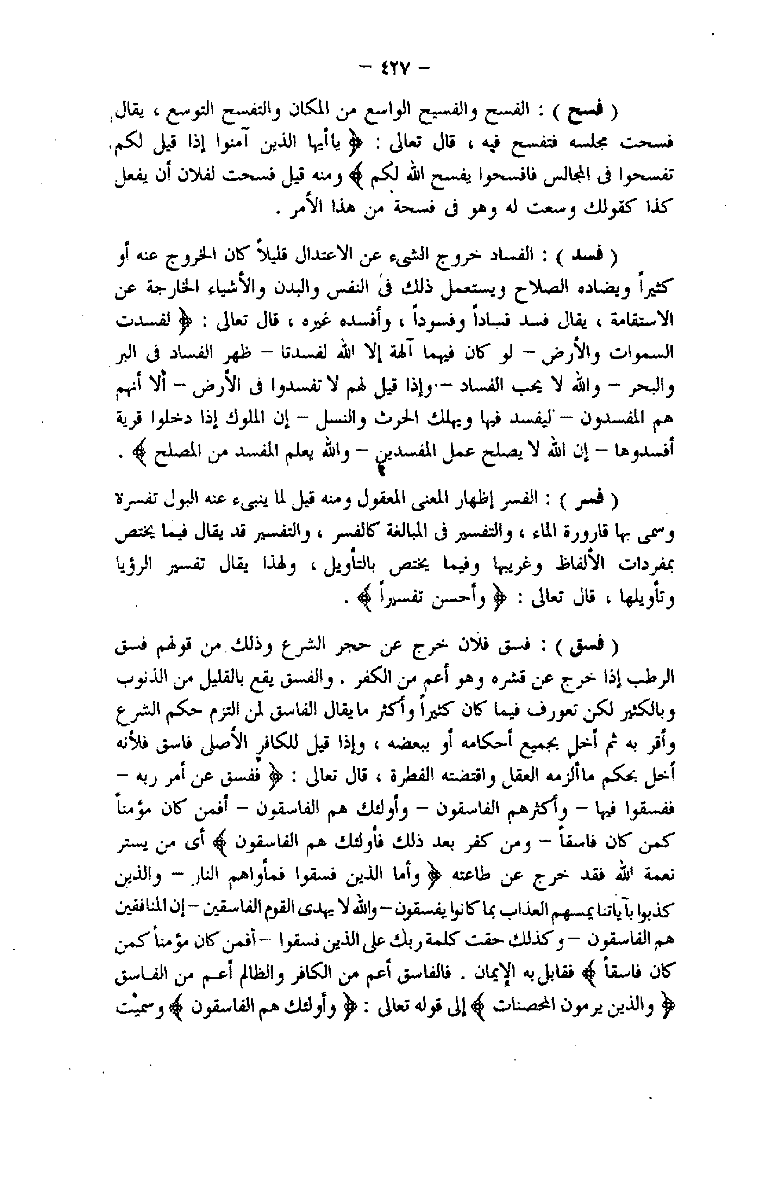 (فسد) : الفساد خروج الشيء عن الاعتدال قليلا كان الخروج عنه أو كثيرا ويضاده الصلاح ويستعمل ذلك فى النفس والبدن والأشياء الخارجة عن الاستقامة، يقال فسد فسادا وفسودا، وأفسده غيره، قال تعالى: لَفَسَدَتِ السَّماواتُ وَالْأَرْضُ- لَوْ كانَ فِيهِما آلِهَةٌ إِلَّا اللَّهُ لَفَسَدَتا- ظَهَرَ الْفَسادُ فِي الْبَرِّ وَالْبَحْرِ- وَاللَّهُ لا يُحِبُّ الْفَسادَ- وَإِذا قِيلَ لَهُمْ لا تُفْسِدُوا فِي الْأَرْضِ- أَلا إِنَّهُمْ هُمُ الْمُفْسِدُونَ- لِيُفْسِدَ فِيها وَيُهْلِكَ الْحَرْثَ وَالنَّسْلَ- إِنَّ الْمُلُوكَ إِذا دَخَلُوا قَرْيَةً أَفْسَدُوها- إِنَّ اللَّهَ لا يُصْلِحُ عَمَلَ الْمُفْسِدِينَ- وَاللَّهُ يَعْلَمُ الْمُفْسِدَ مِنَ الْمُصْلِحِ.