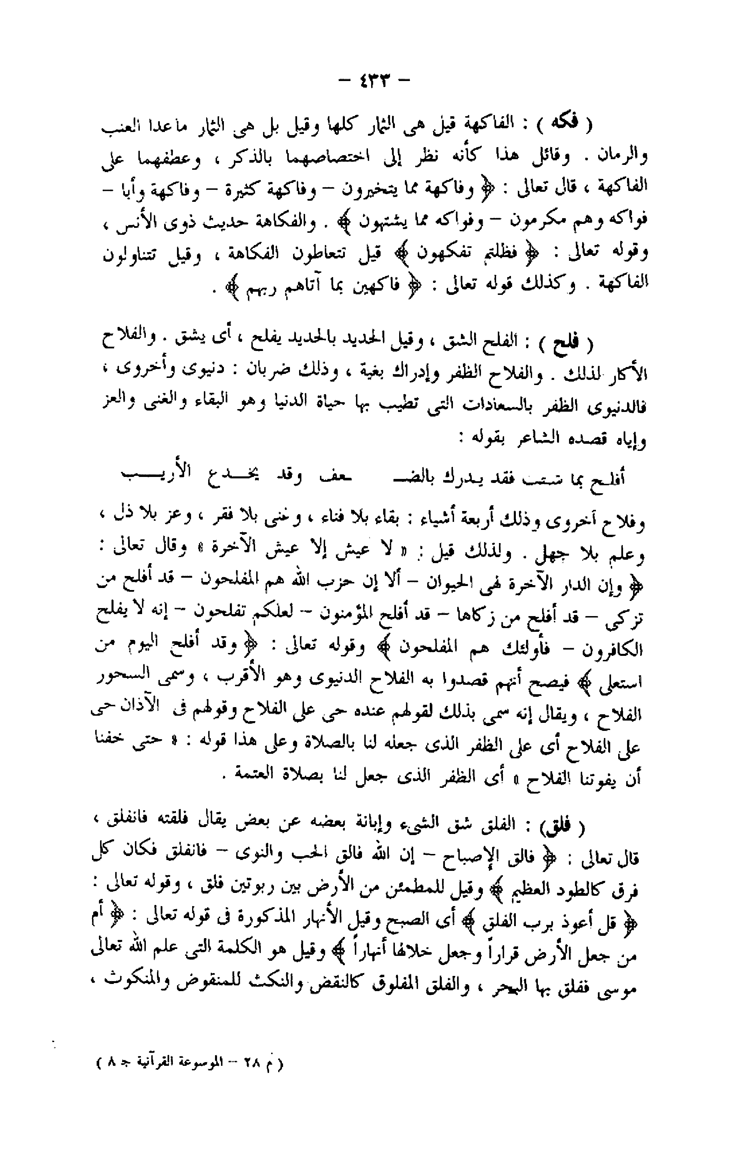 وَإِنَّ الدَّارَ الْآخِرَةَ لَهِيَ الْحَيَوانُ- أَلا إِنَّ حِزْبَ اللَّهِ هُمُ الْمُفْلِحُونَ- قَدْ أَفْلَحَ مَنْ تَزَكَّى- قَدْ أَفْلَحَ مَنْ زَكَّاها- قَدْ أَفْلَحَ الْمُؤْمِنُونَ- لَعَلَّكُمْ تُفْلِحُونَ- إِنَّهُ لا يُفْلِحُ الْكافِرُونَ- فَأُولئِكَ هُمُ الْمُفْلِحُونَ وقوله تعالى: وَقَدْ أَفْلَحَ الْيَوْمَ مَنِ اسْتَعْلى فيصح أنهم قصدوا به الفلاح الدنيوي وهو الأقرب، وسمى السحور الفلاح، ويقال إنه سمى بذلك لقولهم عنده حى على الفلاح وقولهم فى الآذان حى على الفلاح أي على الظفر الذي جعله لنا بالصلاة وعلى هذا قوله: «حتى خفنا أن يفوتنا الفلاح» أي الظفر الذي جعل لنا بصلاة العتمة.