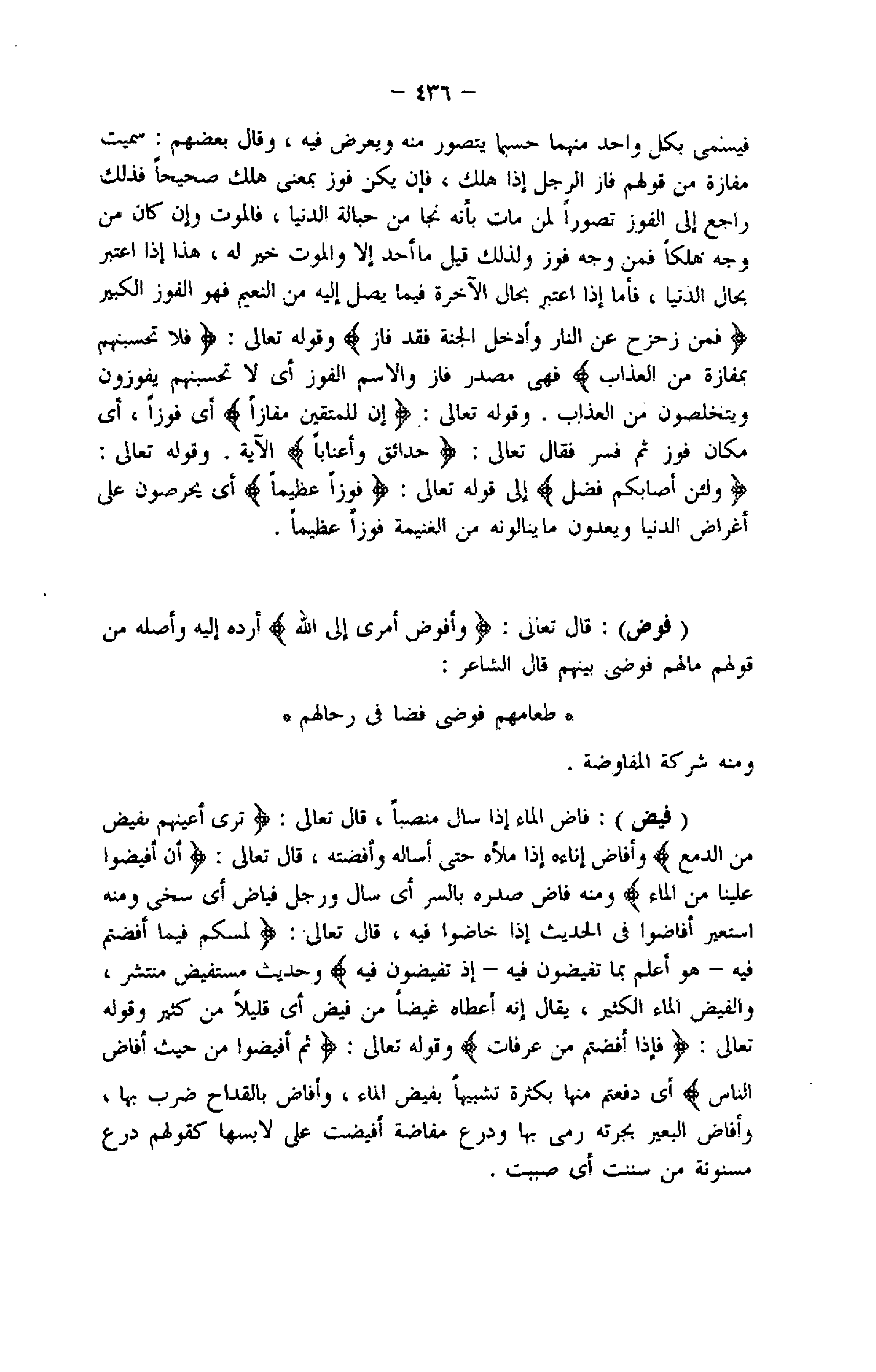 (فيض) : فاض الماء إذا سال منصبا، قال تعالى: تَرى أَعْيُنَهُمْ تَفِيضُ مِنَ الدَّمْعِ وأفاض إناءه إذا ملأه حتى أساله وأفضته، قال تعالى: أَنْ أَفِيضُوا عَلَيْنا مِنَ الْماءِ ومنه فاض صدره بالسر أي سال ورجل فياض أي سخى ومنه استعير أفاضوا فى الحديث إذا خاضوا فيه، قال تعالى: لَمَسَّكُمْ فِيما أَفَضْتُمْ فِيهِ- هُوَ أَعْلَمُ بِما تُفِيضُونَ فِيهِ- إِذْ تُفِيضُونَ فِيهِ وحديث مستفيض منتشر، والفيض الماء الكثير، يقال إنه أعطاه غيضا من فيض أي قليلا من كثير وقوله تعالى: فَإِذا أَفَضْتُمْ مِنْ عَرَفاتٍ وقوله تعالى: ثُمَّ أَفِيضُوا مِنْ حَيْثُ أَفاضَ النَّاسُ أي دفعتم منها بكثرة تشبيها بفيض الماء، وأفاض بالقداح ضرب بها، وأفاض البعير بجرته رمى بها ودرع مفاضة أفيضت على لا بسها كقولهم درع مسنونة من سننت أي صببت.
