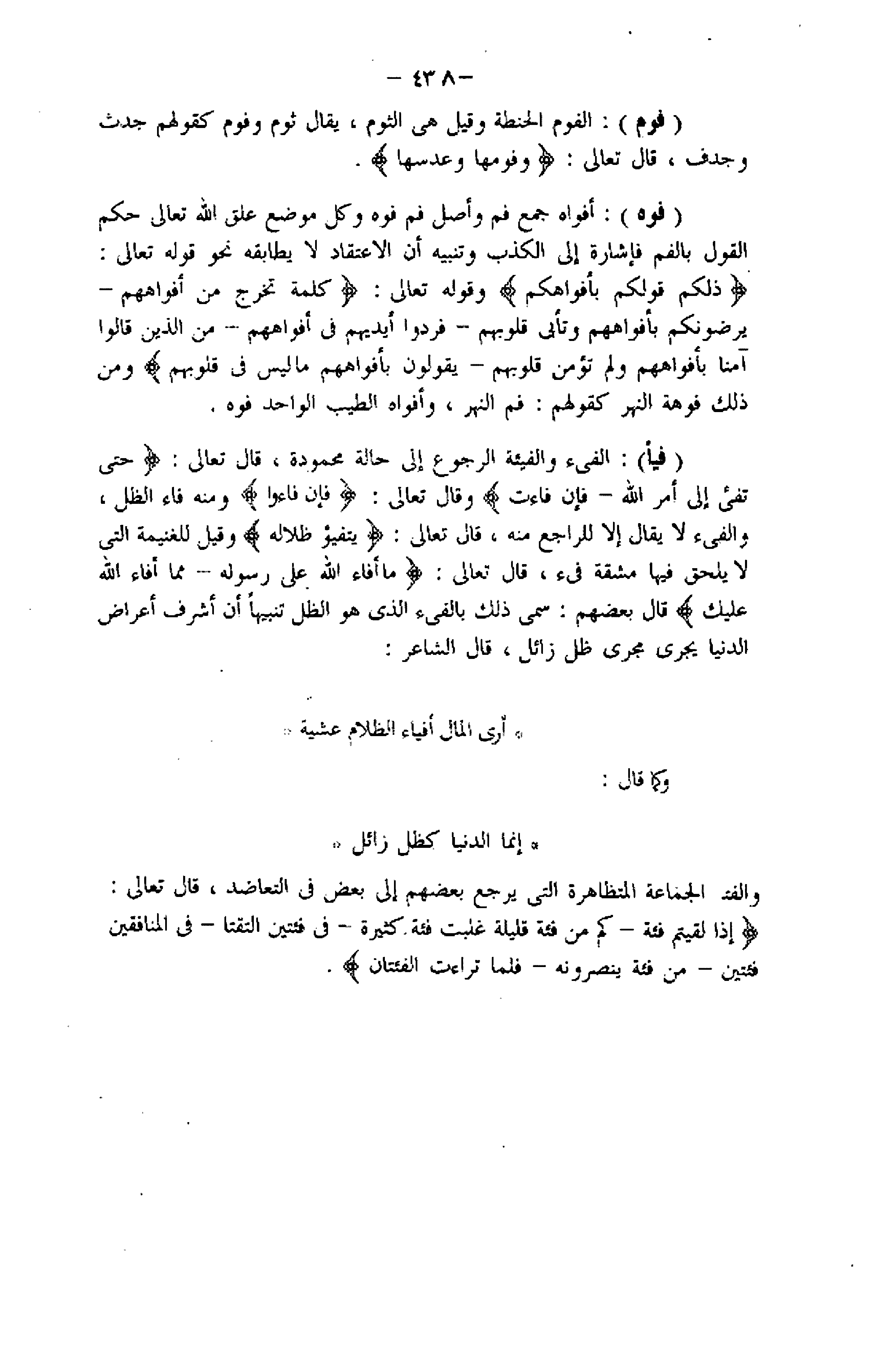(فيأ) : الفيء والفيئة الرجوع إلى حالة محمودة، قال تعالى: حَتَّى تَفِيءَ إِلى أَمْرِ اللَّهِ- فَإِنْ فاءَتْ وقال تعالى: فَإِنْ فاؤُ ومنه فاء الظل، والفيء لا يقال إلا للراجع منه، قال تعالى: يَتَفَيَّؤُا ظِلالُهُ وقيل للغنيمة التي لا يلحق فيها مشقة فىء، قال تعالى: ما أَفاءَ اللَّهُ عَلى رَسُولِهِ- مِمَّا أَفاءَ اللَّهُ عَلَيْكَ قال بعضهم: سمى ذلك بالفيء الذي هو الظل تنبيها أن أشرف أعراض الدنيا يجرى مجرى ظل زائل، قال الشاعر: