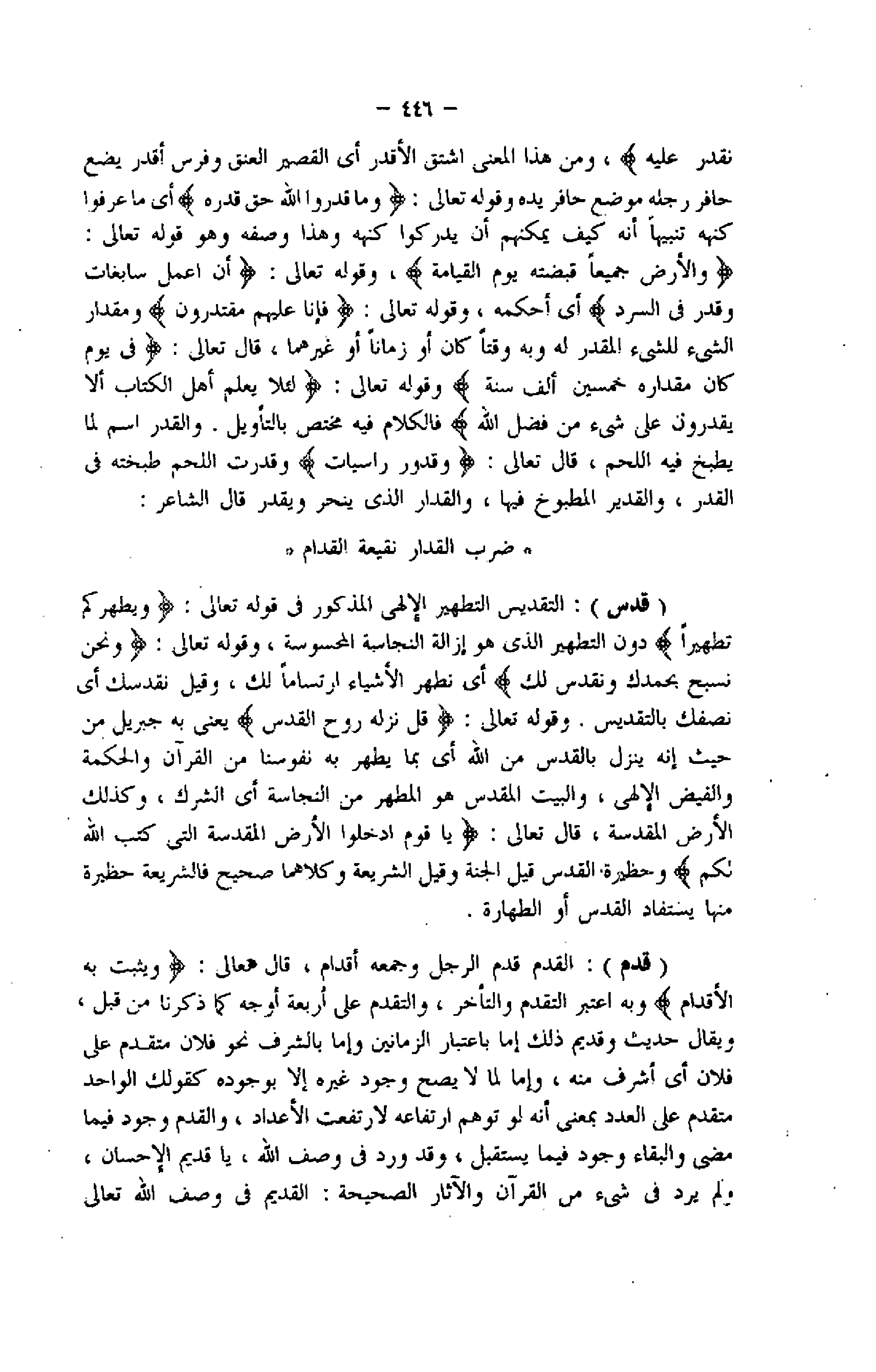 وَالْأَرْضُ جَمِيعاً قَبْضَتُهُ يَوْمَ الْقِيامَةِ، وقوله تعالى: أَنِ اعْمَلْ سابِغاتٍ وَقَدِّرْ فِي السَّرْدِ أي أحكمه، وقوله تعالى: فَإِنَّا عَلَيْهِمْ مُقْتَدِرُونَ ومقدار الشيء للشىء المقدر له وبه وقتا كان أو زمانا أو غيرهما، قال تعالى: فِي يَوْمٍ كانَ مِقْدارُهُ خَمْسِينَ أَلْفَ سَنَةٍ وقوله تعالى: لِئَلَّا يَعْلَمَ أَهْلُ الْكِتابِ أَلَّا يَقْدِرُونَ عَلى شَيْءٍ مِنْ فَضْلِ اللَّهِ فالكلام فيه مختص بالتأويل. والقدر اسم لما يطبخ فيه اللحم، قال تعالى: وَقُدُورٍ راسِياتٍ وقدرت اللحم طبخته فى القدر، والقدير المطبوخ فيها، والقدر الذي ينحر ويقدر قال الشاعر: