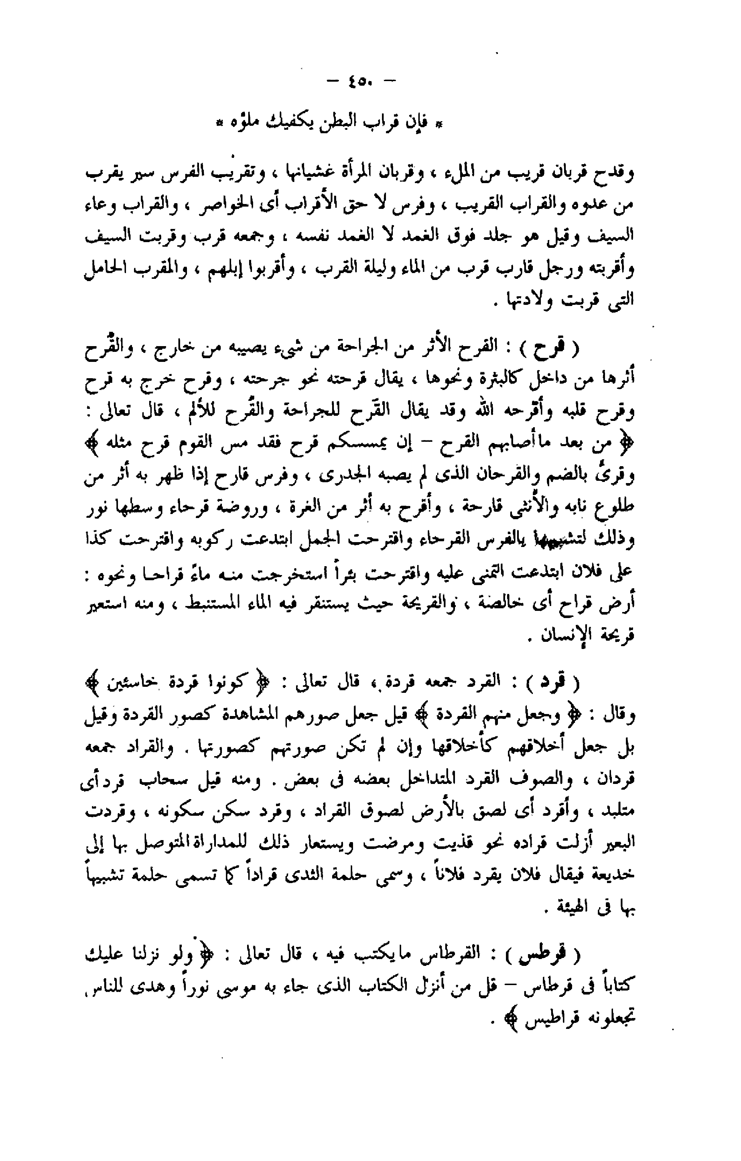 مِنْ بَعْدِ ما أَصابَهُمُ الْقَرْحُ- إِنْ يَمْسَسْكُمْ قَرْحٌ فَقَدْ مَسَّ الْقَوْمَ قَرْحٌ مِثْلُهُ وقرىء بالضم والقرحان الذي لم يصبه الجدري، وفرس قارح إذا ظهر به أثر من طلوع نابه والأنثى قارحة، وأقرح به أثر من الغرة، وروضة قرحاء وسطها نور وذلك لتشبهها بالفرس القرحاء واقترحت الجمل ابتدعت ركوبه واقترحت كذا على فلان ابتدعت التمني عليه واقترحت بئرا استخرجت منه ماء قراحا ونحوه: