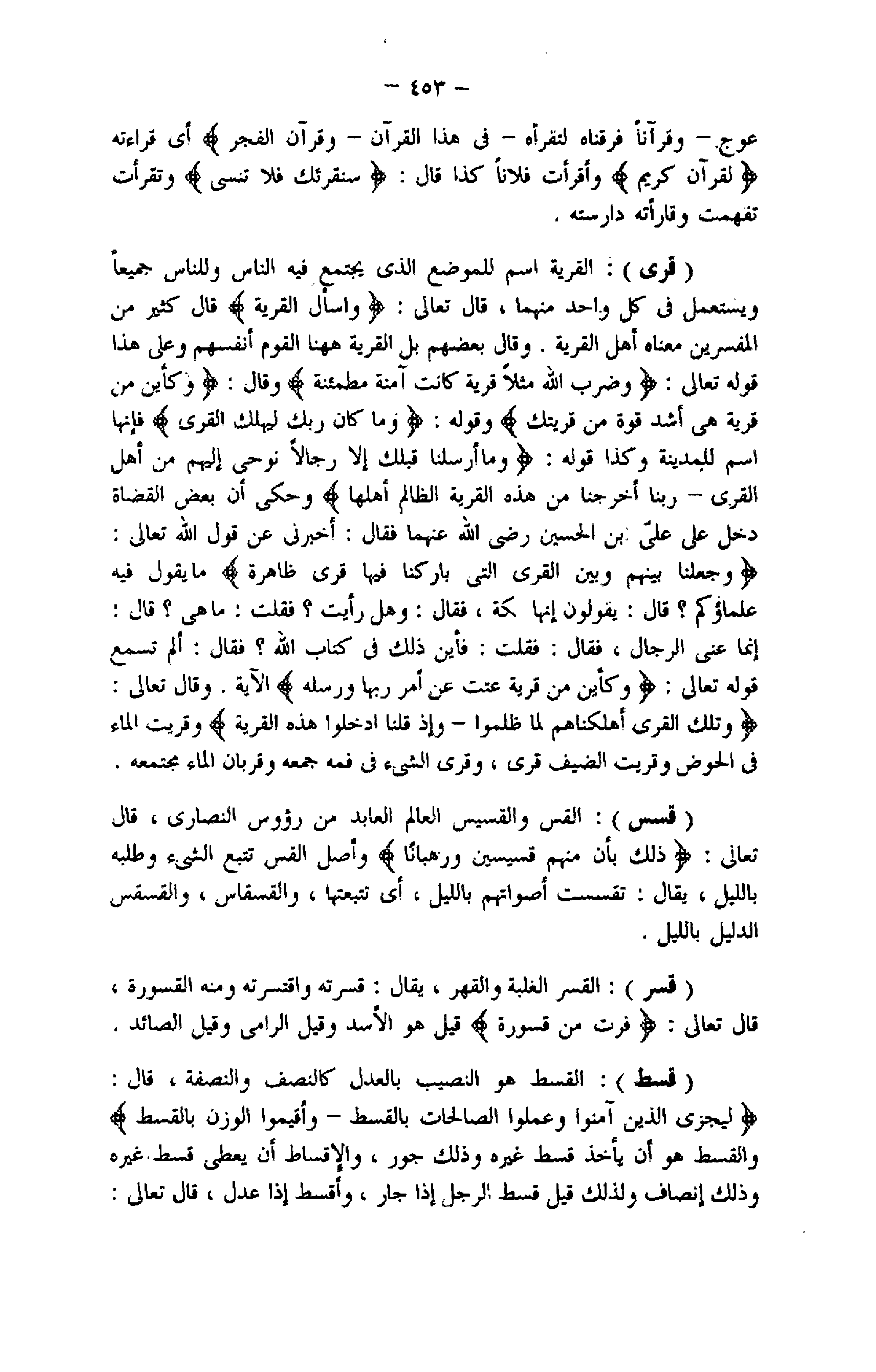 (قرى) : القرية اسم للموضع الذي يجتمع فيه الناس وللناس جميعا ويستعمل فى كل واحد منهما، قال تعالى: وَسْئَلِ الْقَرْيَةَ قال كثير من المفسرين معناه أهل القرية. وقال بعضهم بل القرية هاهنا القوم أنفسهم وعلى هذا قوله تعالى: وَضَرَبَ اللَّهُ مَثَلًا قَرْيَةً كانَتْ آمِنَةً مُطْمَئِنَّةً وقال: وَكَأَيِّنْ مِنْ قَرْيَةٍ هِيَ أَشَدُّ قُوَّةً مِنْ قَرْيَتِكَ وقوله: وَما كانَ رَبُّكَ لِيُهْلِكَ الْقُرى فإنها اسم للمدينة وكذا قوله: وَما أَرْسَلْنا مِنْ قَبْلِكَ إِلَّا رِجالًا نُوحِي إِلَيْهِمْ مِنْ أَهْلِ الْقُرى - رَبَّنا أَخْرِجْنا مِنْ هذِهِ الْقَرْيَةِ الظَّالِمِ أَهْلُها