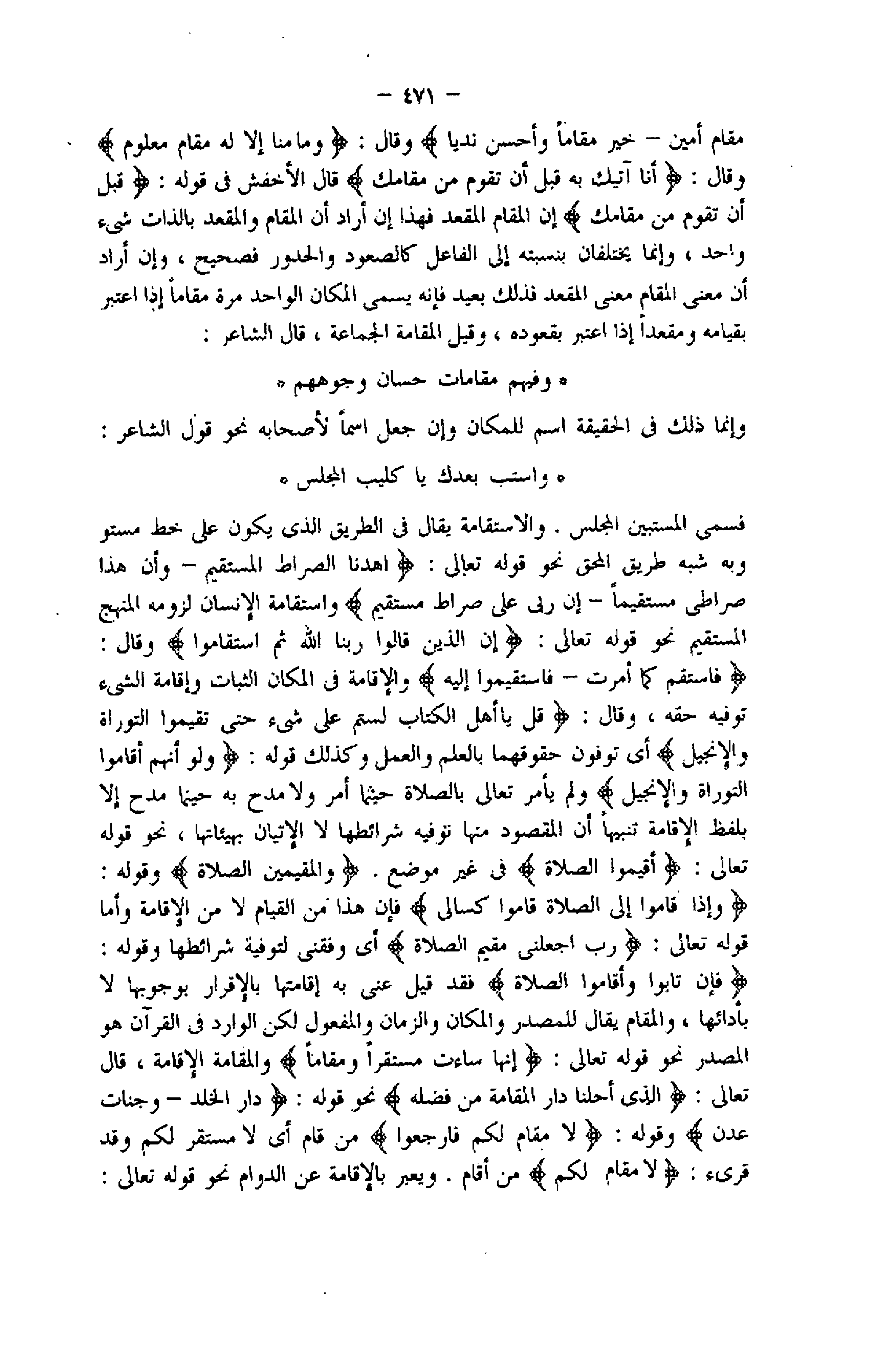 - خَيْرٌ مَقاماً وَأَحْسَنُ نَدِيًّا وقال: وَما مِنَّا إِلَّا لَهُ مَقامٌ مَعْلُومٌ وقال: أَنَا آتِيكَ بِهِ قَبْلَ أَنْ تَقُومَ مِنْ مَقامِكَ قال الأخفش فى قوله: قَبْلَ أَنْ تَقُومَ مِنْ مَقامِكَ إن المقام المقعد فهذا إن أراد أن المقام والمقعد بالذات شىء واحد، وإنما يختلفان بنسبته إلى الفاعل كالصعود والحدور فصحيح، وإن أراد أن معنى المقام معنى المقعد فذلك بعيد فإنه يسمى المكان الواحد مرة مقاما إذا اعتبر بقيامه ومقعدا إذا اعتبر بقعوده، وقيل المقامة الجماعة، قال الشاعر: