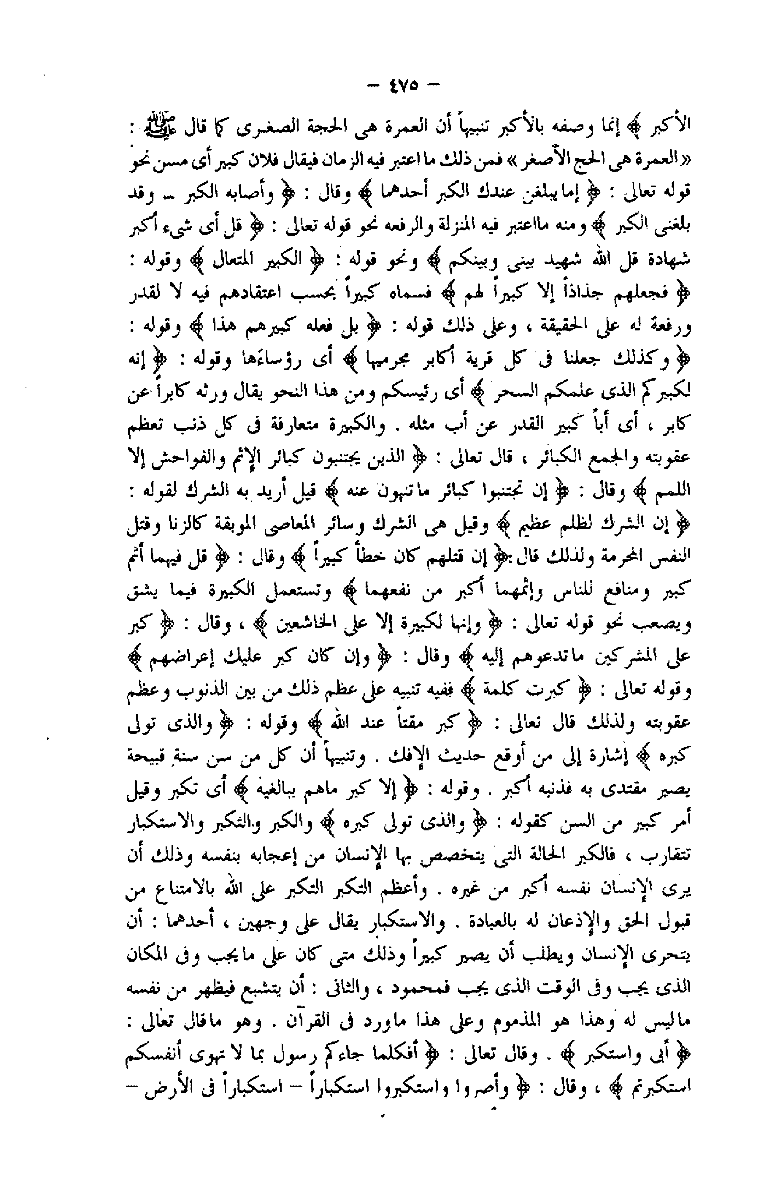 وَكَذلِكَ جَعَلْنا فِي كُلِّ قَرْيَةٍ أَكابِرَ مُجْرِمِيها أي رؤساءها وقوله: إِنَّهُ لَكَبِيرُكُمُ الَّذِي عَلَّمَكُمُ السِّحْرَ أي رئيسكم ومن هذا النحو يقال ورثه كابرا عن كابر، أي أبا كبير القدر عن أب مثله. والكبيرة متعارفة فى كل ذنب تعظم عقوبته والجمع الكبائر، ثم قال تعالى: الَّذِينَ يَجْتَنِبُونَ كَبائِرَ الْإِثْمِ وَالْفَواحِشَ إِلَّا اللَّمَمَ وقال: إِنْ تَجْتَنِبُوا كَبائِرَ ما تُنْهَوْنَ عَنْهُ قيل أريد به الشرك لقوله: