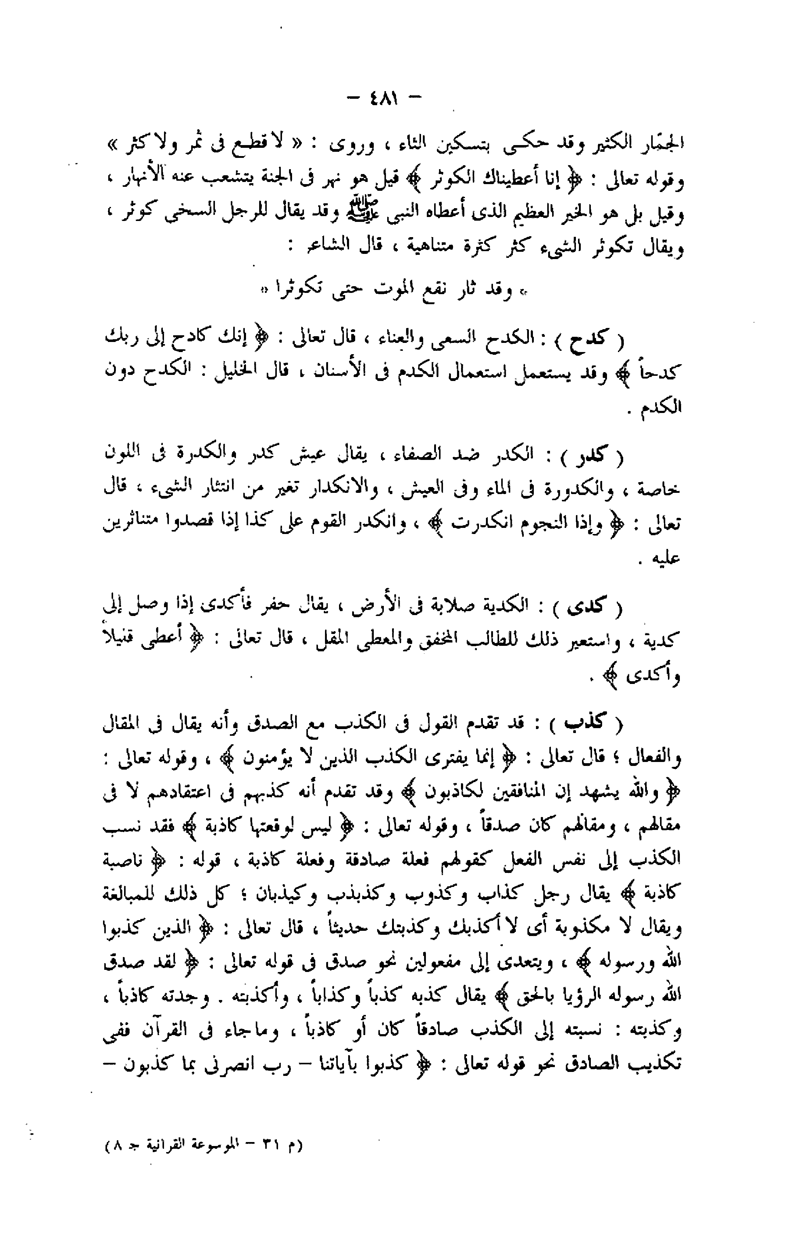 وقوله تعالى: إِنَّا أَعْطَيْناكَ الْكَوْثَرَ قيل هو نهر فى الجنة يتشعب عنه الأنهار، وقيل بل هو الخير العظيم الذي أعطاه النبي صلّى اللَّه عليه وسلّم وقد يقال للرجل السخي كوثر، ويقال تكوثر الشيء كثر كثرة متناهية، قال الشاعر:
