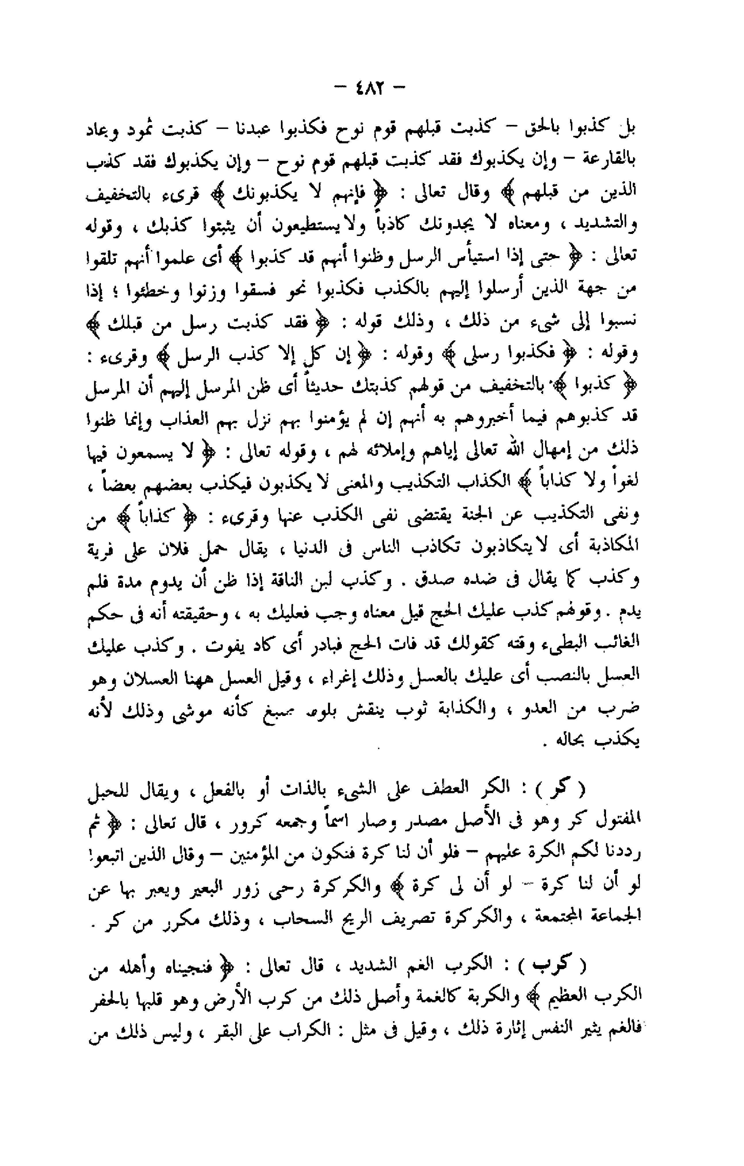 - كَذَّبَتْ قَبْلَهُمْ قَوْمُ نُوحٍ فَكَذَّبُوا عَبْدَنا- كَذَّبَتْ ثَمُودُ وَعادٌ بِالْقارِعَةِ- وَإِنْ يُكَذِّبُوكَ فَقَدْ كَذَّبَتْ قَبْلَهُمْ قَوْمُ نُوحٍ- وَإِنْ يُكَذِّبُوكَ فَقَدْ كَذَّبَ الَّذِينَ مِنْ قَبْلِهِمْ وقال تعالى: فَإِنَّهُمْ لا يُكَذِّبُونَكَ قرىء بالتخفيف والتشديد، ومعناه لا يجدونك كاذبا ولا يستطيعون أن يثبتوا كذبك، وقوله تعالى: حَتَّى إِذَا اسْتَيْأَسَ الرُّسُلُ وَظَنُّوا أَنَّهُمْ قَدْ كُذِبُوا أي علموا أنهم تلقوا من جهة الذين أرسلوا إليهم بالكذب فكذبوا نحو فسقوا وزنوا وخطئوا إذا نسبوا إلى شىء من ذلك، وذلك قوله: إِنْ كُلٌّ إِلَّا كَذَّبَ الرُّسُلَ وقرىء: