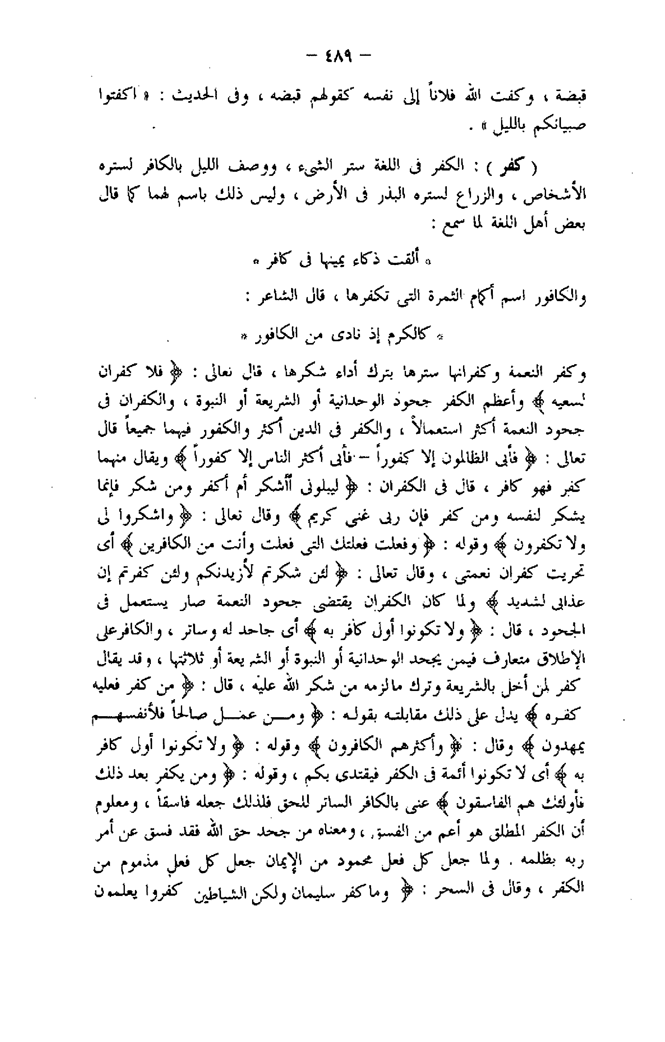 وكفر النعمة وكفرانها سترها بترك أداء شكرها، قال تعالى: فَلا كُفْرانَ لِسَعْيِهِ وأعظم الكفر جحود الوحدانية أو الشريعة أو النبوة، والكفران فى جحود النعمة أكثر استعمالا، والكفر فى الدين أكثر والكفور فيهما جميعا قال تعالى: فَأَبَى الظَّالِمُونَ إِلَّا كُفُوراً- فَأَبى أَكْثَرُ النَّاسِ إِلَّا كُفُوراً ويقال منهما كفر فهو كافر، قال فى الكفران: لِيَبْلُوَنِي أَأَشْكُرُ أَمْ أَكْفُرُ وَمَنْ شَكَرَ فَإِنَّما يَشْكُرُ لِنَفْسِهِ وَمَنْ كَفَرَ فَإِنَّ رَبِّي غَنِيٌّ كَرِيمٌ وقال تعالى: وَاشْكُرُوا لِي وَلا تَكْفُرُونِ وقوله: وَفَعَلْتَ فَعْلَتَكَ الَّتِي فَعَلْتَ وَأَنْتَ مِنَ الْكافِرِينَ أي تحريت كفران نعمتى، وقال تعالى: لَئِنْ شَكَرْتُمْ لَأَزِيدَنَّكُمْ وَلَئِنْ كَفَرْتُمْ إِنَّ عَذابِي لَشَدِيدٌ ولما كان الكفران يقتضى جحود النعمة صار يستعمل فى الجحود، قال: وَلا تَكُونُوا أَوَّلَ كافِرٍ بِهِ أي جاحد له وساتر، والكافر على الإطلاق متعارف فيمن يجحد الوحدانية أو النبوة أو الشريعة أو ثلاثتها، وقد يقال كفر لمن أخل بالشريعة وترك ما لزمه من شكر اللَّه عليه، قال: مَنْ كَفَرَ فَعَلَيْهِ كُفْرُهُ يدل على ذلك مقابلته بقوله: وَمَنْ عَمِلَ صالِحاً فَلِأَنْفُسِهِمْ يَمْهَدُونَ وقال: وَأَكْثَرُهُمُ الْكافِرُونَ وقوله: وَلا تَكُونُوا أَوَّلَ كافِرٍ بِهِ أي لا تكونوا أئمة فى الكفر فيقتدى بكم، وقوله: وَمَنْ كَفَرَ بَعْدَ ذلِكَ فَأُولئِكَ هُمُ الْفاسِقُونَ عنى بالكافر الساتر للحق فلذلك، جعله فاسقا، ومعلوم أن الكفر المطلق هو أعم من الفسق، ومعناه من جحد حق اللَّه فقد فسق عن أمر ربه بظلمه. ولما جعل كل فعل محمود من الإيمان جعل كل فعل مذموم من الكفر، وقال فى السحر: وَما كَفَرَ سُلَيْمانُ وَلكِنَّ الشَّياطِينَ كَفَرُوا يُعَلِّمُونَ