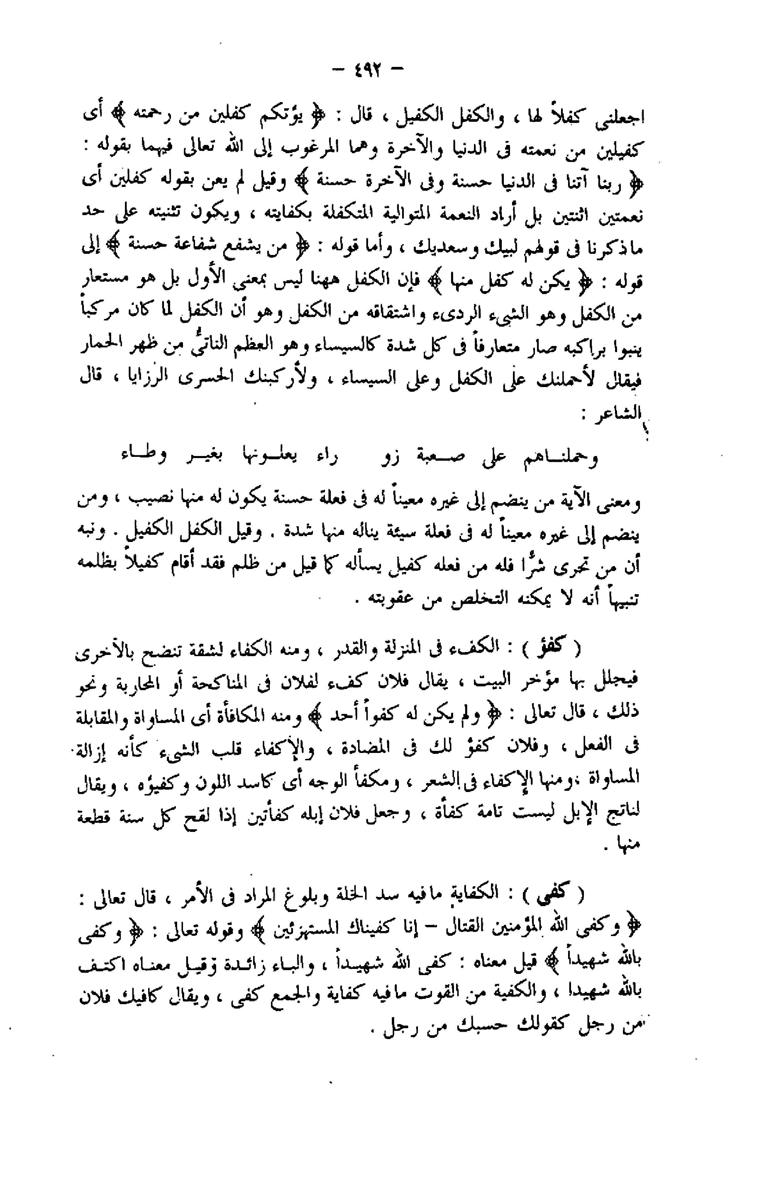 رَبَّنا آتِنا فِي الدُّنْيا حَسَنَةً وَفِي الْآخِرَةِ حَسَنَةً وقيل لم يعن بقوله كفلين أي نعمتين اثنتين بل أراد النعمة المتوالية المتكفلة بكفايته، ويكون تثنيته على حد ما ذكرنا فى قولهم لبيك وسعديك، وأما قوله: مَنْ يَشْفَعْ شَفاعَةً حَسَنَةً إلى قوله: يَكُنْ لَهُ كِفْلٌ مِنْها فإن الكفل هاهنا ليس بمعنى الأول بل هو مستعار من الكفل وهو الشيء الرديء واشتقاقه من الكفل وهو أن الكفل لما كان مركبا ينبوا براكبه صار متعارفا فى كل شدة كالسيساء وهو العظم الناتي من ظهر الحمار فيقال لأحملنك على الكفل وعلى السيساء، ولأركبنك الحسرى الرزايا، قال الشاعر: