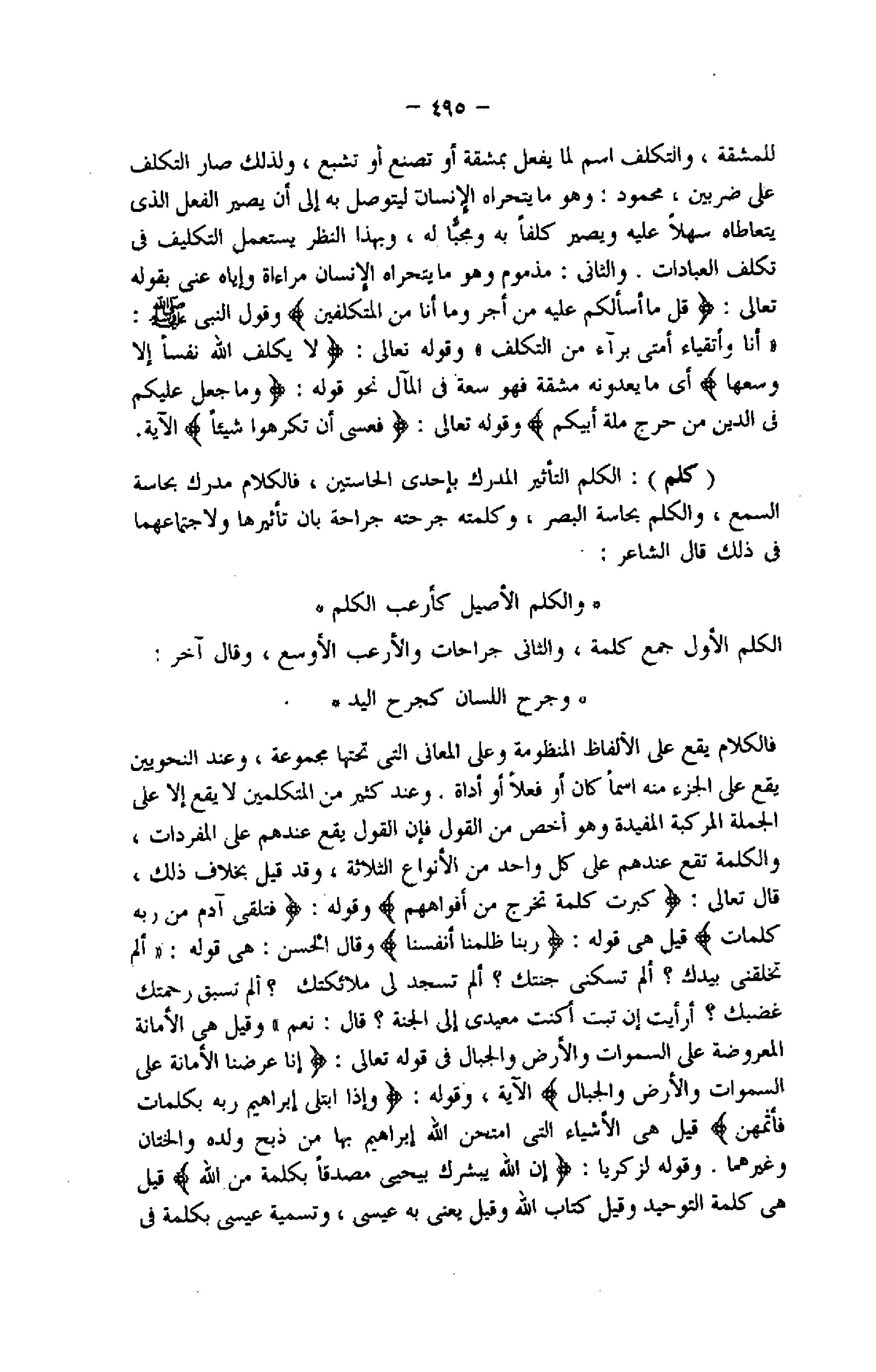فالكلام يقع على الألفاظ المنظومة وعلى المعاني التي تحتها مجموعة، وعند النحويين يقع على الجزء منه اسما كان أو فعلا أو أداة. وعند كثير من المتكلمين لا يقع إلا على الجملة المركبة المقيدة وهو أخص من القول فإن القول يقع عندهم على المفردات، والكلمة تقع عندهم على كل واحد من الأنواع الثلاثة، وقد قيل بخلاف ذلك، قال تعالى: كَبُرَتْ كَلِمَةً تَخْرُجُ مِنْ أَفْواهِهِمْ وقوله: فَتَلَقَّى آدَمُ مِنْ رَبِّهِ كَلِماتٍ قيل هى قوله: رَبَّنا ظَلَمْنا أَنْفُسَنا وقال الحسن: هى قوله: «ألم تخلقنى بيدك؟ ألم تسكنى جنتك؟ ألم تسجد لى ملائكتك؟ ألم تسبق رحمتك غضبك؟ أرأيت إن تبت أكنت معيدى إلى الجنة؟ قال: نعم» وقيل هى الأمانة المعروضة على السموات والأرض والجبال فى قوله تعالى: إِنَّا عَرَضْنَا الْأَمانَةَ عَلَى السَّماواتِ وَالْأَرْضِ وَالْجِبالِ الآية، وقوله: وَإِذِ ابْتَلى إِبْراهِيمَ رَبُّهُ بِكَلِماتٍ فَأَتَمَّهُنَّ قيل هى الأشياء التي امتحن اللَّه إبراهيم بها من ذبح ولده والختان وغيرهما. وقوله لزكريا: أَنَّ اللَّهَ يُبَشِّرُكَ بِيَحْيى مُصَدِّقاً بِكَلِمَةٍ مِنَ اللَّهِ قيل هى كلمة التوحيد وقيل كتاب اللَّه وقيل يعنى به عيسى، وتسمية عيسى بكلمة فى