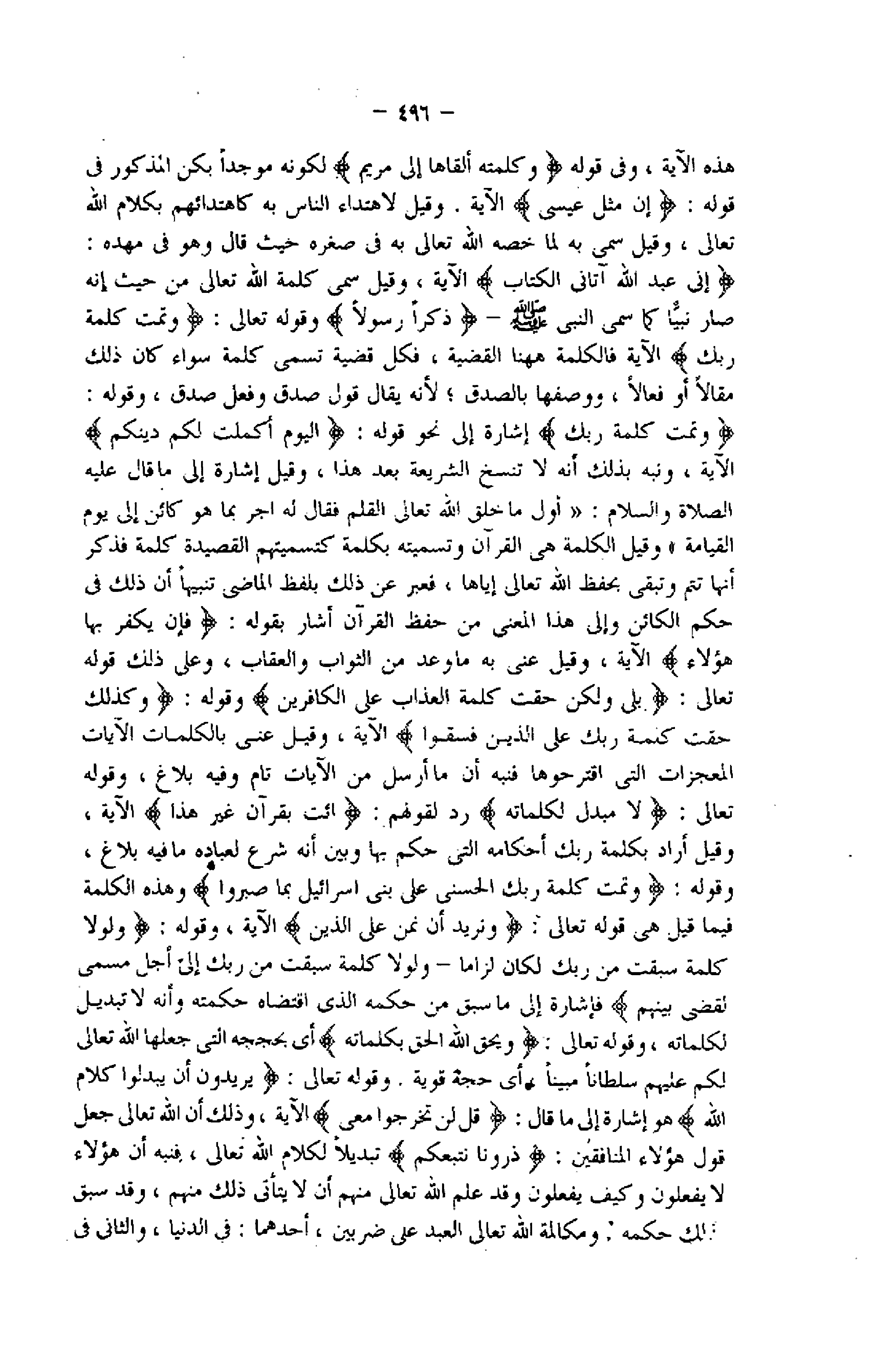 وَتَمَّتْ كَلِمَةُ رَبِّكَ إشارة إلى نحو قوله: الْيَوْمَ أَكْمَلْتُ لَكُمْ دِينَكُمْ الآية، ونبه بذلك أنه لا تنسخ الشريعة بعد هذا، وقيل إشارة إلى ما قال عليه الصلاة والسلام: «أول ما خلق اللَّه تعالى القلم فقال له اجر بما هو كائن إلى يوم القيامة» وقيل الكلمة هى القرآن وتسميته بكلمة كتسميتهم القصيدة كلمة فذكر أنها تتم وتبقى بحفظ اللَّه تعالى إياها، فعبر عن ذلك بلفظ الماضي تنبيها أن ذلك فى حكم الكائن وإلى هذا المعنى من حفظ القرآن أشار بقوله: فَإِنْ يَكْفُرْ بِها هؤُلاءِ الآية، وقيل عنى به ما وعد من الثواب والعقاب، وعلى ذلك قوله تعالى: بَلى وَلكِنْ حَقَّتْ كَلِمَةُ الْعَذابِ عَلَى الْكافِرِينَ وقوله: كَذلِكَ حَقَّتْ كَلِمَةُ رَبِّكَ عَلَى الَّذِينَ فَسَقُوا الآية، وقيل عنى بالكلمات الآيات المعجزات التي اقترحوها فنبه أن ما أرسل من الآيات تام وفيه بلاغ، وقوله تعالى: لا مُبَدِّلَ لِكَلِماتِهِ رد لقولهم: ائْتِ بِقُرْآنٍ غَيْرِ هذا الآية، وقيل أراد بكلمة ربك أحكامه التي حكم بها وبين أنه شرع لعباده ما فيه بلاغ، وقوله: وَتَمَّتْ كَلِمَتُ رَبِّكَ الْحُسْنى عَلى بَنِي إِسْرائِيلَ بِما صَبَرُوا وهذه الكلمة فيما قيل هى قوله تعالى: وَنُرِيدُ أَنْ نَمُنَّ عَلَى الَّذِينَ الآية، وقوله: وَلَوْلا كَلِمَةٌ سَبَقَتْ مِنْ رَبِّكَ لَكانَ لِزاماً- وَلَوْلا كَلِمَةٌ سَبَقَتْ مِنْ رَبِّكَ إِلى أَجَلٍ مُسَمًّى لَقُضِيَ بَيْنَهُمْ فإشارة إلى ما سبق من حكمه الذي اقتضاه حكمته وأنه لا تبديل لكلماته، وقوله تعالى: وَيُحِقُّ اللَّهُ الْحَقَّ بِكَلِماتِهِ أي بحججه التي جعلها اللَّه تعالى لكم عليهم سلطانا مبينا، أي حجة قوية. وقوله تعالى: يُرِيدُونَ أَنْ يُبَدِّلُوا كَلامَ اللَّهِ هو إشارة إلى ما قال: فَقُلْ لَنْ تَخْرُجُوا مَعِيَ الآية، وذلك أن اللَّه تعالى جعل قول هؤلاء المنافقين: ذَرُونا نَتَّبِعْكُمْ تبديلا لكلام اللَّه تعالى، فنبه أن هؤلاء لا يفعلون وكيف يفعلون وقد علم اللَّه تعالى منهم أن لا يتأتى ذلك منهم، وقد سبق ذلك حكمه. ومكالمة اللَّه تعالى العبد على ضربين، أحدهما: فى الدنيا، والثاني فى