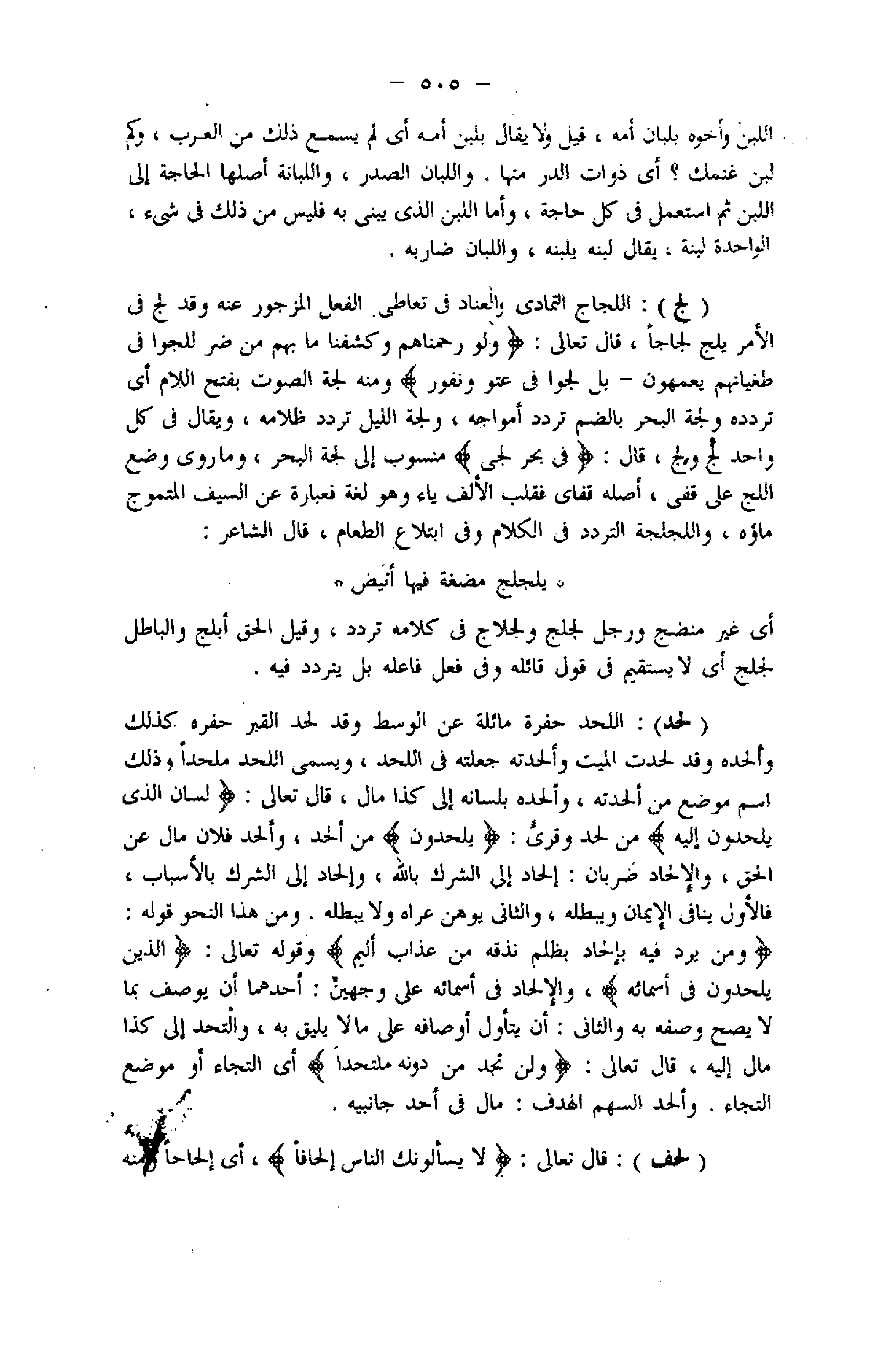 (لج) : اللجاج التمادي والعناد فى تعاطى الفعل المزجور عنه وقد لج فى الأمر يلج لجاجا، قال تعالى: وَلَوْ رَحِمْناهُمْ وَكَشَفْنا ما بِهِمْ مِنْ ضُرٍّ لَلَجُّوا فِي طُغْيانِهِمْ يَعْمَهُونَ- بَلْ لَجُّوا فِي عُتُوٍّ وَنُفُورٍ ومنه لجة الصوت بفتح اللام أي تردده ولجة البحر بالضم تردد أمواجه، ولجة الليل تردد ظلامه، ويقال فى كل واحد لج ولج، قال: فِي بَحْرٍ لُجِّيٍّ منسوب إلى لجة البحر، وما روى وضع اللج على قفى، أصله قفاى فقلب الألف ياء وهو لغة فعبارة عن السيف المتموج ماؤه، واللجلجة التردد فى الكلام وفى ابتلاع الطعام، قال الشاعر: