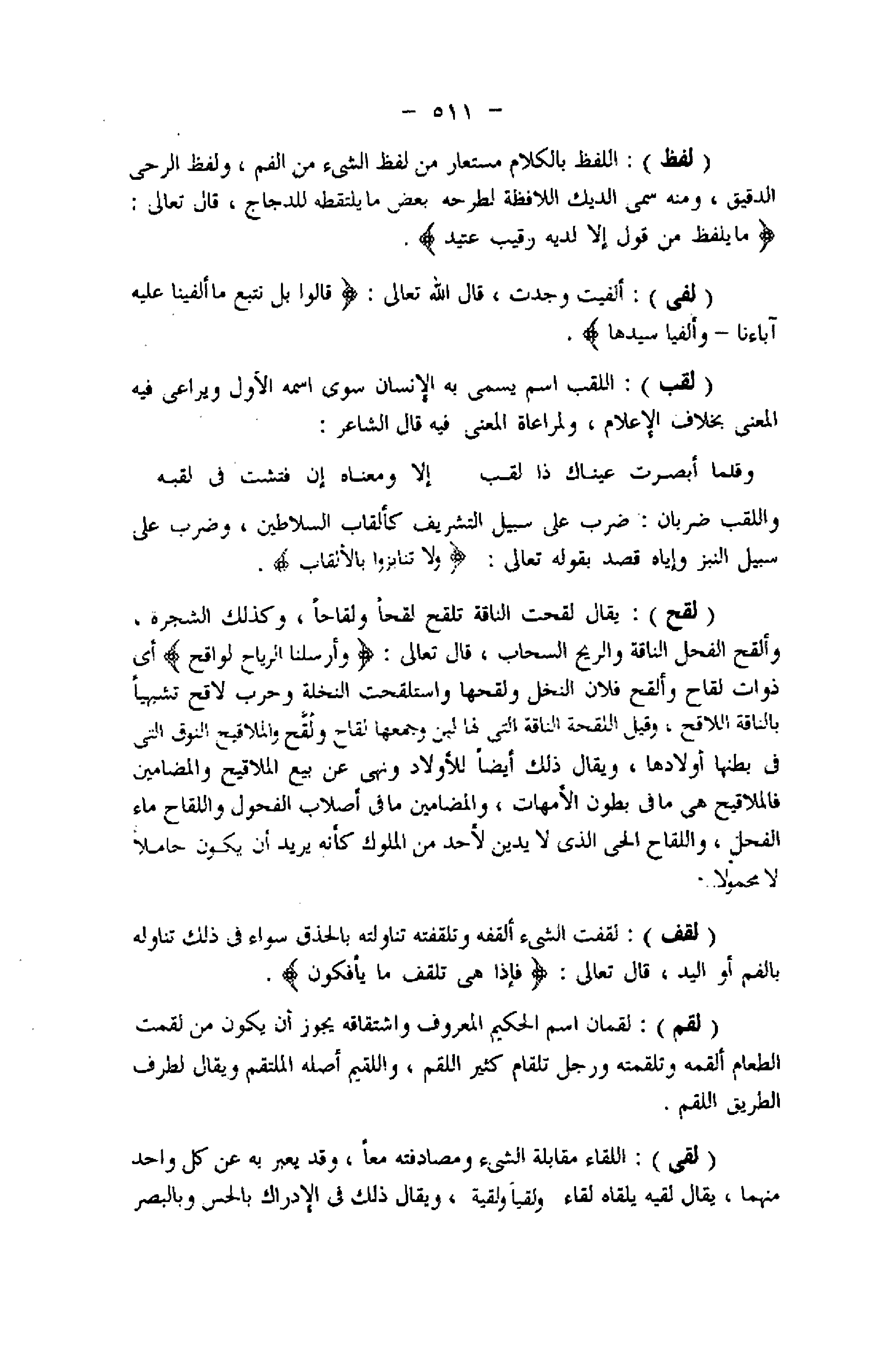 (لفظ) : اللفظ بالكلام مستعار من لفظ الشيء من الفم، ولفظ الرحى الدقيق، ومنه سمى الديك اللافظة لطرحه بعض ما يلتقطه للدجاج، قال تعالى: