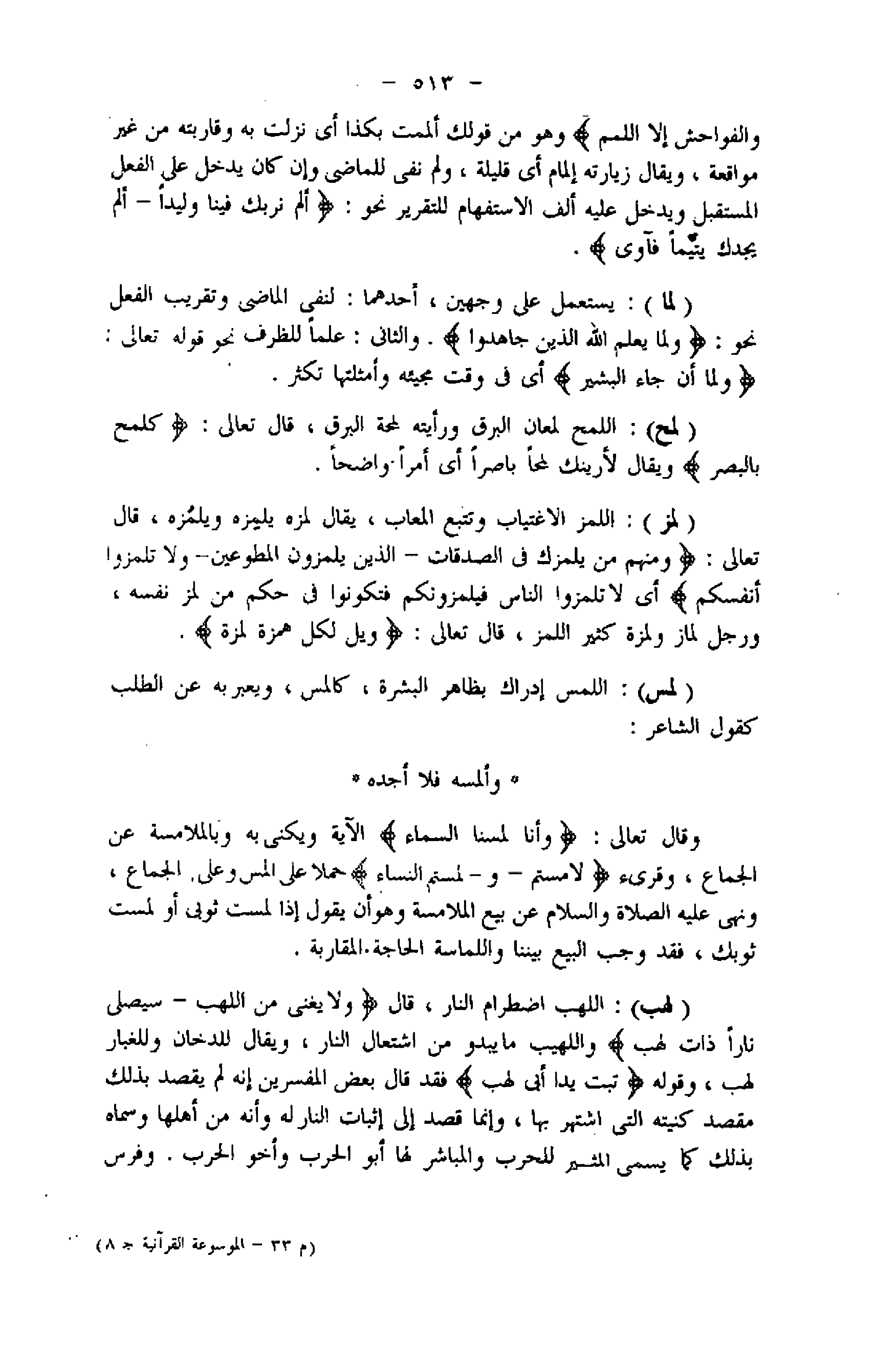 وقال تعالى: وَأَنَّا لَمَسْنَا السَّماءَ الآية ويكنى به وبالملامسة عن الجماع، وقرىء لامَسْتُمُ- وَ- لامَسْتُمُ النِّساءَ حملا على المس وعلى الجماع، ونهى عليه الصلاة والسلام عن بيع الملامسة وهو أن يقول إذا لمست ثوبى أو لمست ثوبك، فقد وجب البيع بيننا واللماسة الحاجة. المقاربة.