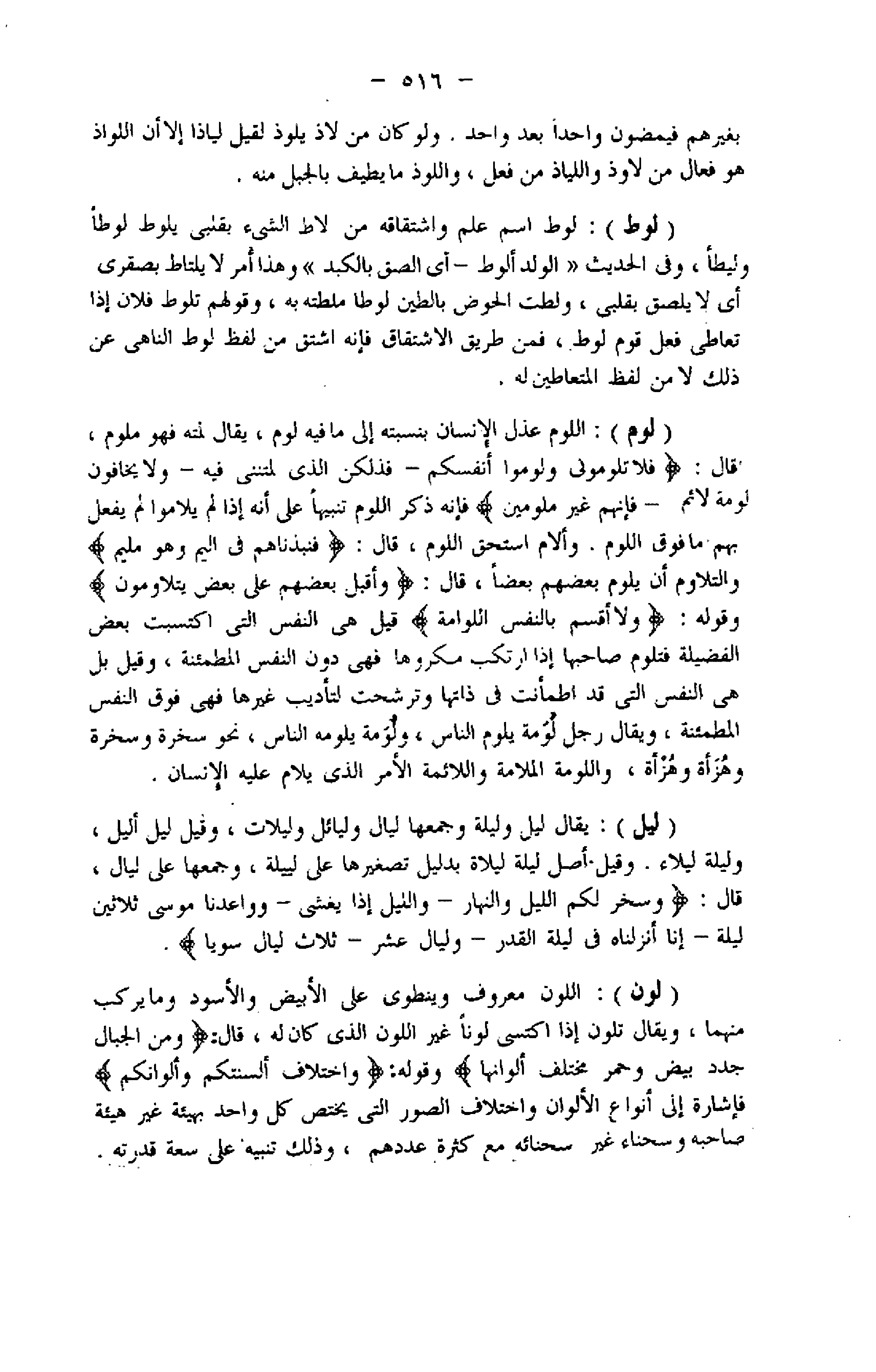 (ليل) : يقال ليل وليلة وجمعها ليال وليائل وليلات، وقيل ليل أليل، وليلة ليلاء. وقيل أصل ليلة ليلاة بدليل تصغيرها على لييلة، وجمعها على ليال، قال: وَسَخَّرَ لَكُمُ اللَّيْلَ وَالنَّهارَ- وَاللَّيْلِ إِذا يَغْشى - وَواعَدْنا مُوسى ثَلاثِينَ لَيْلَةً- إِنَّا أَنْزَلْناهُ فِي لَيْلَةِ الْقَدْرِ- وَلَيالٍ عَشْرٍ- ثَلاثَ لَيالٍ سَوِيًّا.
