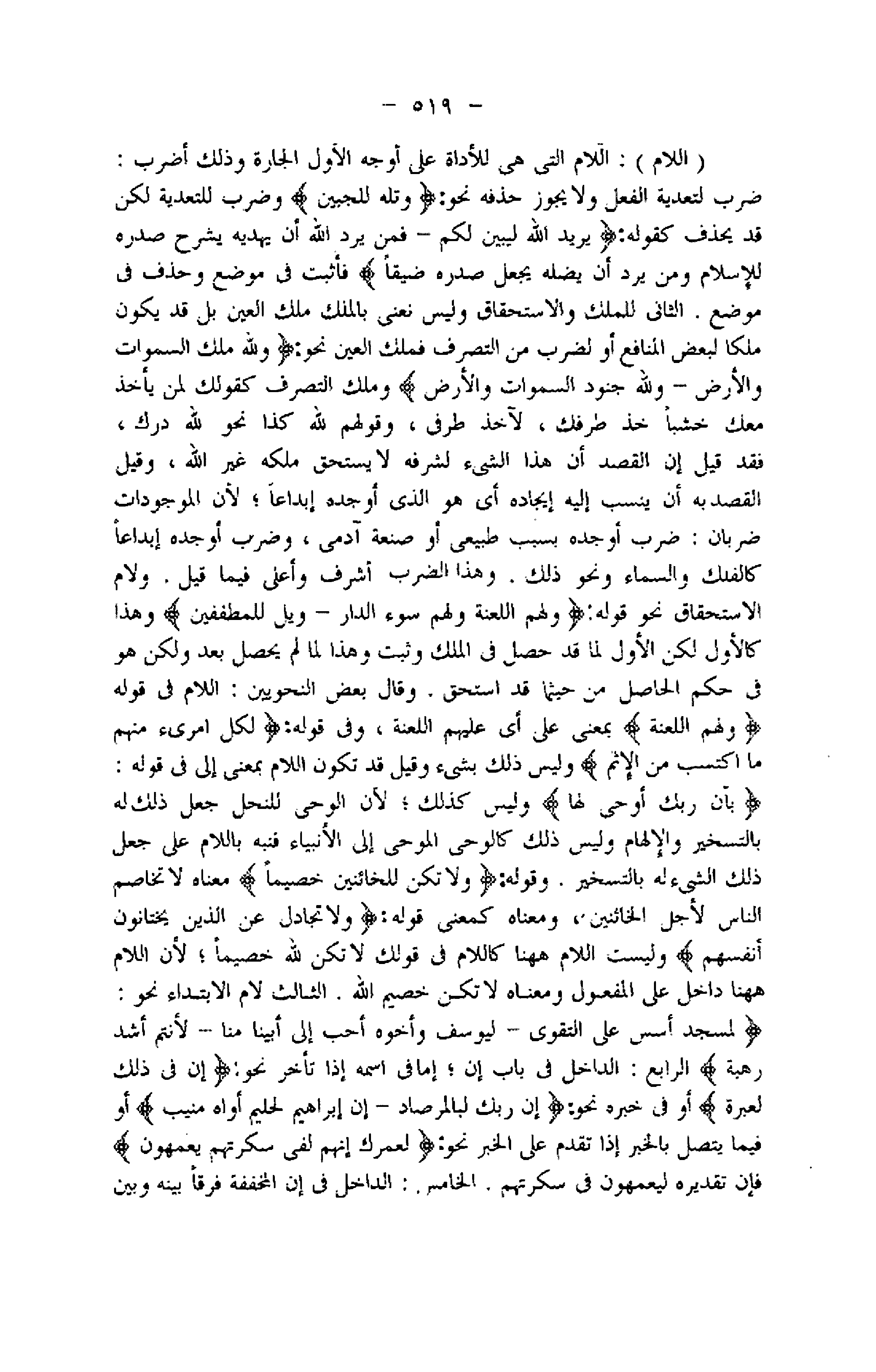 ضرب لتعدية الفعل ولا يجوز حذفه نحو: وَتَلَّهُ لِلْجَبِينِ وضرب للتعدية لكن قد يحذف كقوله: يُرِيدُ اللَّهُ لِيُبَيِّنَ لَكُمْ- فَمَنْ يُرِدِ اللَّهُ أَنْ يَهْدِيَهُ يَشْرَحْ صَدْرَهُ لِلْإِسْلامِ وَمَنْ يُرِدْ أَنْ يُضِلَّهُ يَجْعَلْ صَدْرَهُ ضَيِّقاً فأثبت فى موضع وحذف فى موضع. الثاني للملك والاستحقاق وليس نعنى بالملك ملك العين بل قد يكون ملكا لبعض المنافع أو لضرب من التصرف فملك العين نحو: وَلِلَّهِ مُلْكُ السَّماواتِ وَالْأَرْضِ- وَلِلَّهِ جُنُودُ السَّماواتِ وَالْأَرْضِ وملك التصرف كقولك لمن يأخذ معك خشبا خذ طرفك، لآخذ طرفى، وقولهم للَّه كذا نحو للَّه درك، فقد قيل إن القصد أن هذا الشيء لشرفه لا يستحق ملكه غير اللَّه، وقيل القصد به أن ينسب إليه إيجاده أي هو الذي أوجده إبداعا لأن الموجودات ضربان: ضرب أوجده بسبب طبيعى أو صنعة آدمي، وضرب أوجده إبداعا كالفلك والسماء ونحو ذلك. وهذا الضرب أشرف وأعلى فيما قيل. ولام الاستحقاق نحو قوله: وَلَهُمُ اللَّعْنَةُ وَلَهُمْ سُوءُ الدَّارِ- وَيْلٌ لِلْمُطَفِّفِينَ وهذا كالأول لكن الأول لما قد حصل فى الملك وثبت وهذا لما لم يحصل بعد ولكن هو فى حكم الحاصل من حيثما قد استحق. وقال بعض النحويين: اللام فى قوله: