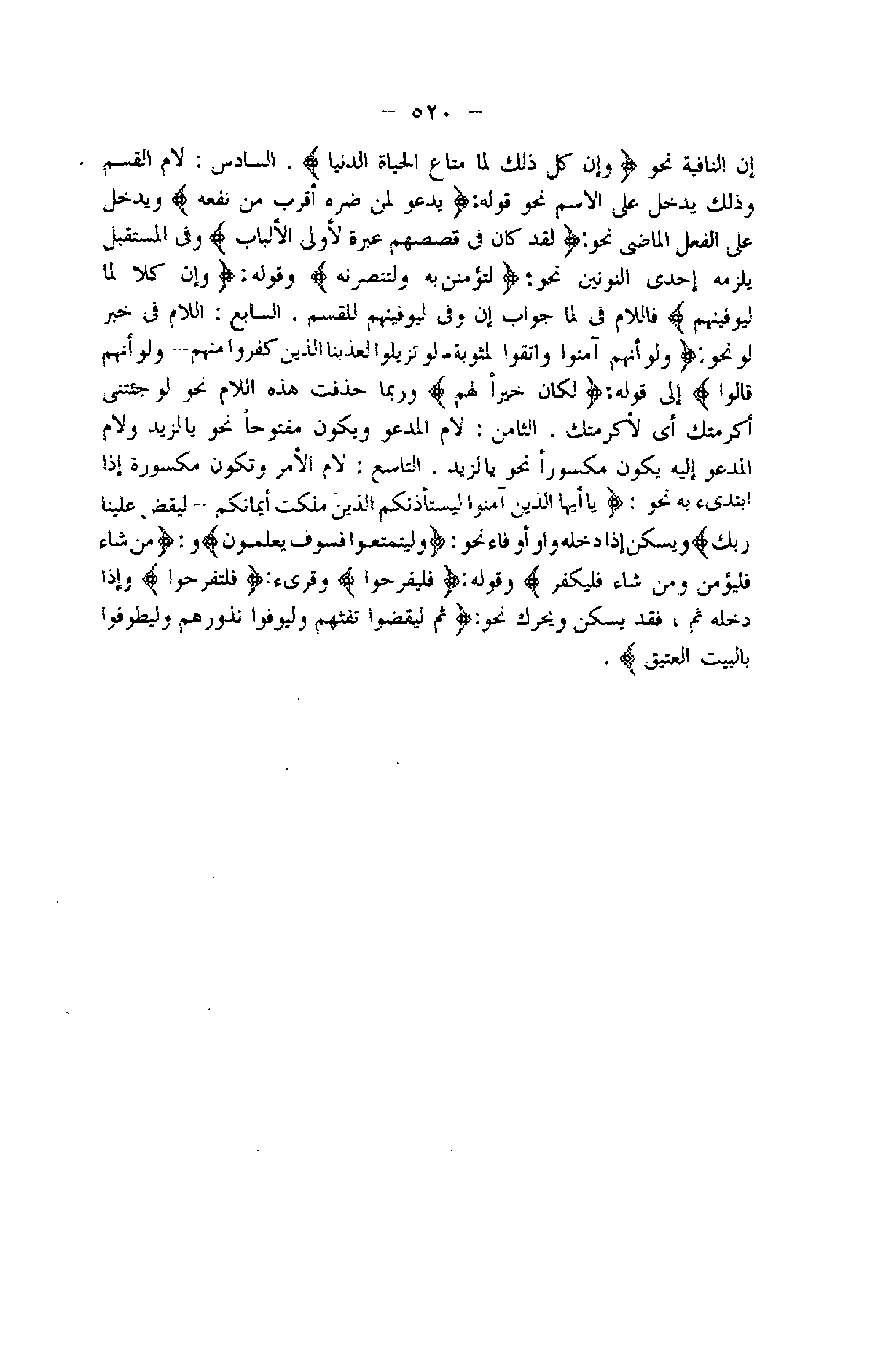 إن النافية نحو وَإِنْ كُلُّ ذلِكَ لَمَّا مَتاعُ الْحَياةِ الدُّنْيا. السادس: لام القسم وذلك يدخل على الاسم نحو قوله: يَدْعُوا لَمَنْ ضَرُّهُ أَقْرَبُ مِنْ نَفْعِهِ ويدخل على الفعل الماضي نحو: لَقَدْ كانَ فِي قَصَصِهِمْ عِبْرَةٌ لِأُولِي الْأَلْبابِ وفى المستقبل يلزمه إحدى النونين نحو: لَتُؤْمِنُنَّ بِهِ وَلَتَنْصُرُنَّهُ وقوله: وَإِنَّ كُلًّا لَمَّا لَيُوَفِّيَنَّهُمْ فاللام فى لما جواب إن وفى ليوفينهم للقسم. السابع: اللام فى خبر لو نحو: وَلَوْ أَنَّهُمْ آمَنُوا وَاتَّقَوْا لَمَثُوبَةٌ- لَوْ تَزَيَّلُوا لَعَذَّبْنَا الَّذِينَ كَفَرُوا مِنْهُمْ- وَلَوْ أَنَّهُمْ قالُوا إلى قوله: لَكانَ خَيْراً لَهُمْ وربما حذفت هذه اللام نحو لو جئتنى أكرمتك أي لأكرمتك. الثامن: لام المدعو ويكون مفتوحا نحو يا لزيد ولام المدعو إليه يكون مكسورا نحو يا لزيد. التاسع: لام الأمر وتكون مكسورة إذا ابتدئ به نحو: يا أَيُّهَا الَّذِينَ آمَنُوا لِيَسْتَأْذِنْكُمُ الَّذِينَ مَلَكَتْ أَيْمانُكُمْ- لِيَقْضِ عَلَيْنا رَبُّكَ ويسكن إذا دخله واو أو فاء نحو: وَلِيَتَمَتَّعُوا فَسَوْفَ يَعْلَمُونَ و: فَمَنْ شاءَ فَلْيُؤْمِنْ وَمَنْ شاءَ فَلْيَكْفُرْ وقوله: فَلْيَفْرَحُوا وقرىء: (فلتفرحوا) وإذا دخله ثم، فقد يسكن ويحرك نحو: ثُمَّ لْيَقْضُوا تَفَثَهُمْ وَلْيُوفُوا نُذُورَهُمْ وَلْيَطَّوَّفُوا بِالْبَيْتِ الْعَتِيقِ.