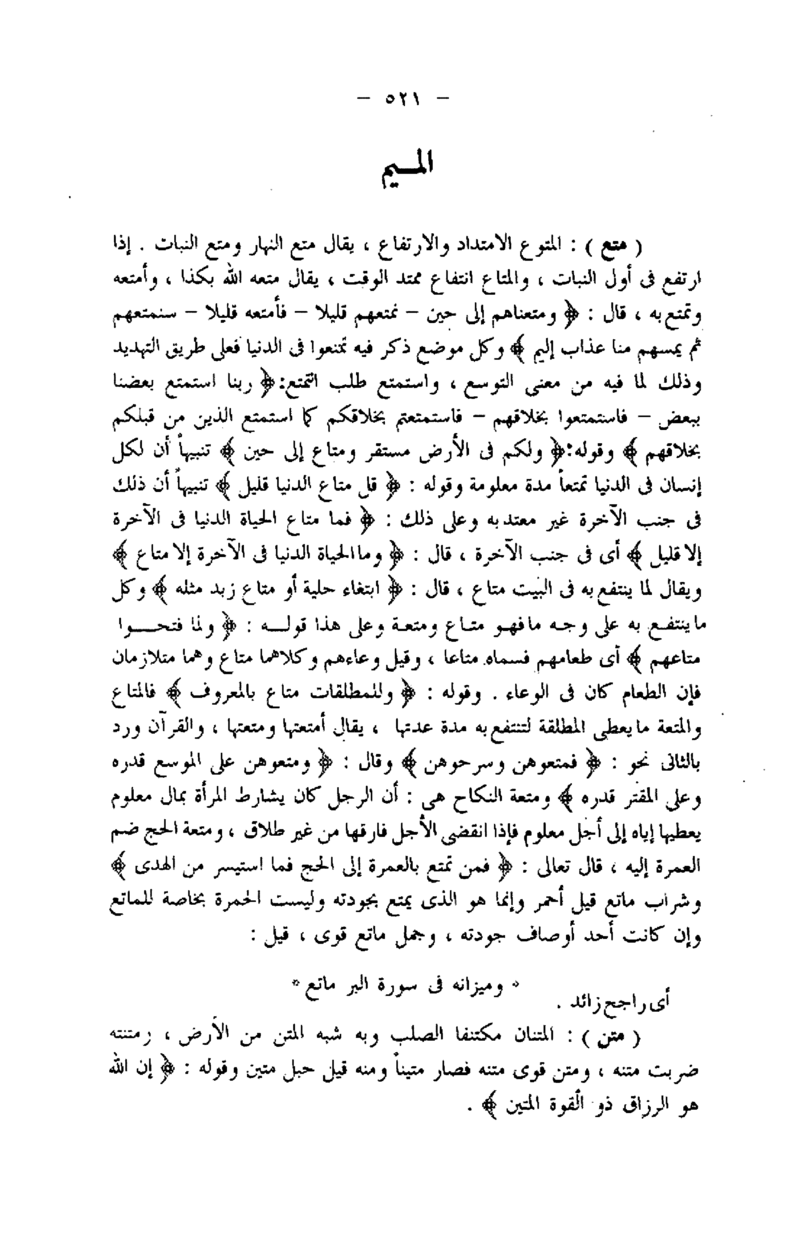 (متع) : المتوع الامتداد والارتفاع، يقال متع النهار ومتع النبات. إذا ارتفع فى أول النبات، والمتاع انتفاع ممتد الوقت، يقال متعه اللَّه بكذا، وأمتعه وتمتع به، قال: وَمَتَّعْناهُمْ إِلى حِينٍ- نُمَتِّعُهُمْ قَلِيلًا- فَأُمَتِّعُهُ قَلِيلًا- سَنُمَتِّعُهُمْ ثُمَّ يَمَسُّهُمْ مِنَّا عَذابٌ أَلِيمٌ وكل موضع ذكر فيه تمنعوا فى الدنيا فعلى طريق التهديد وذلك لما فيه من معنى التوسع، واستمتع طلب التمتع: رَبَّنَا اسْتَمْتَعَ بَعْضُنا بِبَعْضٍ- فَاسْتَمْتَعُوا بِخَلاقِهِمْ- فَاسْتَمْتَعْتُمْ بِخَلاقِكُمْ كَمَا اسْتَمْتَعَ الَّذِينَ مِنْ قَبْلِكُمْ بِخَلاقِهِمْ وقوله: وَلَكُمْ فِي الْأَرْضِ مُسْتَقَرٌّ وَمَتاعٌ إِلى حِينٍ تنبيها أن لكل إنسان فى الدنيا تمتعا مدة معلومة وقوله: قُلْ مَتاعُ الدُّنْيا قَلِيلٌ تنبيها أن ذلك فى جنب الآخرة غير معتد به وعلى ذلك: فَما مَتاعُ الْحَياةِ الدُّنْيا فِي الْآخِرَةِ إِلَّا قَلِيلٌ أي فى جنب الآخرة، قال: وَمَا الْحَياةُ الدُّنْيا فِي الْآخِرَةِ إِلَّا مَتاعٌ ويقال لما ينتفع به فى البيت متاع، قال: ابْتِغاءَ حِلْيَةٍ أَوْ مَتاعٍ زَبَدٌ مِثْلُهُ وكل ما ينتفع به على وجه ما فهو متاع ومتعة وعلى هذا قوله: وَلَمَّا فَتَحُوا مَتاعَهُمْ أي طعامهم فسماه متاعا، وقيل وعاءهم وكلاهما متاع وهما متلازمان فإن الطعام كان فى الوعاء. وقوله: وَلِلْمُطَلَّقاتِ مَتاعٌ بِالْمَعْرُوفِ فالمتاع والمتعة ما يعطى المطلقة لتنتفع به مدة عدتها، يقال أمتعتها ومتعتها، والقرآن ورد بالثاني نحو: فَمَتِّعُوهُنَّ وَسَرِّحُوهُنَّ وقال: وَمَتِّعُوهُنَّ عَلَى الْمُوسِعِ قَدَرُهُ وَعَلَى الْمُقْتِرِ قَدَرُهُ ومتعة النكاح هى: أن الرجل كان يشارط المرأة بمال معلوم يعطيها إياه إلى أجل معلوم فإذا انقضى الأجل فارقها من غير طلاق، ومتعة الحج ضم العمرة إليه، قال تعالى: فَمَنْ تَمَتَّعَ بِالْعُمْرَةِ إِلَى الْحَجِّ فَمَا اسْتَيْسَرَ مِنَ الْهَدْيِ وشراب ماتع قيل أحمر وإنما هو الذي يمتع بجودته وليست الحمرة بخاصة للماتع وإن كانت أحد أوصاف جودته، وجمل ماتع قوى، قيل: