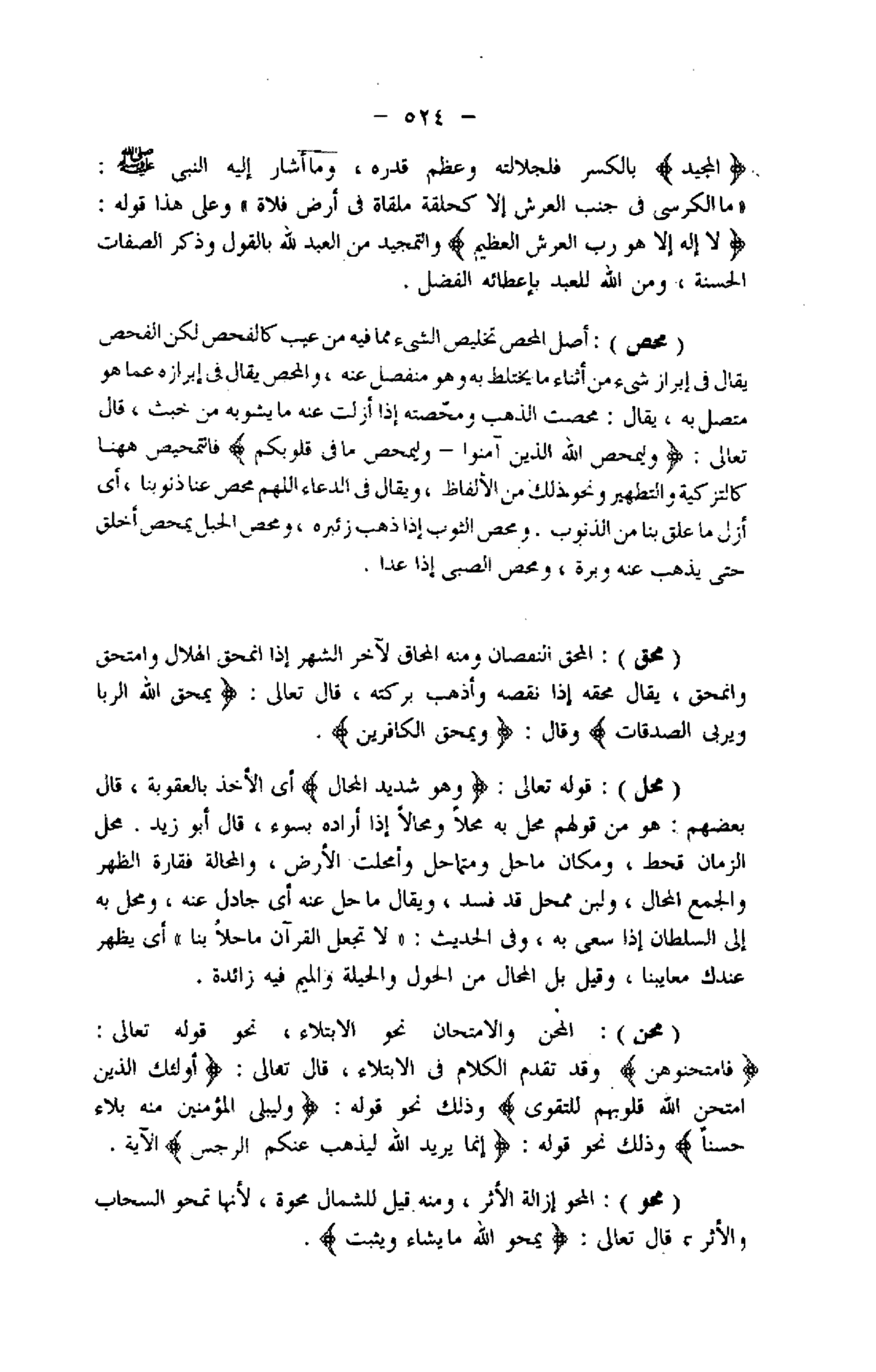 (محص) : أصل المحص تخليص الشيء مما فيه من عيب كالفحص لكن الفحص يقال فى إبراز شىء من أثناء ما يختلط به وهو منفصل عنه، والمحص يقال فى إبرازه عما هو متصل به، يقال: محصت الذهب ومحّصته إذا أزلت عنه ما يشوبه من خبث، قال تعالى: وَلِيُمَحِّصَ اللَّهُ الَّذِينَ آمَنُوا- وَلِيُمَحِّصَ ما فِي قُلُوبِكُمْ فالتمحيص هاهنا كالتزكية والتطهير ونحو ذلك من الألفاظ، ويقال فى الدعاء اللهم محص عنا ذنوبنا، أي أزل ما علق بنا من الذنوب. ومحص الثوب إذا ذهب زئبره، ومحص الحبل يمحص أخلق حتى يذهب عنه وبرة، ومحص الصبى إذا عدا.