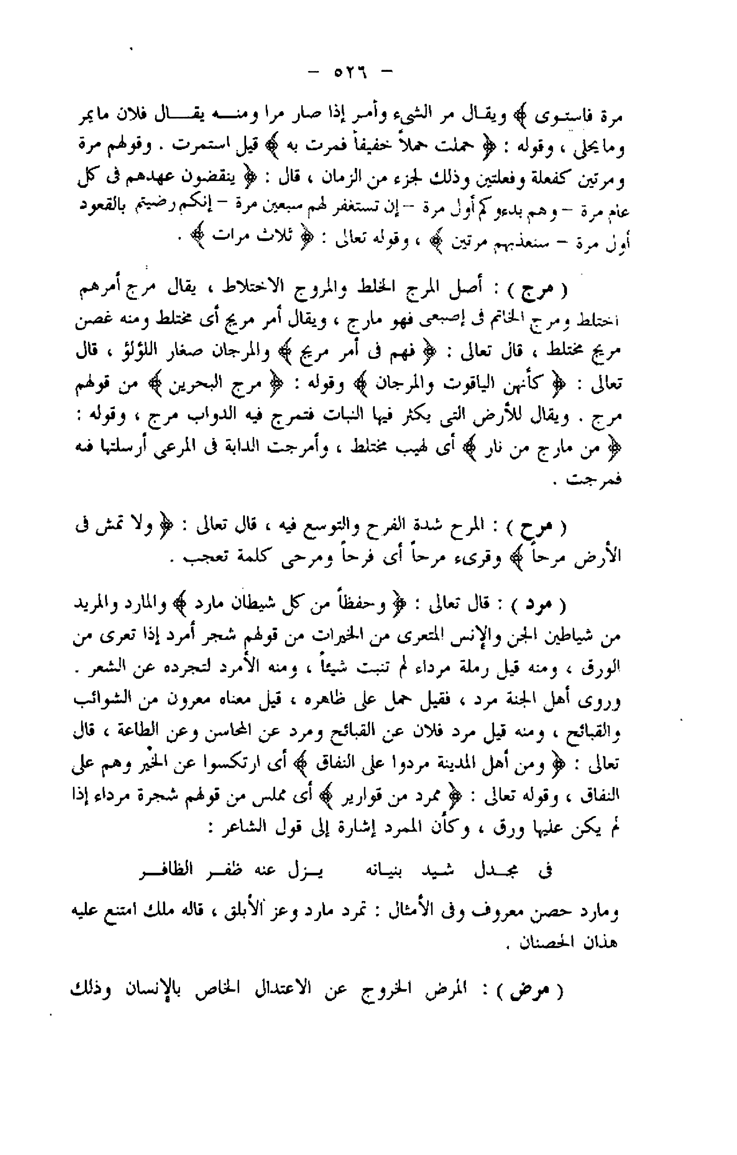 ويقال مر الشيء وأمر إذا صار مرا ومنه يقال فلان ما يمر وما يحلى، وقوله: حَمَلَتْ حَمْلًا خَفِيفاً فَمَرَّتْ بِهِ قيل استمرت. وقولهم مرة ومرتين كفعلة وفعلتين وذلك لجزء من الزمان، قال: يَنْقُضُونَ عَهْدَهُمْ فِي كُلِّ مَرَّةٍ- وَهُمْ بَدَؤُكُمْ أَوَّلَ مَرَّةٍ- إِنْ تَسْتَغْفِرْ لَهُمْ سَبْعِينَ مَرَّةً- إِنَّكُمْ رَضِيتُمْ بِالْقُعُودِ أَوَّلَ مَرَّةٍ- سَنُعَذِّبُهُمْ مَرَّتَيْنِ، وقوله تعالى: ثَلاثَ مَرَّاتٍ.
