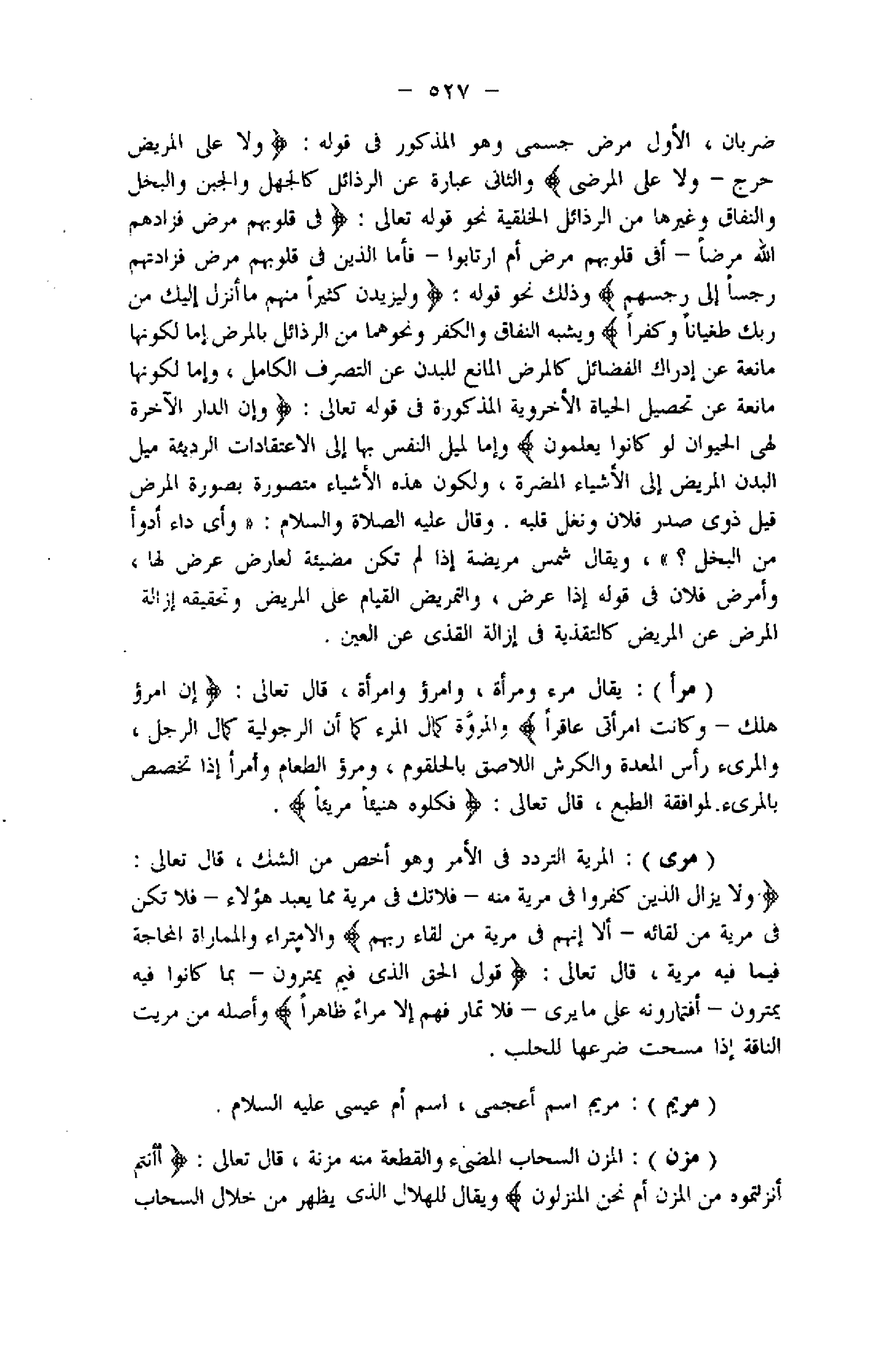 ضربان، الأول مرض جسمى وهو المذكور فى قوله: وَلا عَلَى الْمَرِيضِ حَرَجٌ- وَلا عَلَى الْمَرْضى والثاني عبارة عن الرذائل كالجهل والجبن والبخل والنفاق وغيرها من الرذائل الخلقية نحو قوله تعالى: فِي قُلُوبِهِمْ مَرَضٌ فَزادَهُمُ اللَّهُ مَرَضاً- أَفِي قُلُوبِهِمْ مَرَضٌ أَمِ ارْتابُوا- وَأَمَّا الَّذِينَ فِي قُلُوبِهِمْ مَرَضٌ فَزادَتْهُمْ رِجْساً إِلَى رِجْسِهِمْ وذلك نحو قوله: وَلَيَزِيدَنَّ كَثِيراً مِنْهُمْ ما أُنْزِلَ إِلَيْكَ مِنْ رَبِّكَ طُغْياناً وَكُفْراً ويشبه النفاق والكفر ونحوهما من الرذائل بالمرض إما لكونها مانعة عن إدراك الفضائل كالمرض المانع للبدن عن التصرف الكامل، وإما لكونها مانعة عن تحصيل الحياة الأخروية المذكورة فى قوله تعالى: وَإِنَّ الدَّارَ الْآخِرَةَ لَهِيَ الْحَيَوانُ لَوْ كانُوا يَعْلَمُونَ وإما لميل النفس بها إلى الاعتقادات الرديئة ميل البدن المريض إلى الأشياء المضرة، ولكون هذه الأشياء متصورة بصورة المرض قيل ذوى صدر فلان ونغل قلبه.