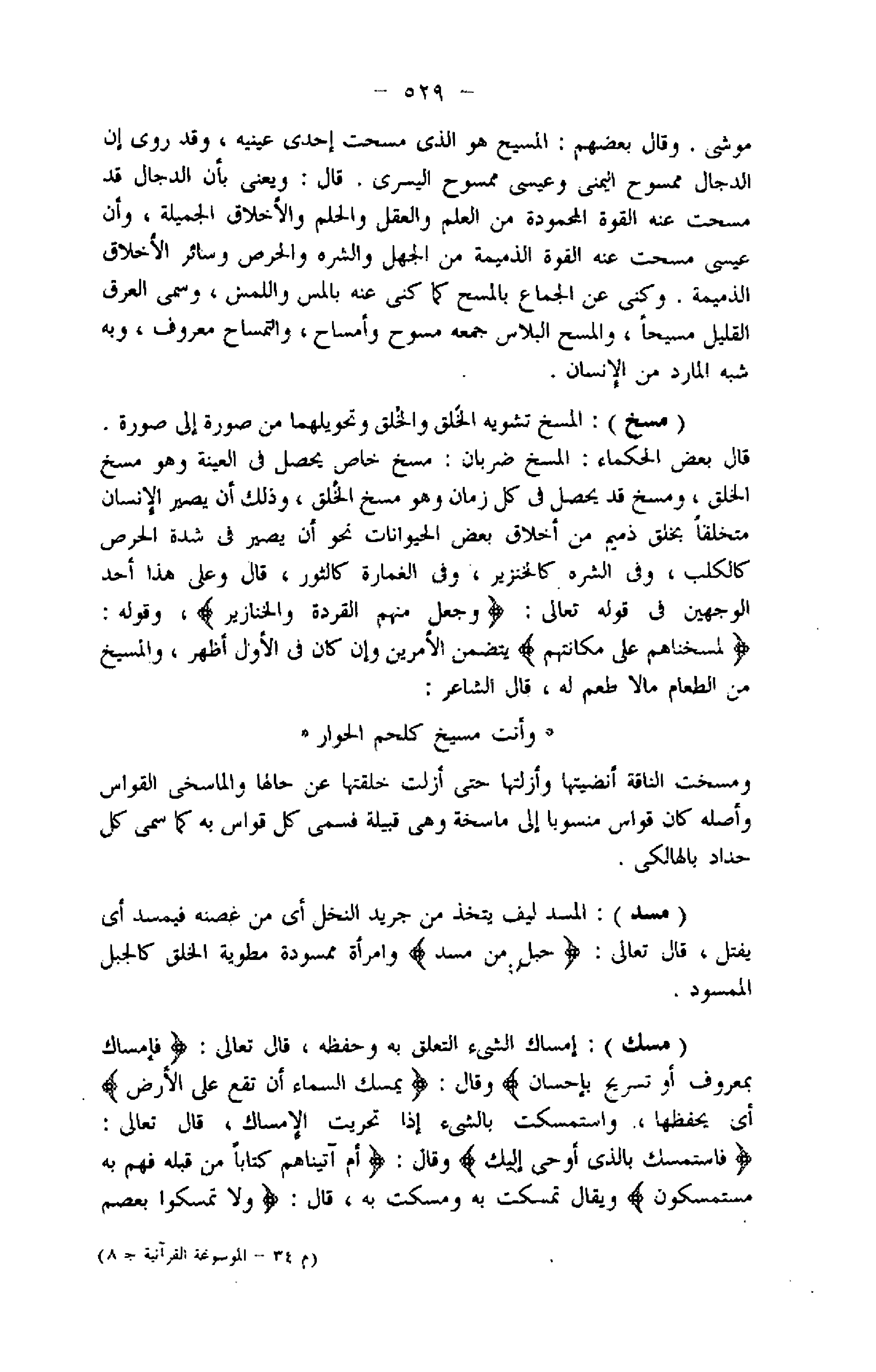 موشى. وقال بعضهم: المسيح هو الذي مسحت إحدى عينيه، وقد روى إن الدجال ممسوح اليمنى وعيسى ممسوح اليسرى. قال: ويعنى بأن الدجال قد مسحت عنه القوة المحمودة من العلم والعقل والحلم والأخلاق الجميلة، وأن عيسى مسحت عنه القوة الذميمة من الجهل والشره والحرص وسائر الأخلاق الذميمة. وكنى عن الجماع بالمسح كما كنى عنه بالمس واللمس، وسمى العرق القليل مسيحا، والمسح البلاس جمعه مسوح وأمساح، والتمساح معروف، وبه شبه المارد من الإنسان.