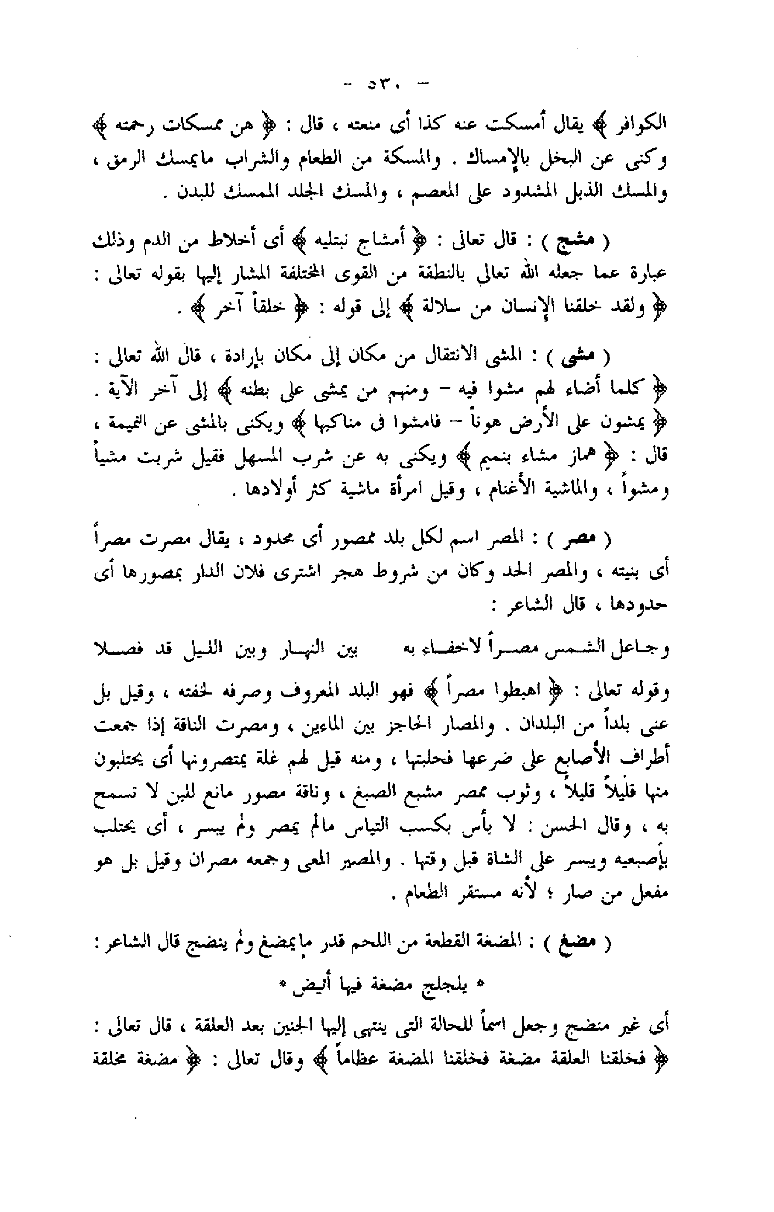 وقوله تعالى: اهْبِطُوا مِصْراً فهو البلد المعروف وصرفه لخفته، وقيل بل عنى بلدا من البلدان. والمصار الحاجز بين الماءين، ومصرت الناقة إذا جمعت أطراف الأصابع على ضرعها فحلبتها، ومنه قيل لهم غلة يمتصرونها أي يحتلبون منها قليلا قليلا، وثوب ممصر مشبع الصبغ، وناقة مصور مانع للبن لا تسمح به، وقال الحسن: لا بأس بكسب التياس ما لم يمصر ولم يبسر، أي يحتلب بإصبعيه ويبسر على الشاة قبل وقتها. والمصير المعى وجمعه مصران وقيل بل هو مفعل من صار لأنه مستقر الطعام.