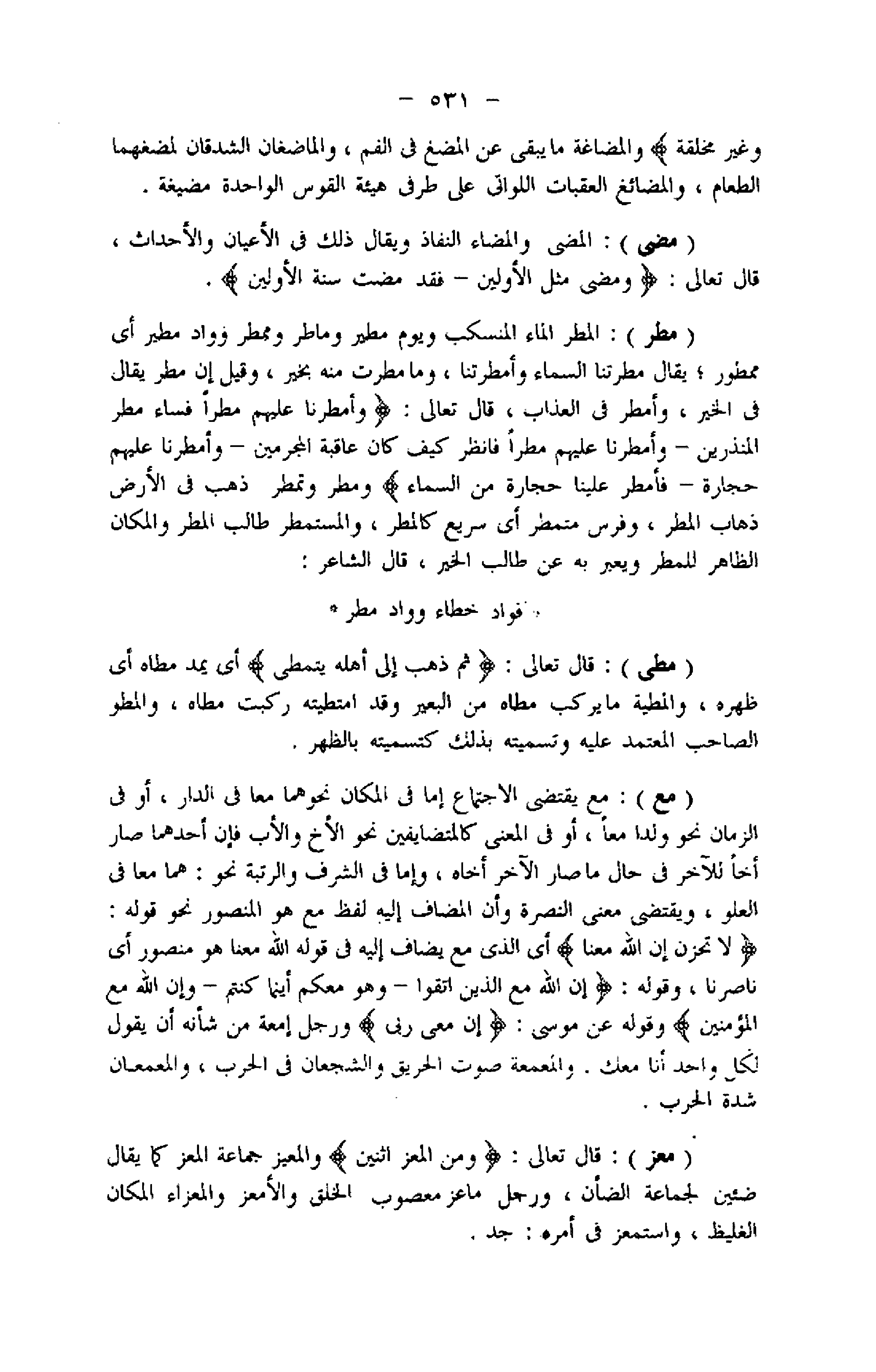 (مطر) : المطر الماء المنسكب ويوم مطير وماطر وممطر وواد مطير أي ممطور يقال مطرتنا السماء وأمطرتنا، وما مطرت منه بخير، وقيل إن مطر يقال فى الخير، وأمطر فى العذاب، قال تعالى: وَأَمْطَرْنا عَلَيْهِمْ مَطَراً فَساءَ مَطَرُ الْمُنْذَرِينَ- وَأَمْطَرْنا عَلَيْهِمْ مَطَراً فَانْظُرْ كَيْفَ كانَ عاقِبَةُ الْمُجْرِمِينَ- وَأَمْطَرْنا عَلَيْهِمْ حِجارَةً- فَأَمْطِرْ عَلَيْنا حِجارَةً مِنَ السَّماءِ ومطر وتمطر ذهب فى الأرض ذهاب المطر، وفرس متمطر أي سريع كالمطر، والمستمطر طالب المطر والمكان الظاهر للمطر ويعبر به عن طالب الخير، قال الشاعر: