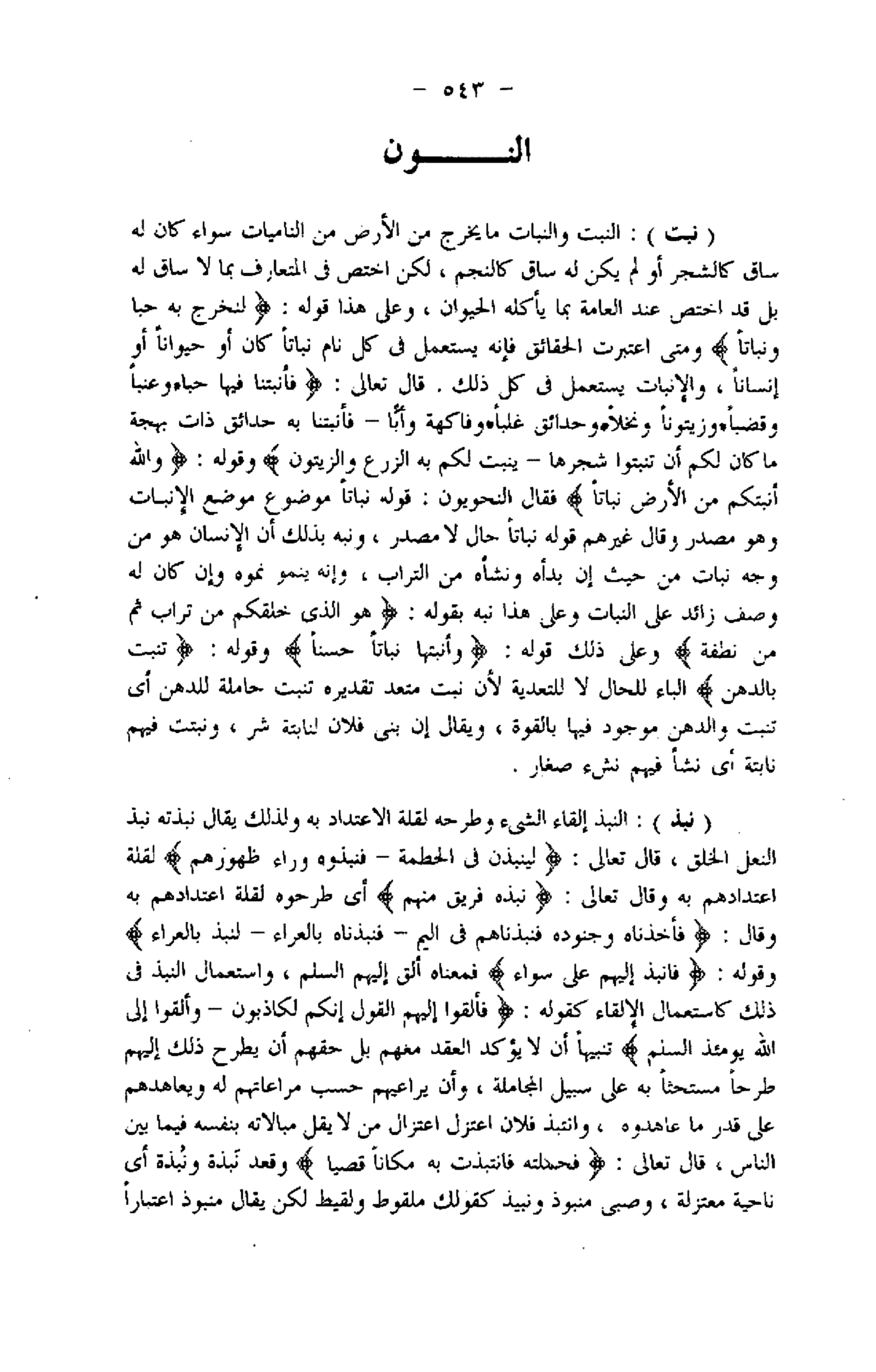 (نبت) : النبت والنبات ما يخرج من الأرض من الناميات سواء كان له ساق كالشجر أو لم يكن له ساق كالنجم، لكن اختص فى المتعارف بما لا ساق له بل قد اختص عند العامة بما يأكله الحيوان، وعلى هذا قوله: لِنُخْرِجَ بِهِ حَبًّا وَنَباتاً ومتى اعتبرت الحقائق فإنه يستعمل فى كل نام نباتا كان أو حيوانا أو إنسانا، والإنبات يستعمل فى كل ذلك. قال تعالى: فَأَنْبَتْنا فِيها حَبًّا وَعِنَباً وَقَضْباً وَزَيْتُوناً وَنَخْلًا وَحَدائِقَ غُلْباً، وَفاكِهَةً وَأَبًّا- فَأَنْبَتْنا بِهِ حَدائِقَ ذاتَ بَهْجَةٍ ما كانَ لَكُمْ أَنْ تُنْبِتُوا شَجَرَها- يُنْبِتُ لَكُمْ بِهِ الزَّرْعَ وَالزَّيْتُونَ وقوله: وَاللَّهُ أَنْبَتَكُمْ مِنَ الْأَرْضِ نَباتاً فقال النحويون: قوله نباتا موضوع موضع الإنبات وهو مصدر وقال غيرهم قوله نباتا حال لا مصدر، ونبه بذلك أن الإنسان هو من وجه نبات من حيث إن بدأه ونشأه من التراب، وإنه ينمو نموه وإن كان له وصف زائد على إنبات وعلى هذا نبه بقوله: هُوَ الَّذِي خَلَقَكُمْ مِنْ تُرابٍ ثُمَّ مِنْ نُطْفَةٍ وعلى ذلك قوله: وَأَنْبَتَها نَباتاً حَسَناً وقوله: تَنْبُتُ بِالدُّهْنِ الباء للحال لا للتعدية لأن نبت متعد تقديره تنبت حاملة للدهن أي تنبت والدهن موجود فيها بالقوة، ويقال إن بنى فلان لنابتة شر، ونبتت فيهم نابتة أي نشأ فيهم نشء صغار.