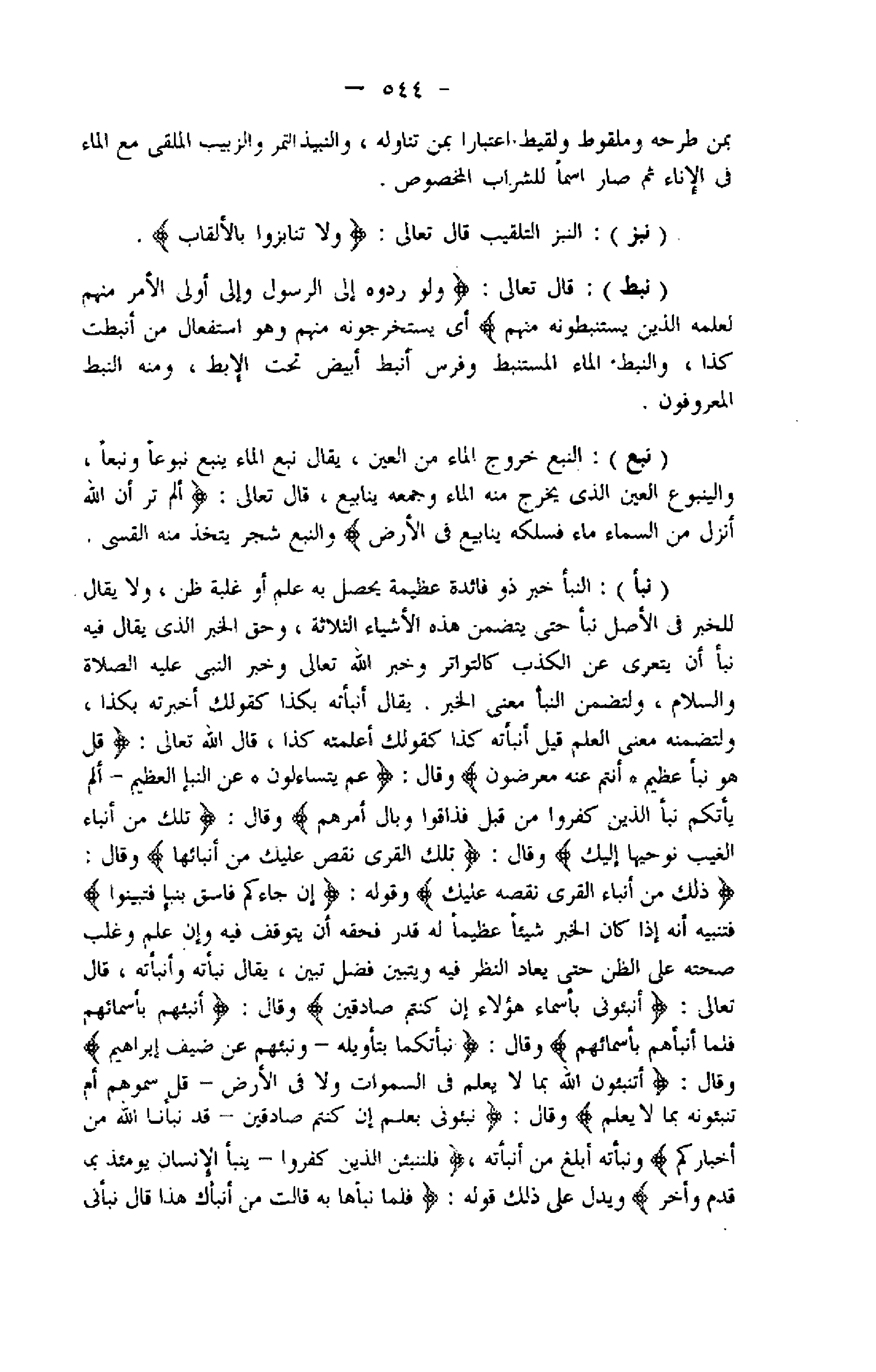 (نبأ) : النبأ خبر ذو فائدة عظيمة يحصل به علم أو غلبة ظن، ولا يقال للخبر فى الأصل نبأ حتى يتضمن هذه الأشياء الثلاثة، وحق الخبر الذي يقال فيه نبأ أن يتعرى عن الكذب كالتواتر وخبر اللَّه تعالى وخبر النبي عليه الصلاة والسلام، ولتضمن النبأ معنى الخبر. يقال أنبأته بكذا كقولك أخبرته بكذا، ولتضمنه معنى العلم قيل أنبأته كذا كقولك أعلمته كذا، قال اللَّه تعالى: قُلْ هُوَ نَبَأٌ عَظِيمٌ أَنْتُمْ عَنْهُ مُعْرِضُونَ وقال: عَمَّ يَتَساءَلُونَ عَنِ النَّبَإِ الْعَظِيمِ- أَلَمْ يَأْتِكُمْ نَبَأُ الَّذِينَ كَفَرُوا مِنْ قَبْلُ فَذاقُوا وَبالَ أَمْرِهِمْ وقال: تِلْكَ مِنْ أَنْباءِ الْغَيْبِ نُوحِيها إِلَيْكَ وقال: تِلْكَ الْقُرى نَقُصُّ عَلَيْكَ مِنْ أَنْبائِها وقال: