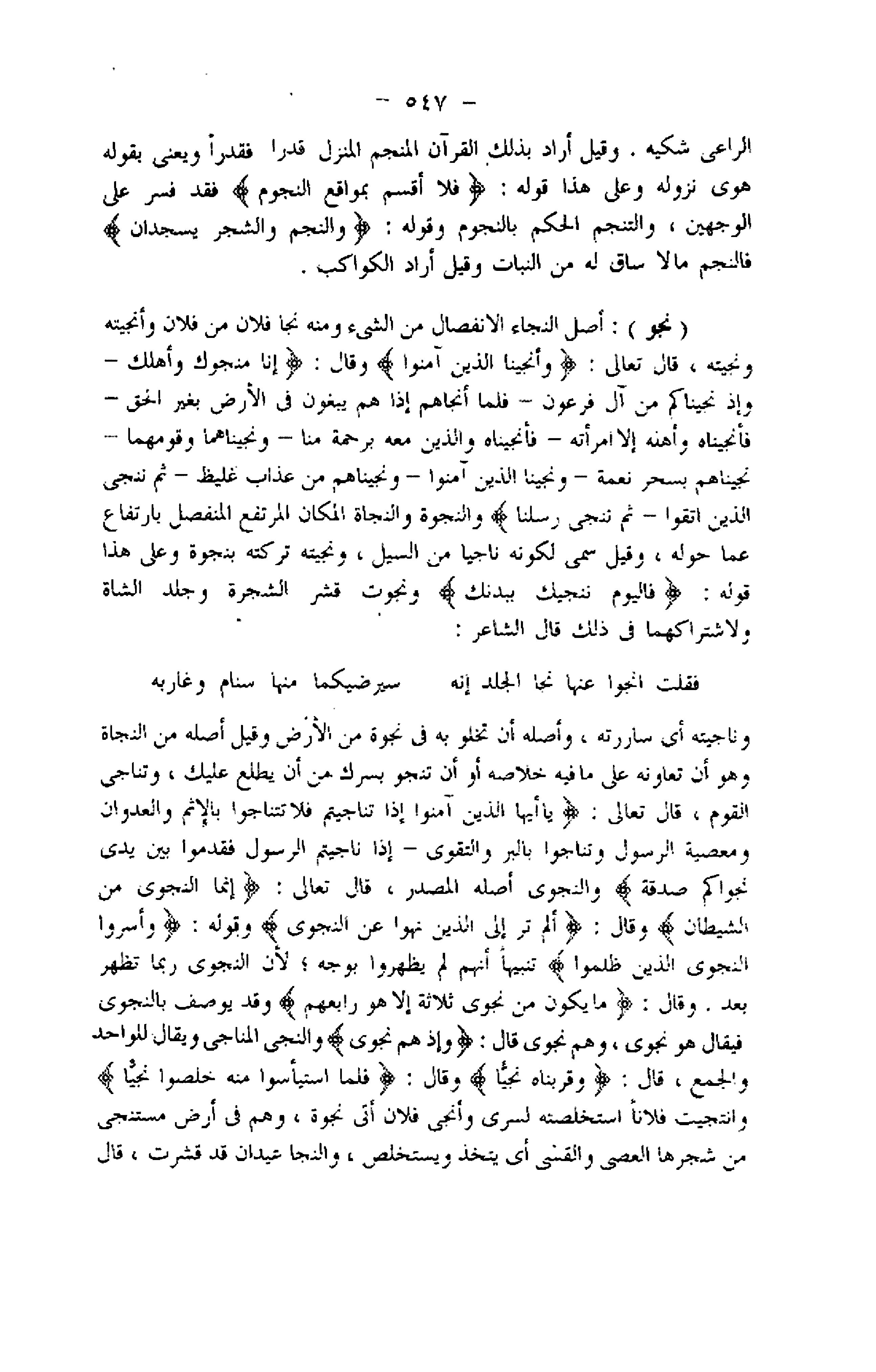 (نجو) : أصل النجاء الانفصال من الشيء ومنه نجا فلان من فلان وأنجيته ونجيته، قال تعالى: وَأَنْجَيْنَا الَّذِينَ آمَنُوا وقال: إِنَّا مُنَجُّوكَ وَأَهْلَكَ- وَإِذْ نَجَّيْناكُمْ مِنْ آلِ فِرْعَوْنَ- فَلَمَّا أَنْجاهُمْ إِذا هُمْ يَبْغُونَ فِي الْأَرْضِ بِغَيْرِ الْحَقِّ- فَأَنْجَيْناهُ وَأَهْلَهُ إِلَّا امْرَأَتَهُ- فَأَنْجَيْناهُ وَالَّذِينَ مَعَهُ بِرَحْمَةٍ مِنَّا- وَنَجَّيْناهُما وَقَوْمَهُما- نَجَّيْناهُمْ بِسَحَرٍ نِعْمَةً- وَنَجَّيْنَا الَّذِينَ آمَنُوا- وَنَجَّيْناهُمْ مِنْ عَذابٍ غَلِيظٍ- ثُمَّ نُنَجِّي الَّذِينَ اتَّقَوْا- ثُمَّ نُنَجِّي رُسُلَنا والنجوة والنجاة المكان المرتفع المفصل بارتفاع عما حوله، وقيل سمى لكونه ناجيا من السيل، ونجيته تركته بنجوة وعلى هذا قوله: فَالْيَوْمَ نُنَجِّيكَ بِبَدَنِكَ ونجوت قشر الشجرة وجلد الشاة ولاشتراكهما فى ذلك قال الشاعر: